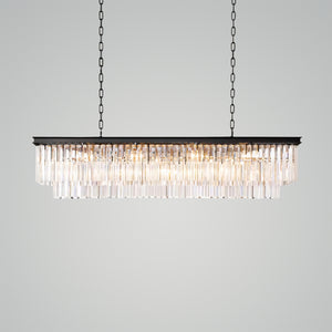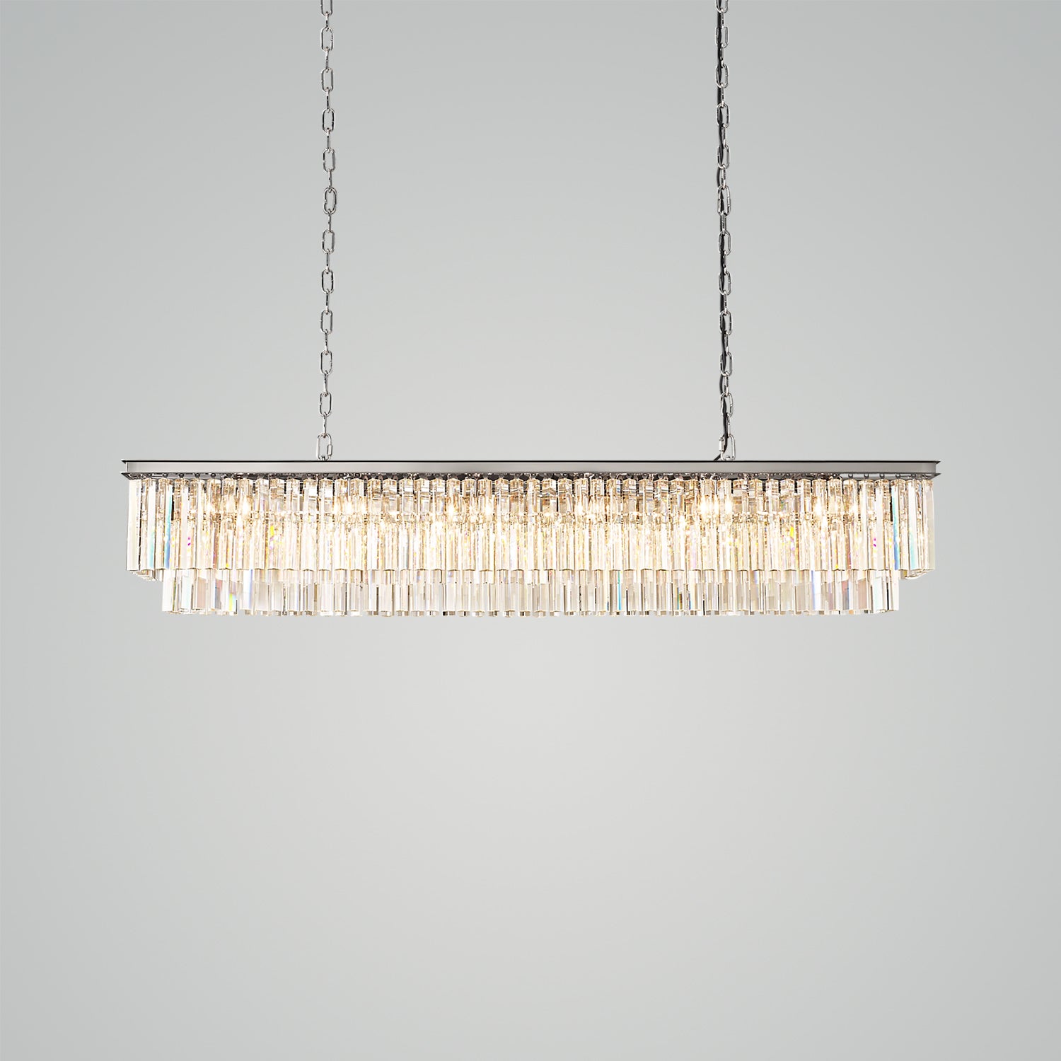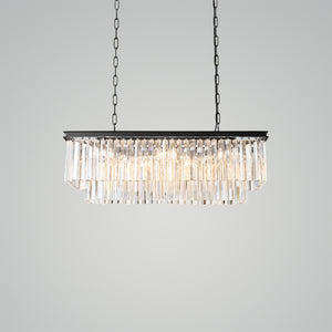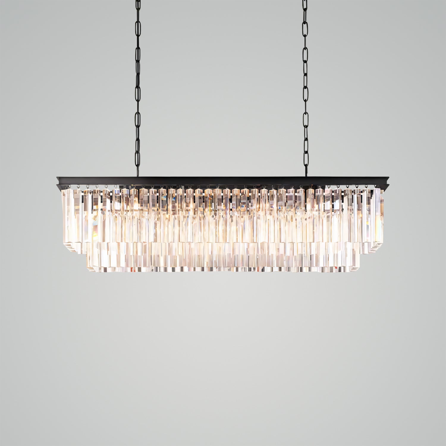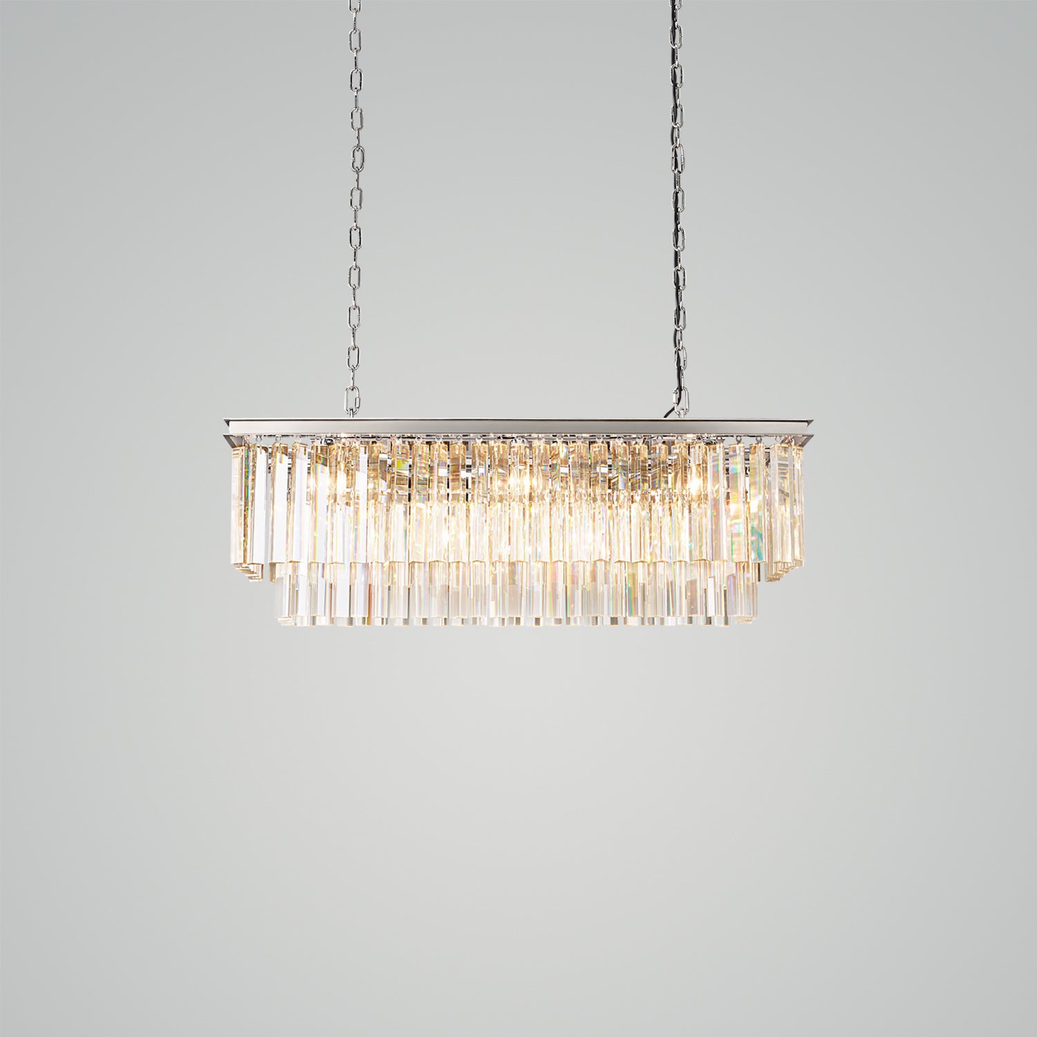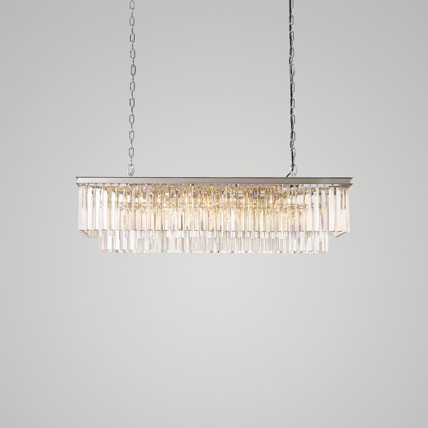 This collection is inspired by the Art Deco style of 1920s Paris, capturing the era's fascination with geometric forms. Hundreds of finely cut, dynamic prisms masterfully refract light, evoking the allure of that time. The sharp lines of the glass hang like lush fringe from a welded iron frame, juxtaposing elegance with industrialism.