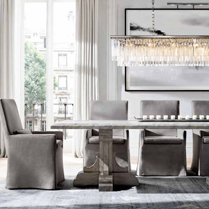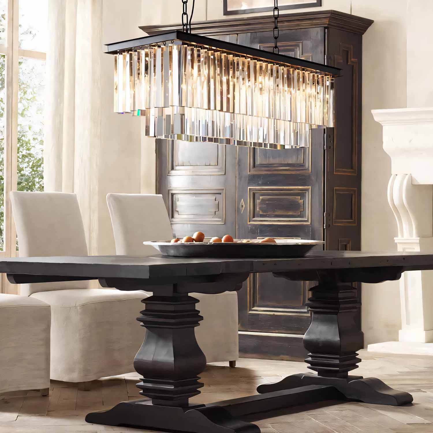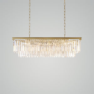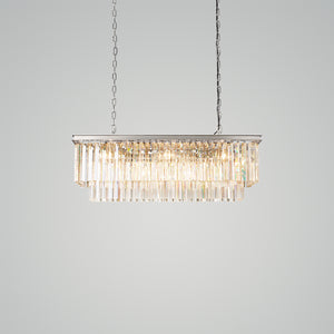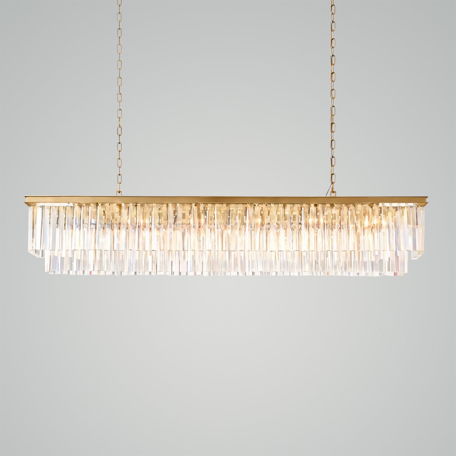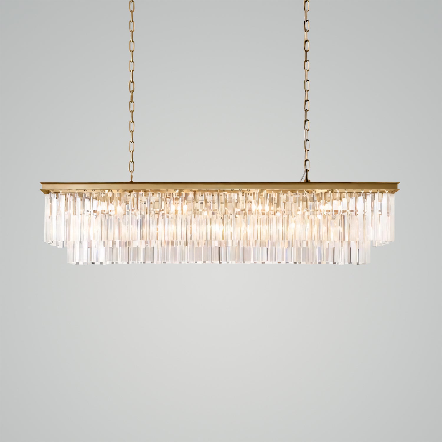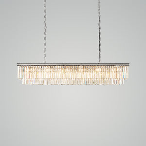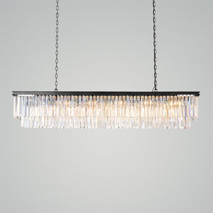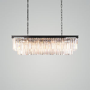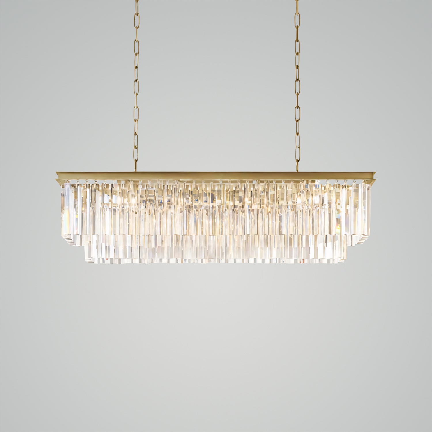 This collection is inspired by the Art Deco style of 1920s Paris, capturing the era's fascination with geometric forms. Hundreds of finely cut, dynamic prisms masterfully refract light, evoking the allure of that time. The sharp lines of the glass hang like lush fringe from a welded iron frame, juxtaposing elegance with industrialism.