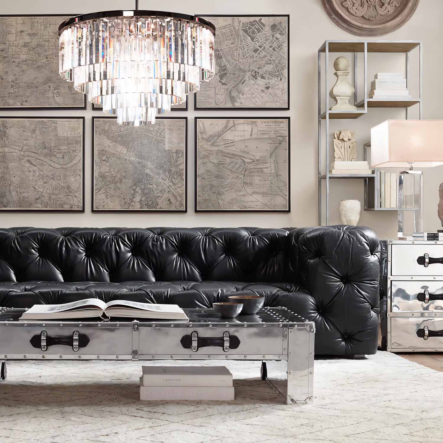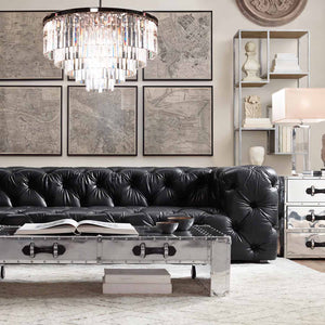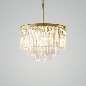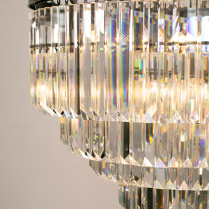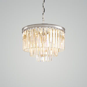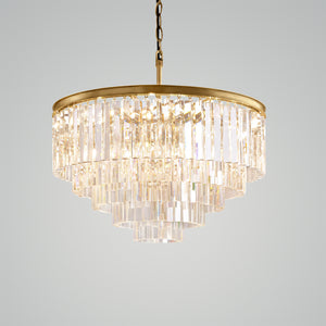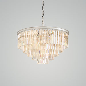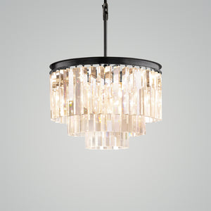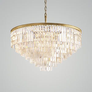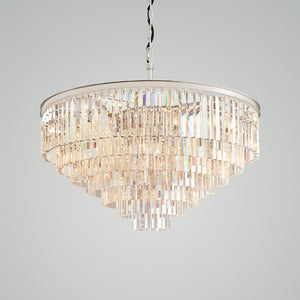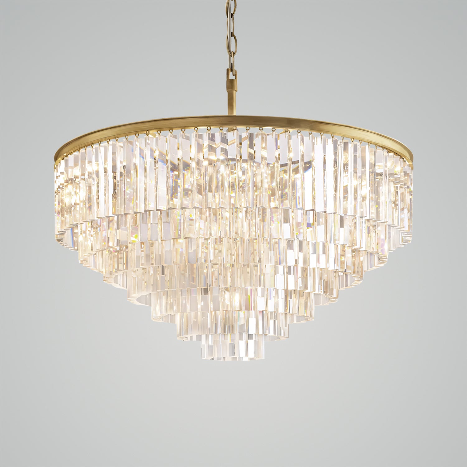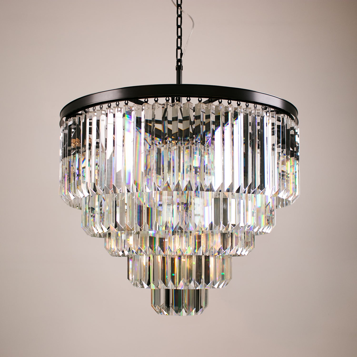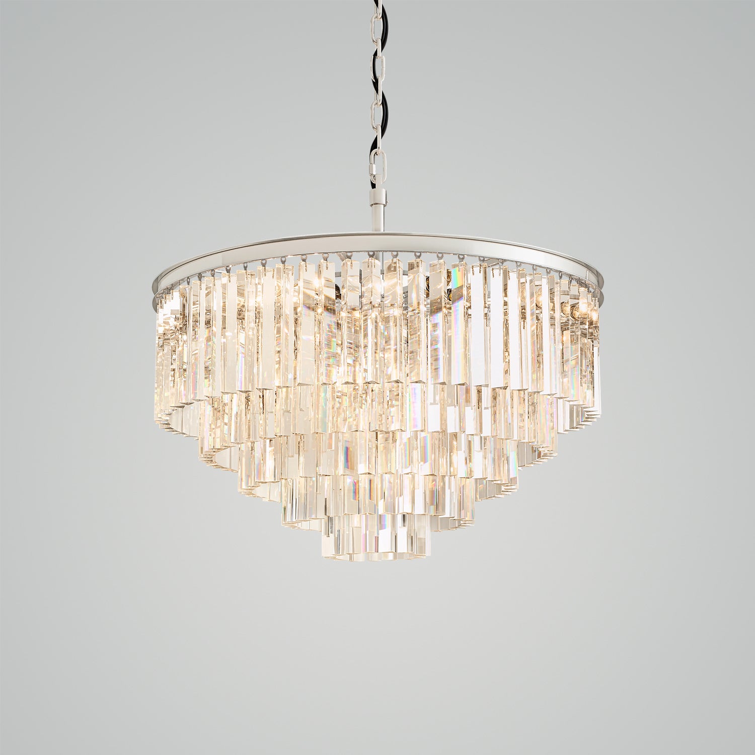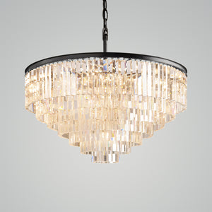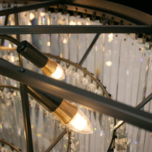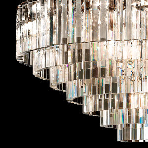 Inspired by the Art Deco style of 1920s Paris, this collection captures the era's fascination with geometric shapes. Hundreds of finely cut, dynamic prisms expertly refract light, evoking the allure of that time. The angular glass hangs like lush fringe from a welded iron frame, perfectly blending elegance with industrial style.