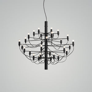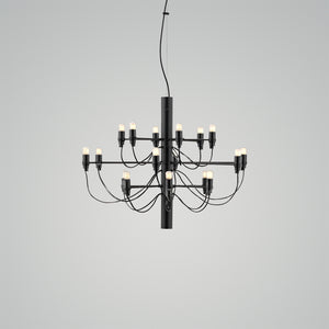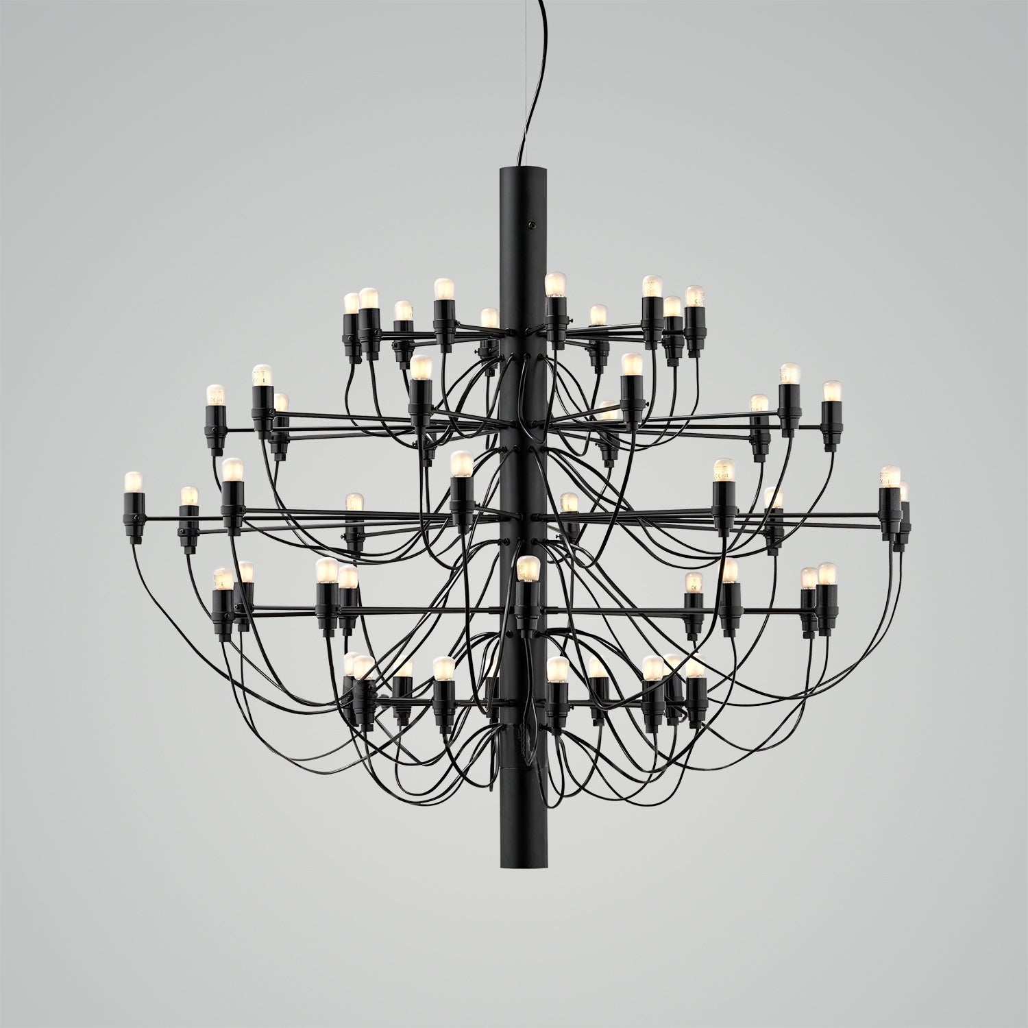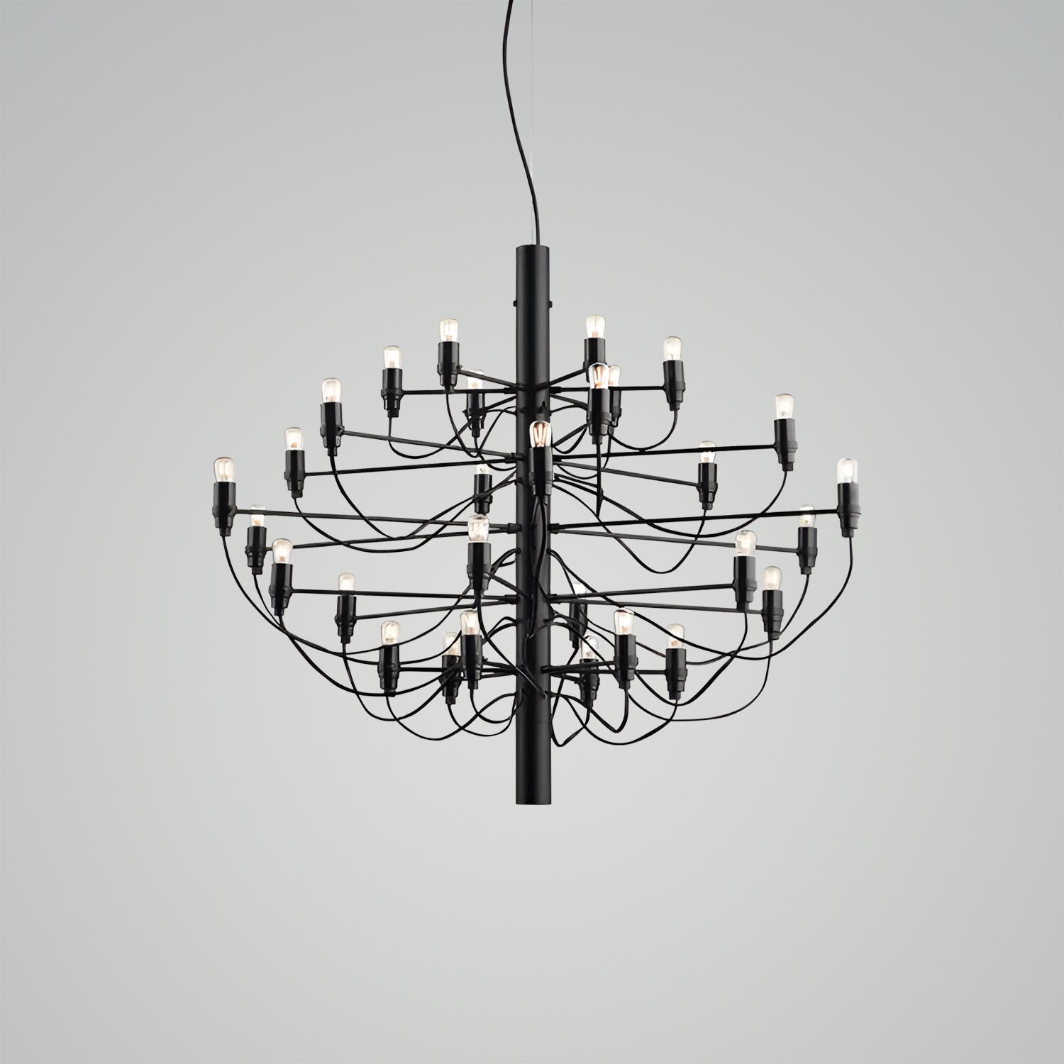 The 2097/30 is a suspension lamp that provides diffused light. The central structure is made of steel with brass arms, available in chrome-plated, matte black, matte white, or gold finishes. The lamp's ceiling fitting and canopy are also made of steel.