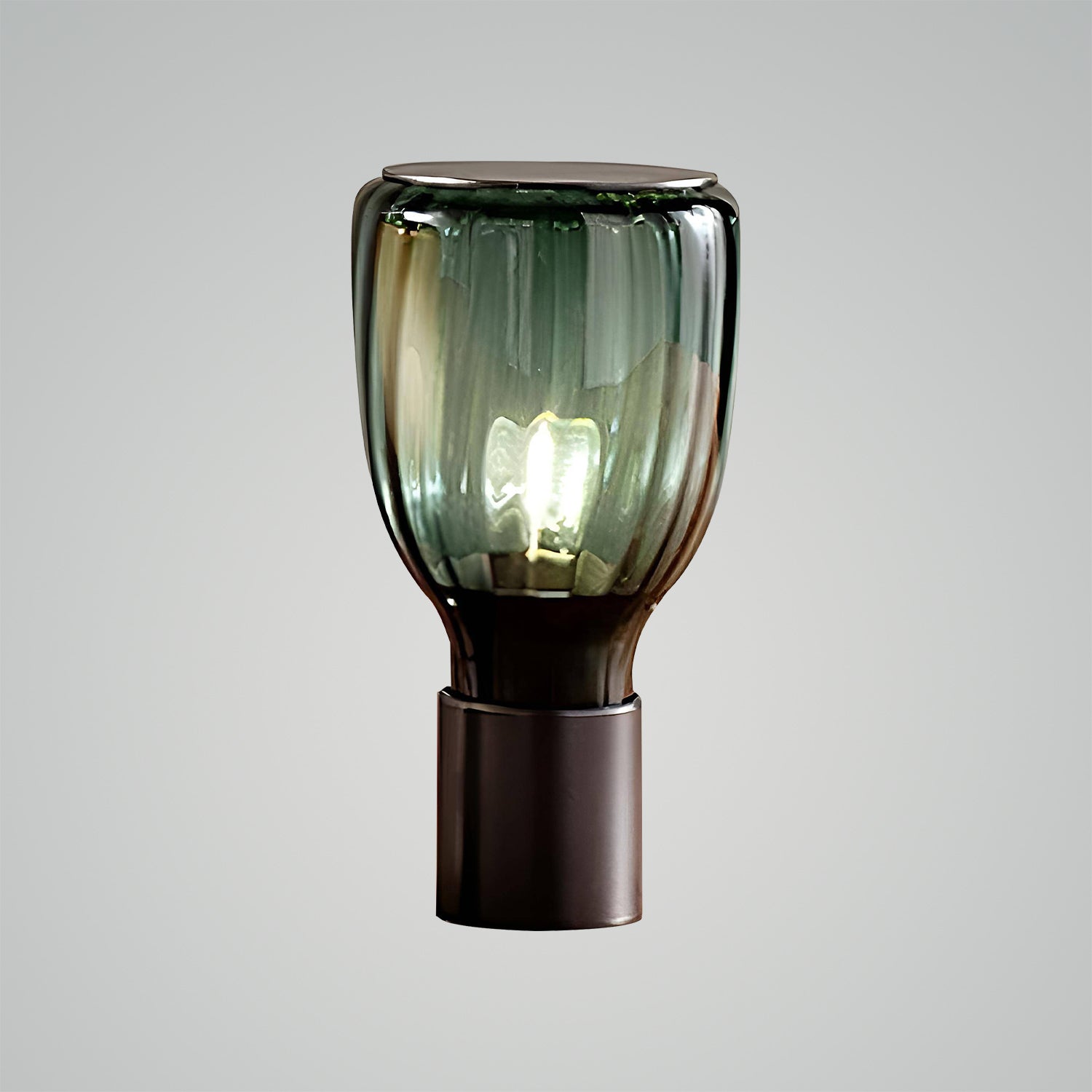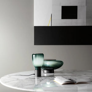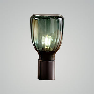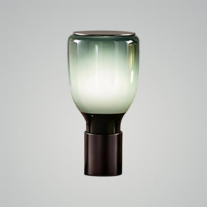 Introducing the "Acquerelli Table Lamp," a piece where artful design meets serene lighting. This lamp features a gracefully contoured, green-tinted glass shade that sits atop a sleek, dark base. The soft curvature of the lamp suggests a modern take on classical forms, while its tranquil color evokes a sense of calm and restoration. Perfect for creating an oasis of peace in any room, the Aqua Essence Lamp is more than a source of light—it's a statement piece that brings a touch of refined tranquility to your home. Ideal for reading nooks, bedside tables, or as a sophisticated accent in your living space, this lamp is a harmonious blend of elegance and functionality. Illuminate your home with this glowing emblem of beauty and grace.
