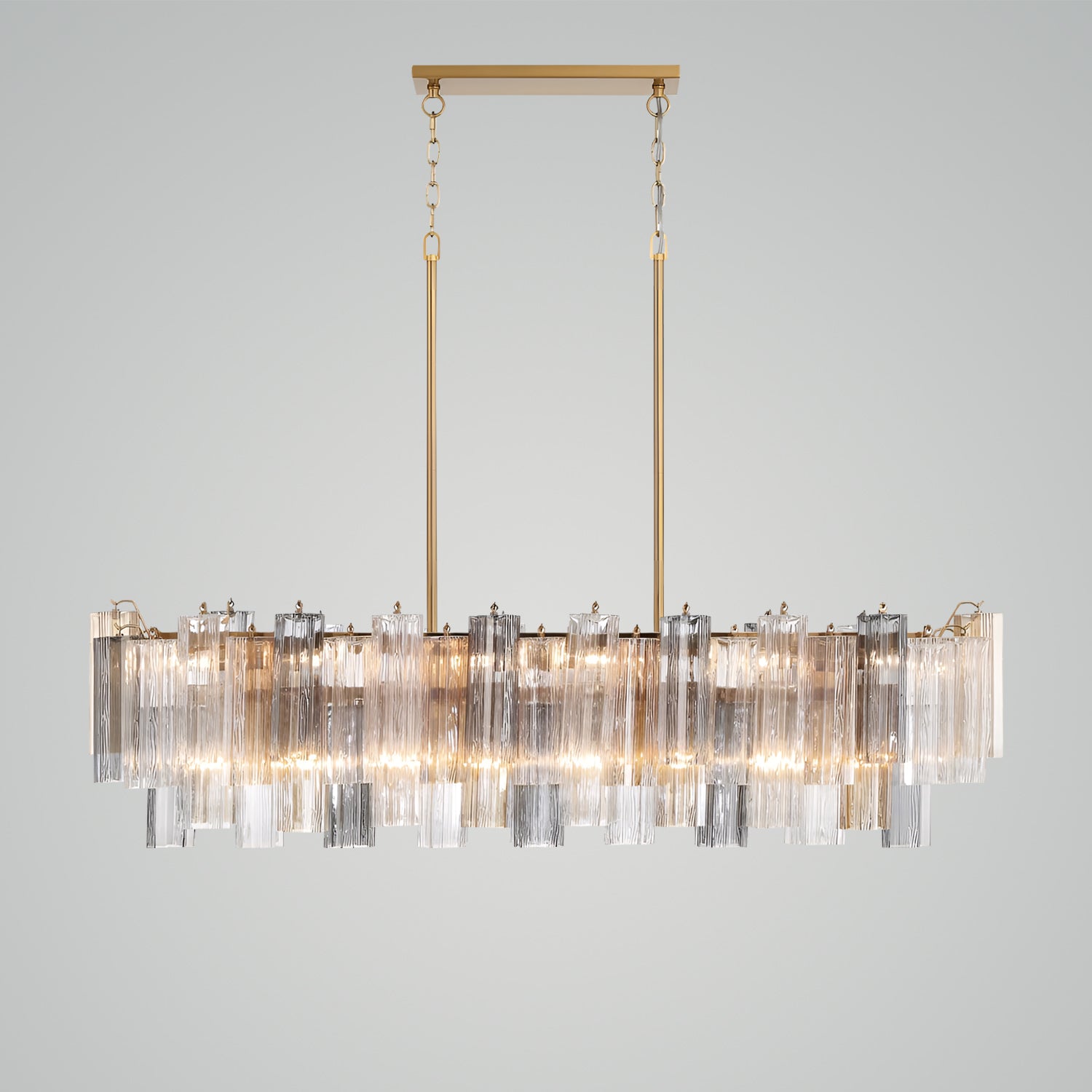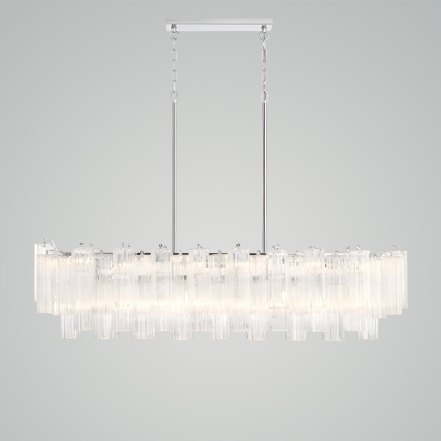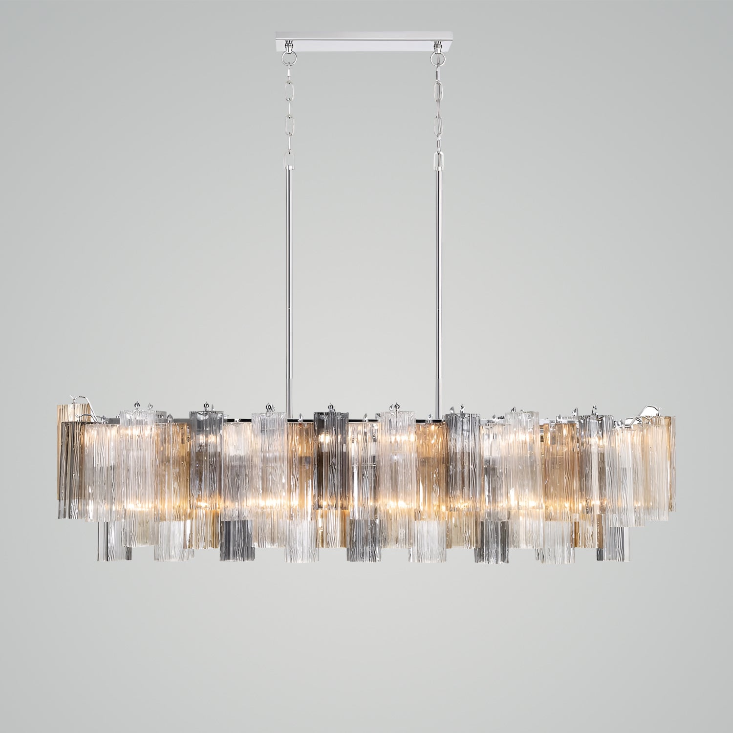 This captivating lighting collection is a modern interpretation of the iconic mid-century chandelier. Inspired by the smooth lines and geometric shapes of its predecessor, it features a polished chrome or antique bronze metal frame that exudes sophistication and style. Its unique design showcases transparent textured glass tubes, forming an enchanting five-pointed star shape. A variety of glass colors are available, including clear, amber, smoke, and white, as well as stunning autumn options that blend amber, clear, and smoke glass in a captivating mix. This lighting collection offers various sizes and finishes, allowing you to find the perfect match for your space while adding a touch of timeless elegance.