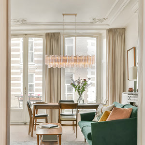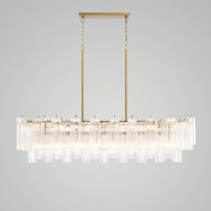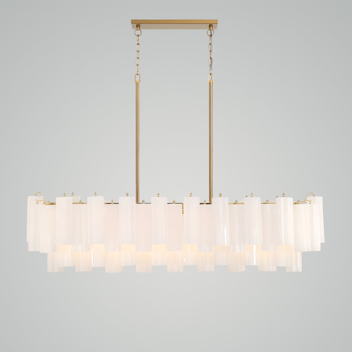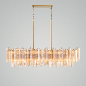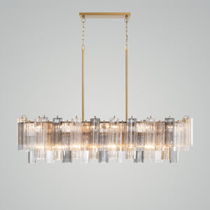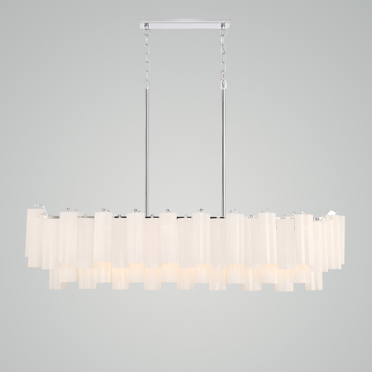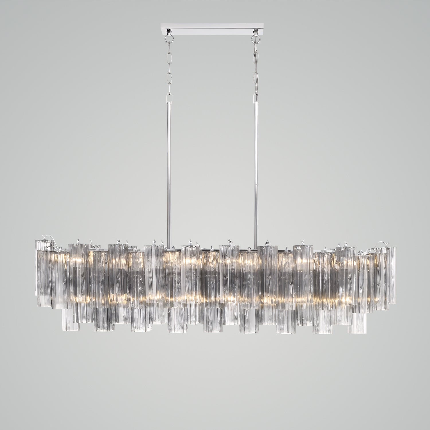 This captivating lighting collection is a modern interpretation of the iconic mid-century chandelier. Inspired by the smooth lines and geometric shapes of its predecessor, it features a polished chrome or antique bronze metal frame that exudes sophistication and style. Its unique design showcases transparent textured glass tubes, forming an enchanting five-pointed star shape. A variety of glass colors are available, including clear, amber, smoke, and white, as well as stunning autumn options that blend amber, clear, and smoke glass in a captivating mix. This lighting collection offers various sizes and finishes, allowing you to find the perfect match for your space while adding a touch of timeless elegance.
