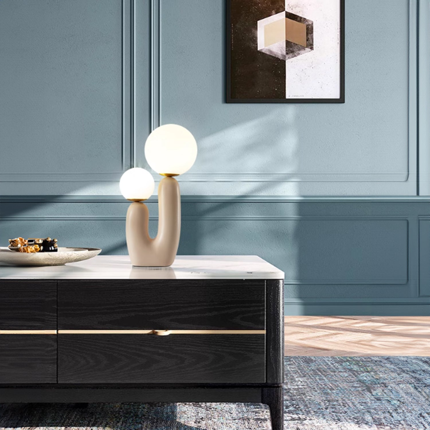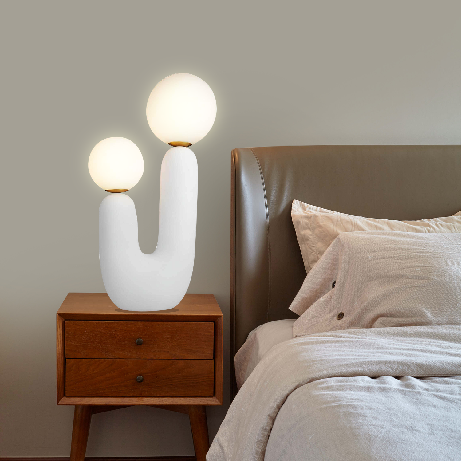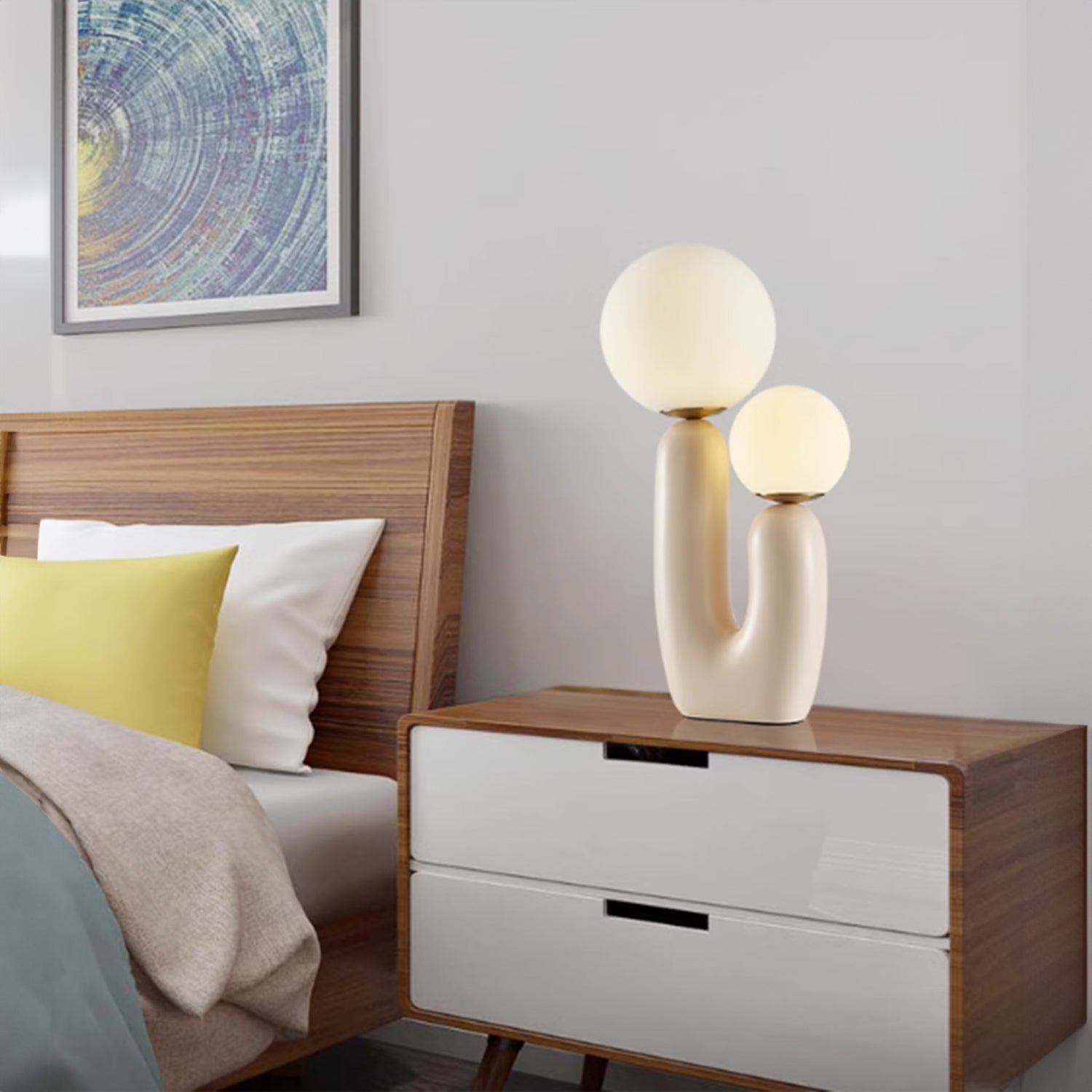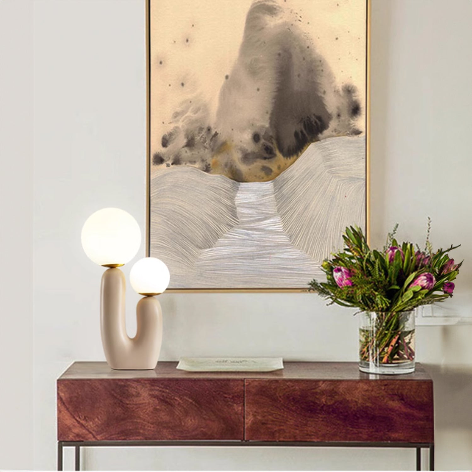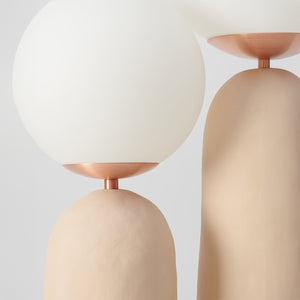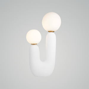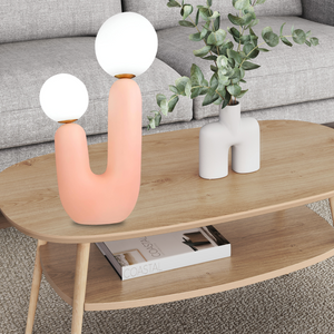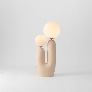 Introducing the "Oo Rough Table Lamp," a unique lighting solution that combines organic contours with the simple elegance of luminescent spheres. This artfully designed lamp features a rich, walnut-hued ceramic base that twists into a cactus-like form, offering a playful yet sophisticated silhouette. Crowned with two frosted glass orbs of differing sizes, it provides a balanced, soft glow that can enliven any space. The "BiOrb Harmony Table Lamp" is perfect for those who appreciate a touch of nature's whimsy in their home decor. Whether it's brightening a dim corner or adding character to your tabletop, this lamp is a conversation starter that marries functional lighting with distinctive design.