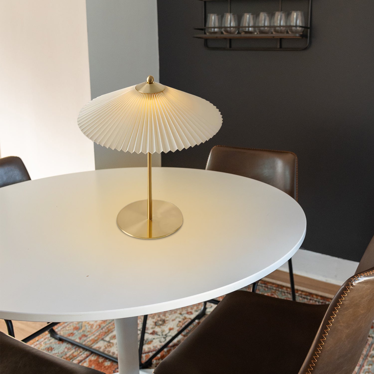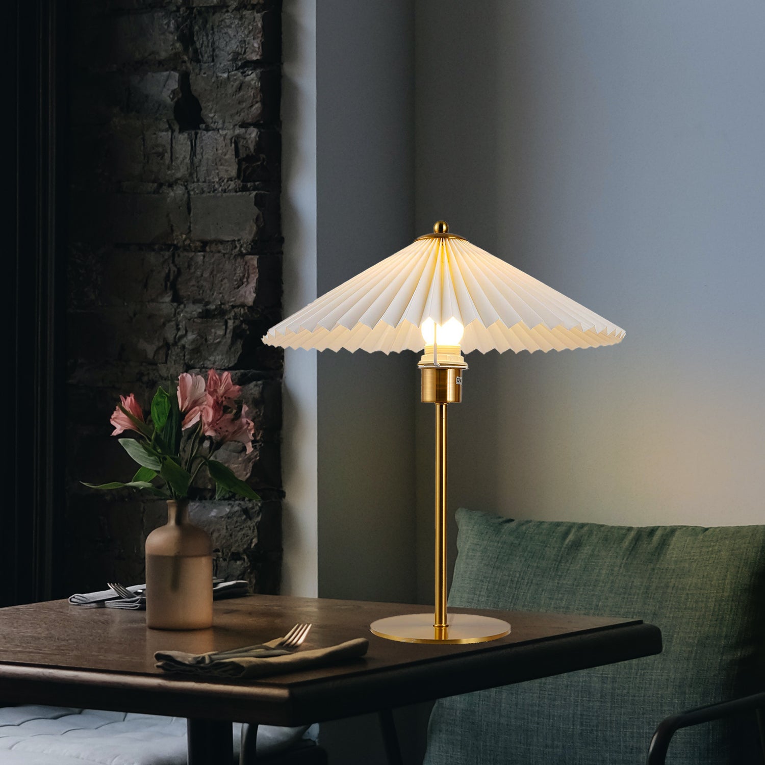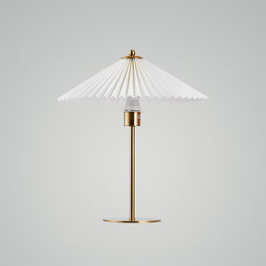 Step into a world where classic charm meets contemporary design with the 'Perla Pleated Table Lamp.' This exquisite piece features a pleated, umbrella-style shade that exudes a warm, diffused light, perfect for creating an inviting ambiance. The lamp's slender golden stem and base reflect a bygone era of sophistication, making it a stunning addition to any desk, bedside table, or reading nook. Infuse your home with the timeless beauty and soft glow of the Gilded Elegance Table Lamp, a true statement piece for lovers of vintage-inspired modernity.