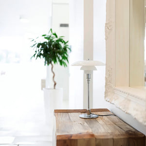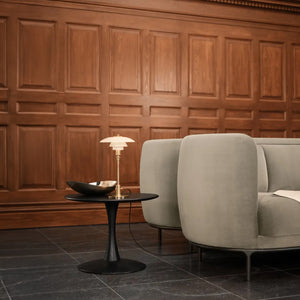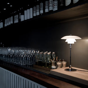 This exquisite PH 2/1 table lamp is crafted from aged brass and four layers of hand-blown glass. Each piece in the collection is a reinterpretation of an iconic design, subtly reflecting the brand's unique design language through Pequin stripes and a luxurious color palette.