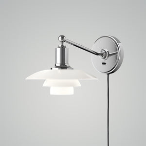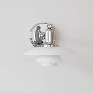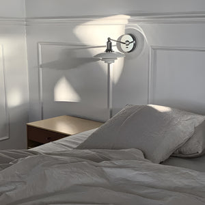 The design of the fixture is based on the principle of a reflective three-shade system, primarily directing most of the light downwards. The shade is made of hand-blown opal three-layer glass, featuring a glossy surface on the top and a sandblasted matte finish on the inside, resulting in a soft and uniform light distribution.