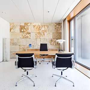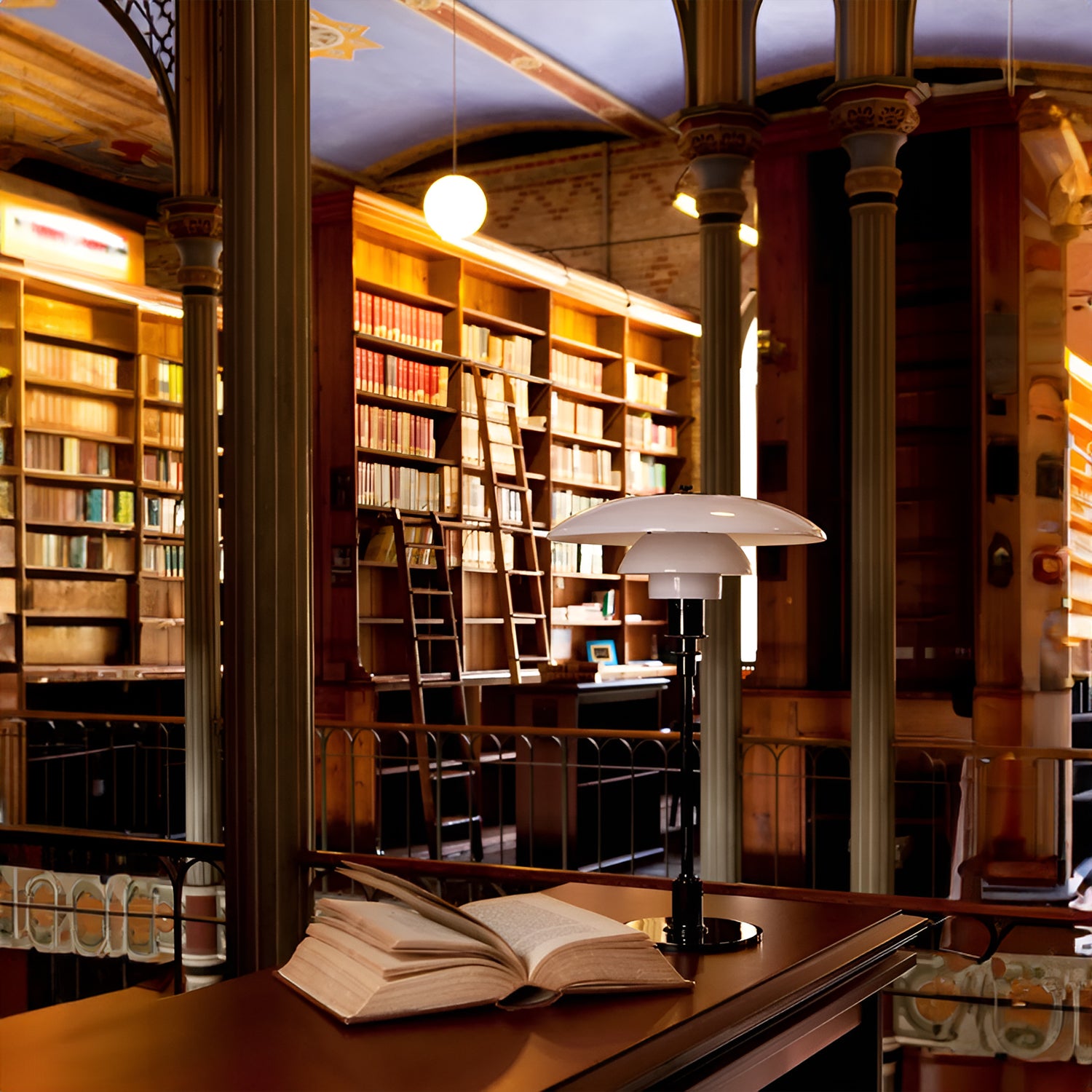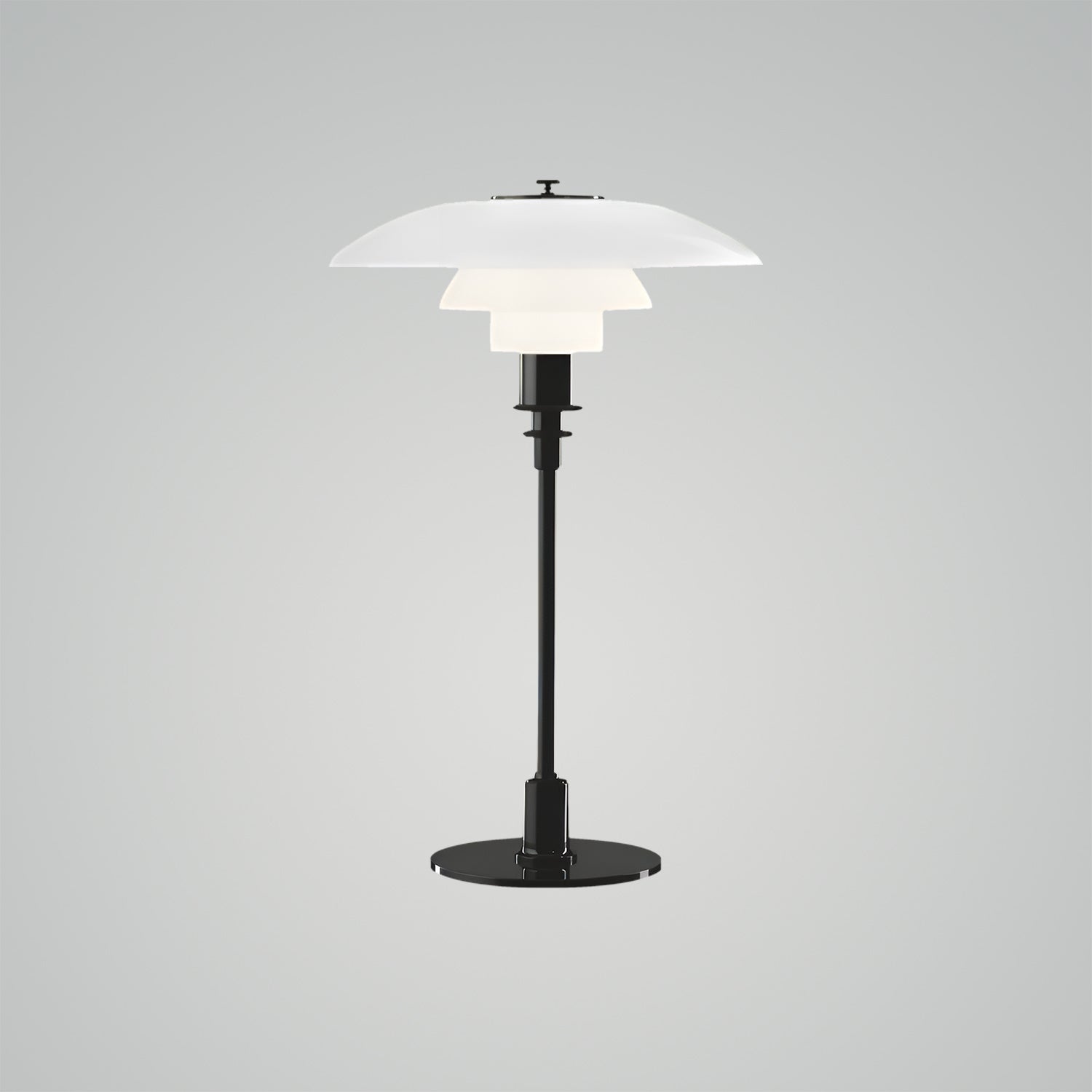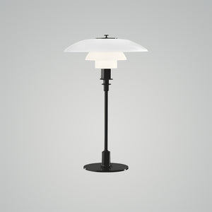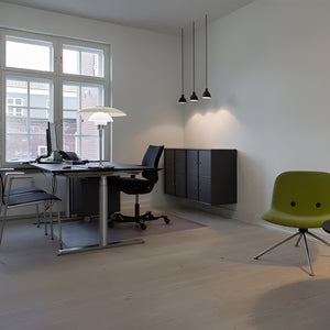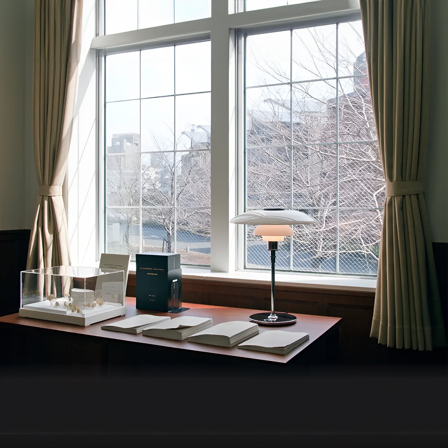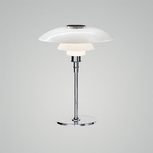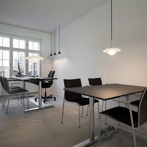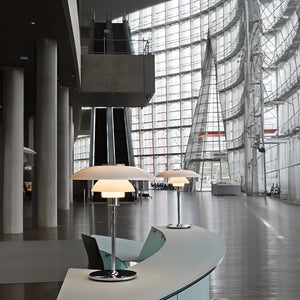 The design of the fixture is based on the principle of a reflective three-shade system, primarily directing light downwards. The shades are made of hand-blown opal three-layer glass, with a smooth surface on the top and a sandblasted matte finish on the bottom, providing a soft and even distribution of light.