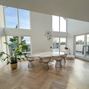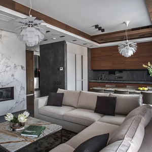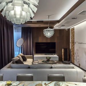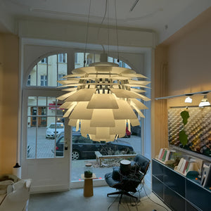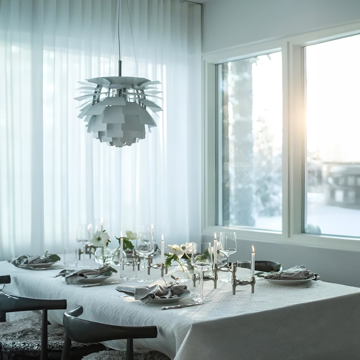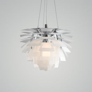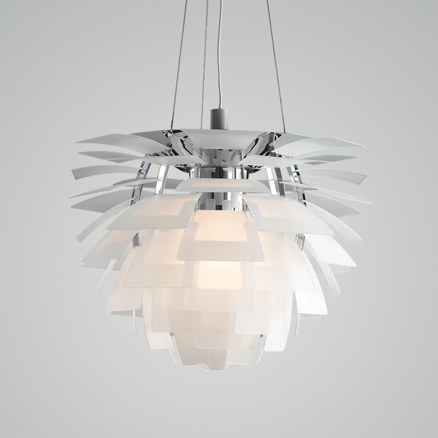 In 1958, a lamp was designed for a restaurant, and the design of the Artichoke Glass pendant lamp was completed in three months, as it largely inherited the design concept of a previous model. The previous model featured seven transparent glass shades with six sandblasted sections, while the Artichoke used metal copper as the primary material, with the shade divided into several groups of "petals." The Artichoke Glass pendant lamp, made of hand-sandblasted glass, represents a design closer to the essence of the previous model. The light diffuses through the glass blades in all directions, creating a soft and comfortable atmosphere. Whether lit or not, the frosted, transparent appearance of the blades adds a touch of elegance and lightness to the room.