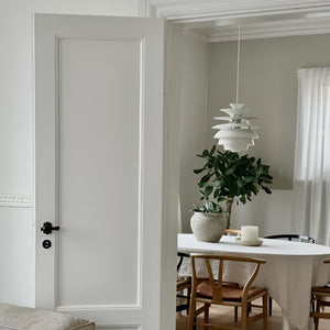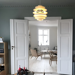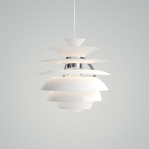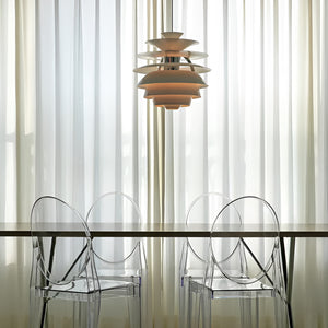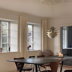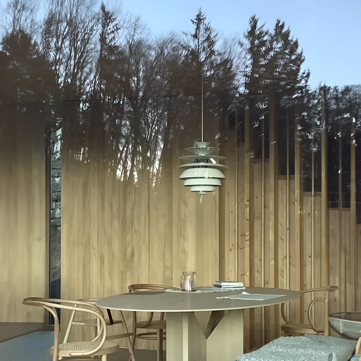 The fixture emits comfortable, glare-free diffuse light. The matte-painted undersurfaces and glossy top surfaces create an attractive reflection of the diffused light, resulting in uniform light distribution around the fixture. When the light is switched on, the top area is illuminated while the bottom part remains dark.