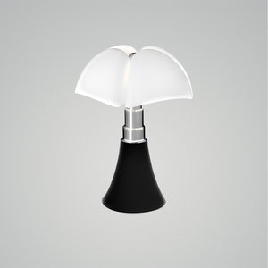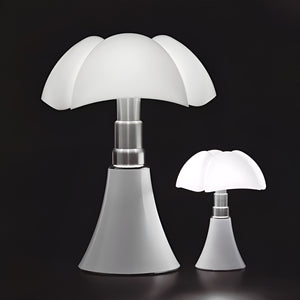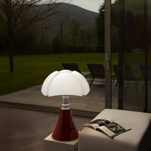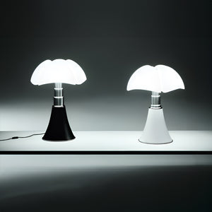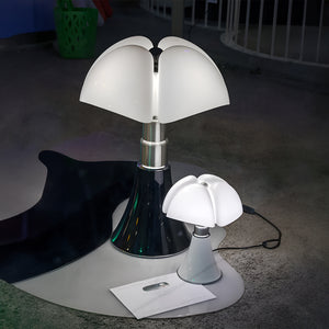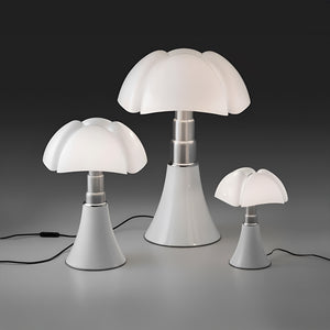 This is a table or floor lamp with adjustable height, providing soft diffused light. The design features a glazed stainless steel telescopic rod, a lampshade made of white opal methacrylate, and a base and knob crafted from lacquered aluminum. LED bulbs are included.
