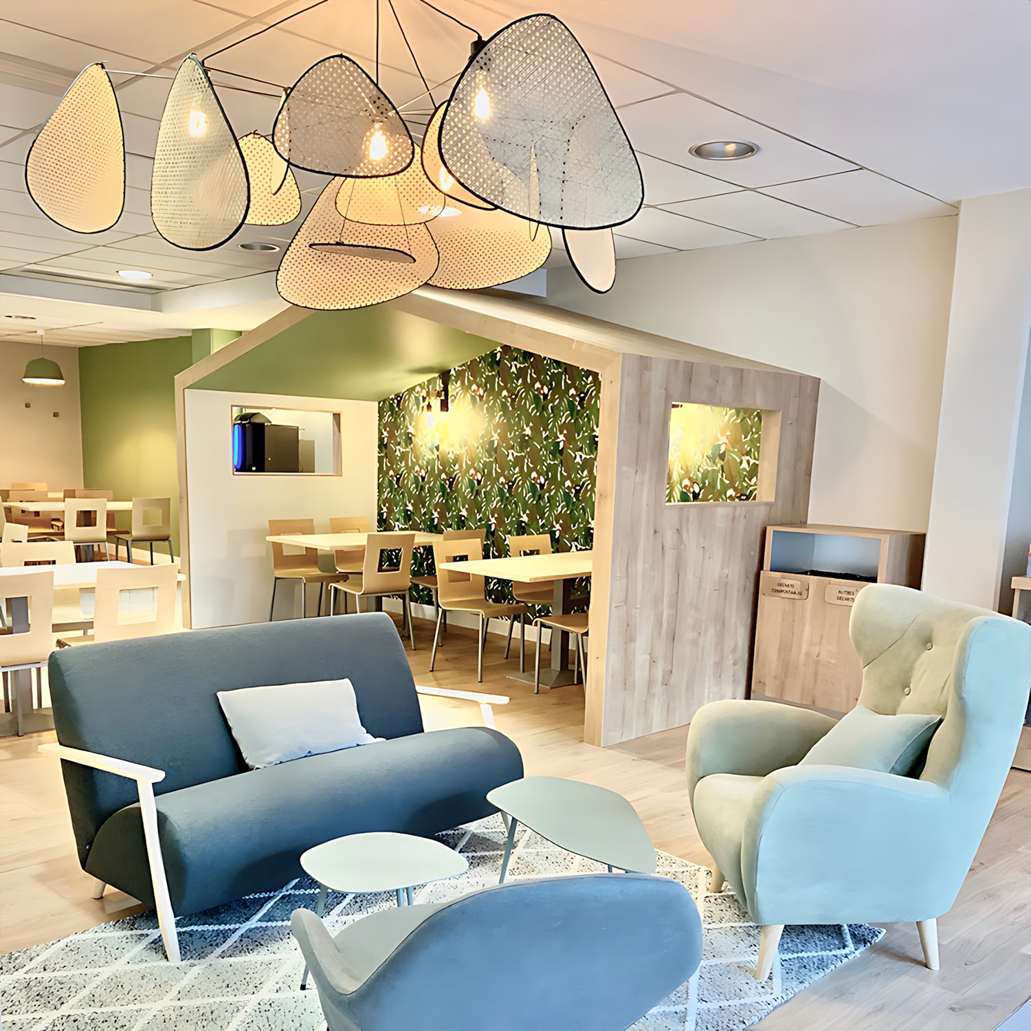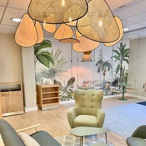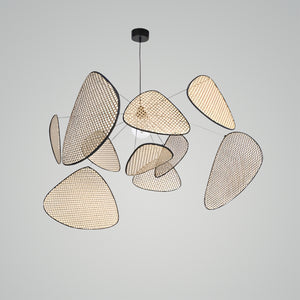 The XL pendant light embodies a sense of movement. It features a painted metal structure with 10 cane screens and fabric trim. It is equipped with a textile cord and a versatile DCL metal bell.