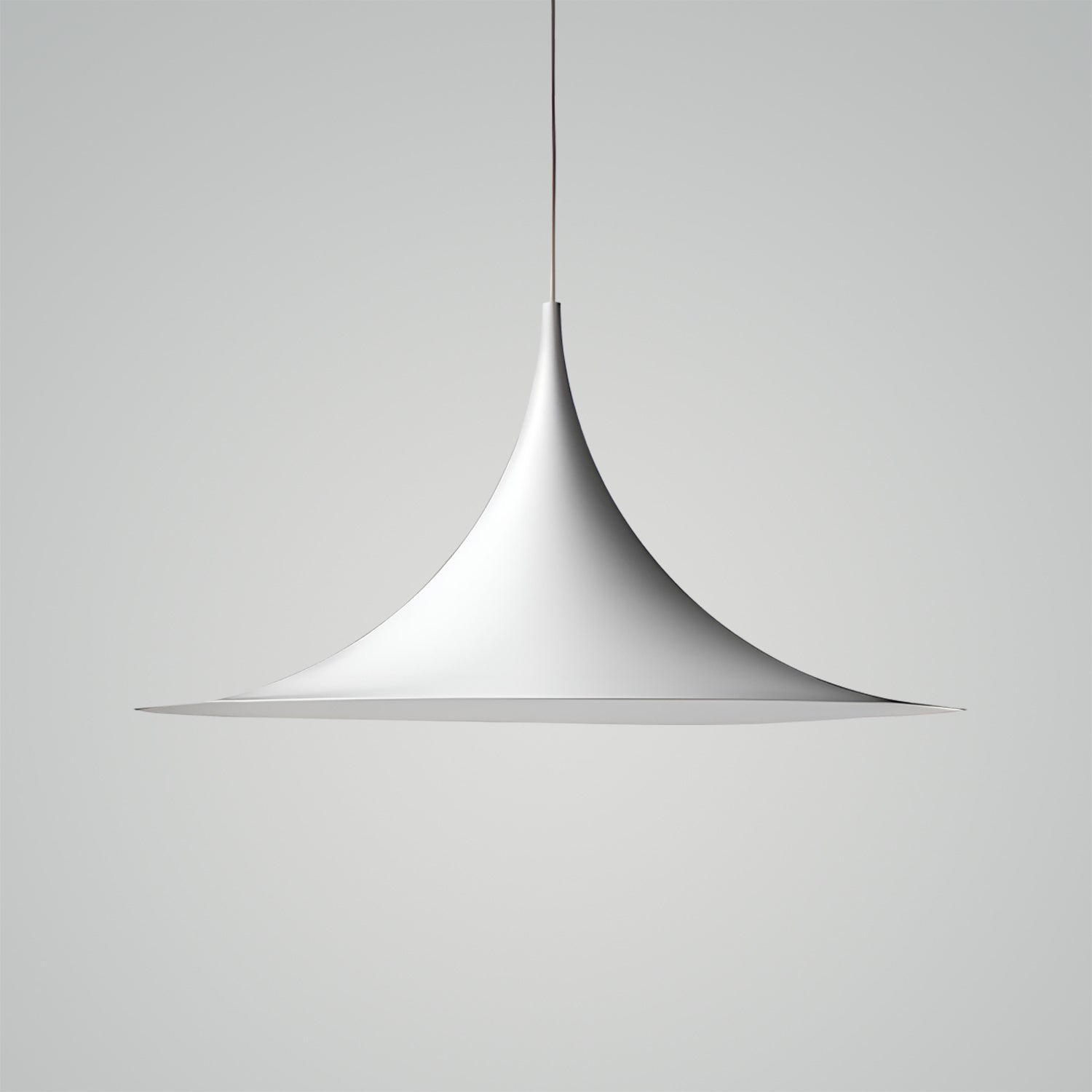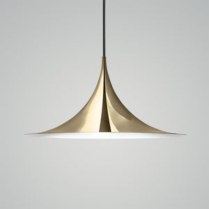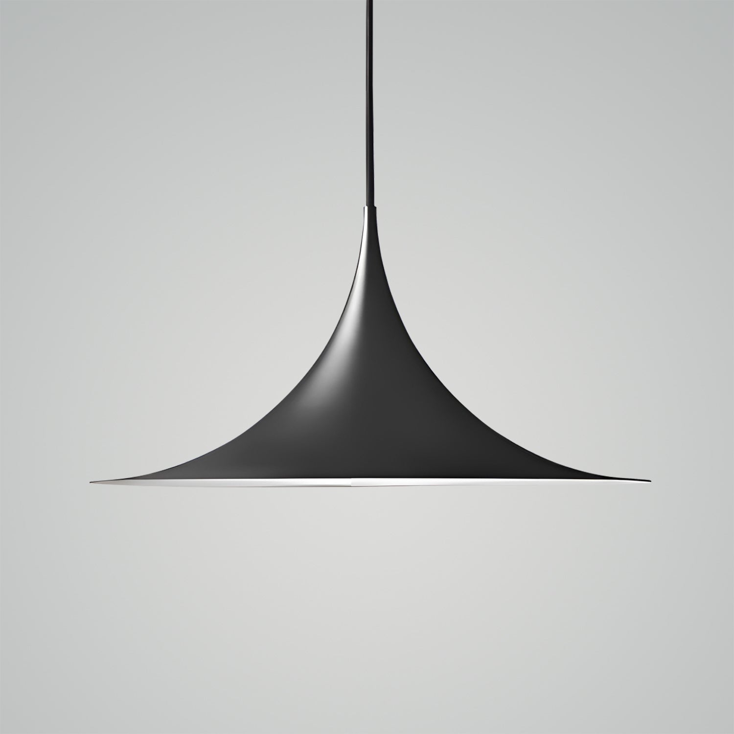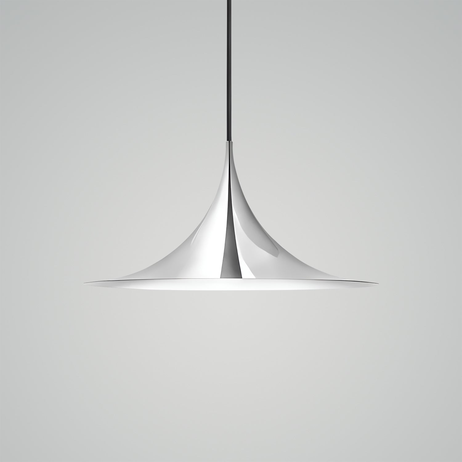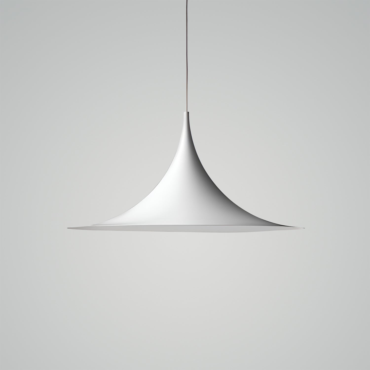 The semi-pendant light serves as both a funnel and a vortex, directing strong downward light through its trumpet-shaped shade. Designed in 1968, this functional light fixture is based on geometric principles; its profile is formed by placing two quarter circles in reverse alignment. The original shape is made of aluminum and then coated with a thick layer of paint or polished to produce pure reflective light.