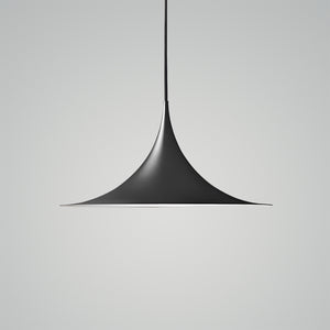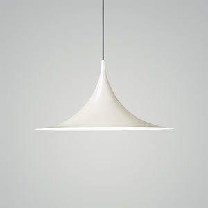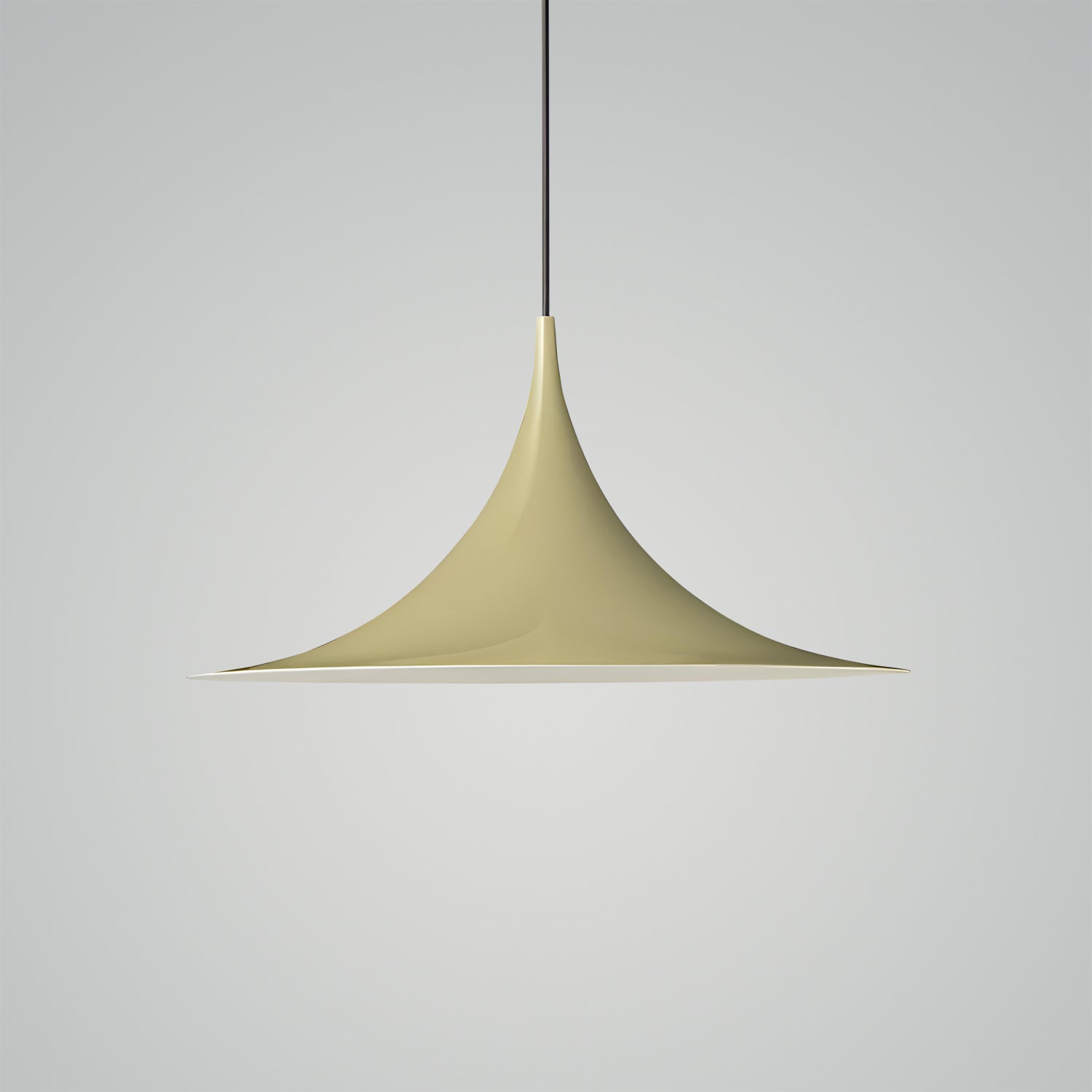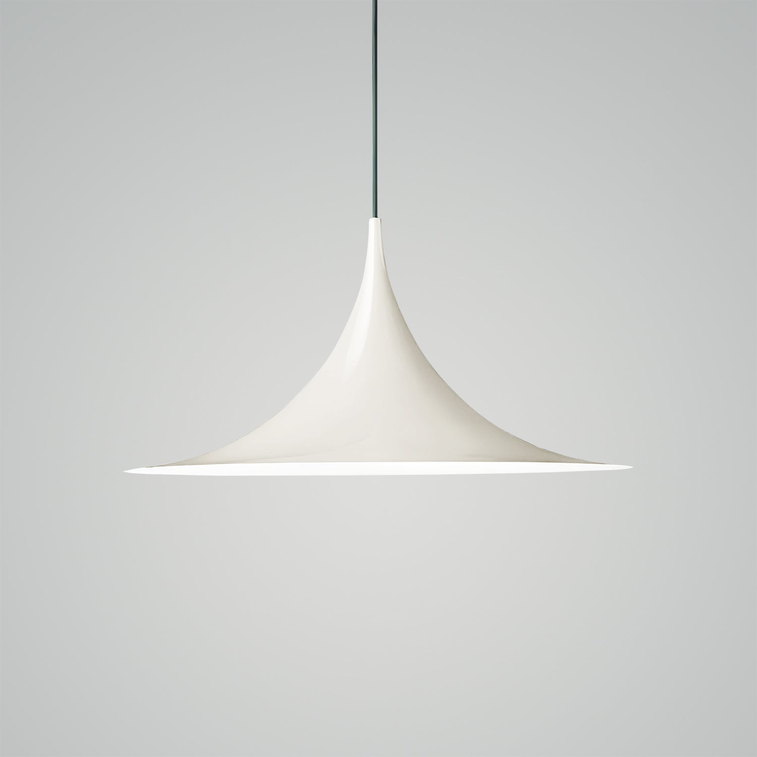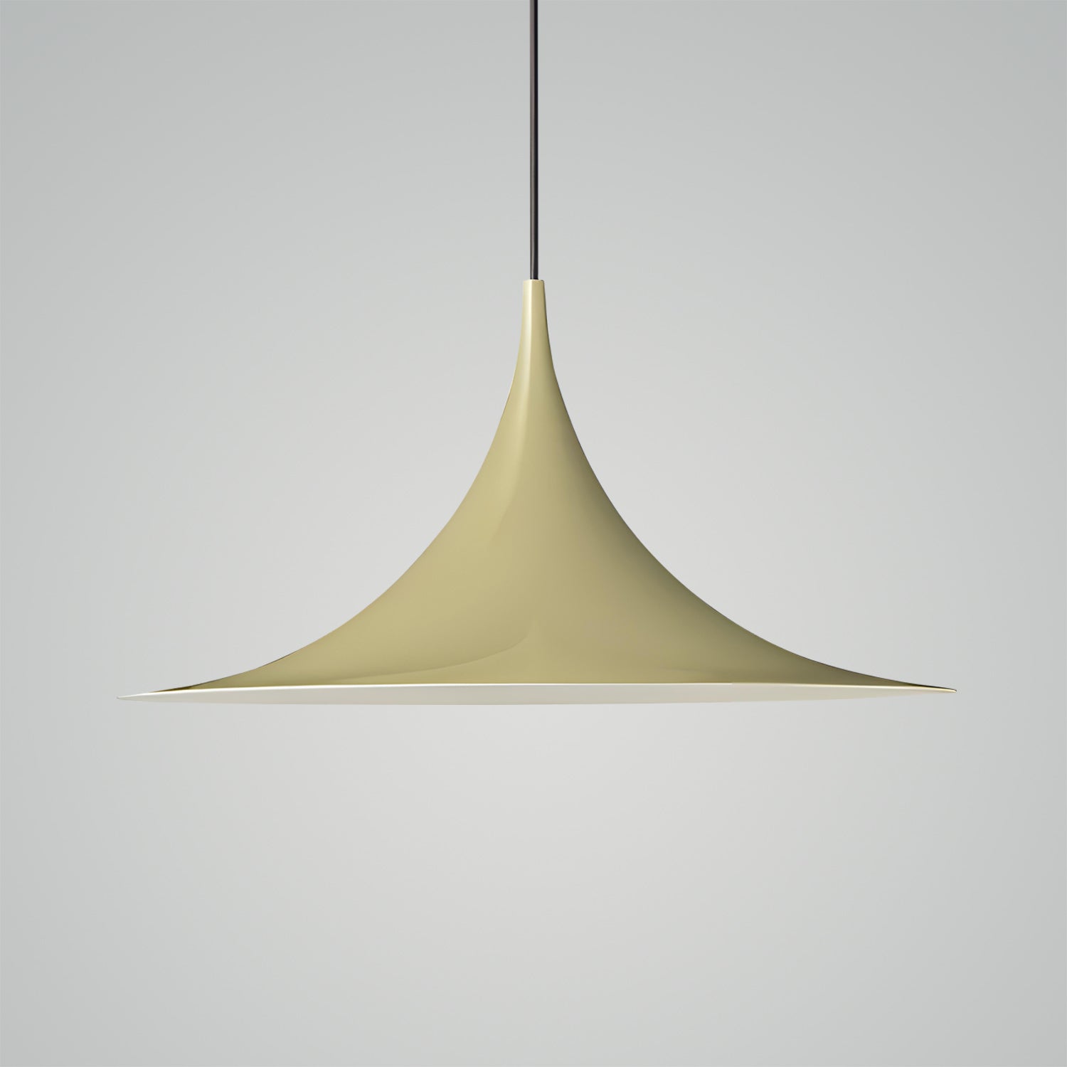 The semi-pendant light serves as both a funnel and a vortex, directing strong downward light through its trumpet-shaped shade. Designed in 1968, this functional light fixture is based on geometric principles; its profile is formed by placing two quarter circles in reverse alignment. The original shape is made of aluminum and then coated with a thick layer of paint or polished to produce pure reflective light.