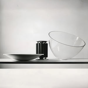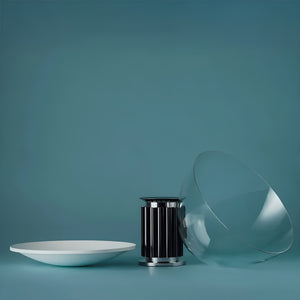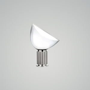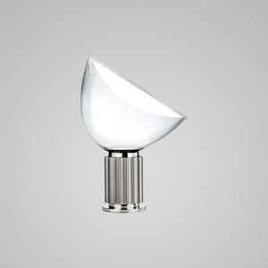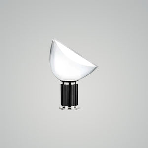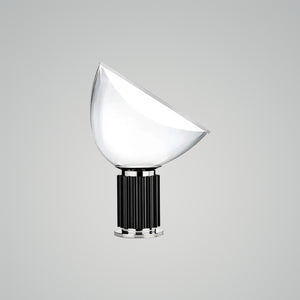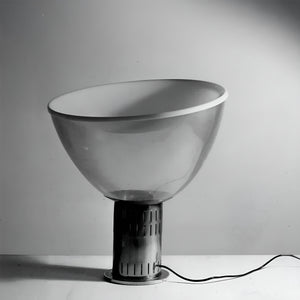 This is a table lamp that provides indirect and reflected light. The reflector is made of painted aluminum, with a gloss white exterior and a matte white interior. The adjustable diffuser is made of transparent blown glass. The body is available in matte black or naturally anodized extruded aluminum. The base is made of nickel-plated ABS+PC material.