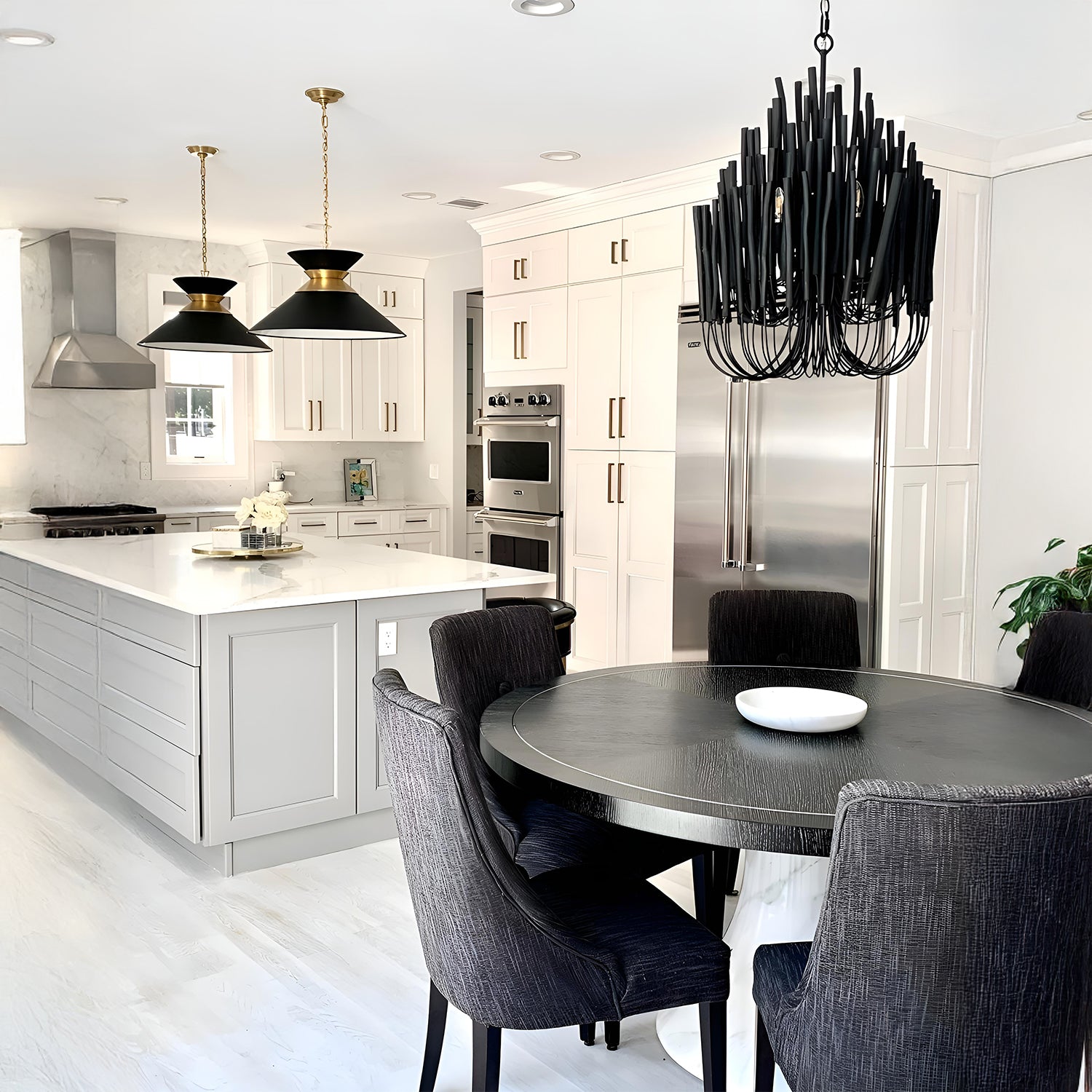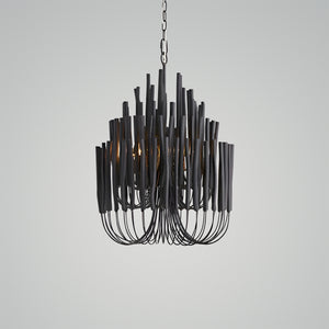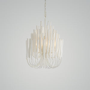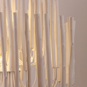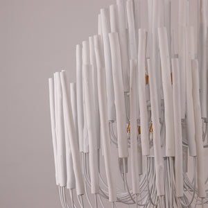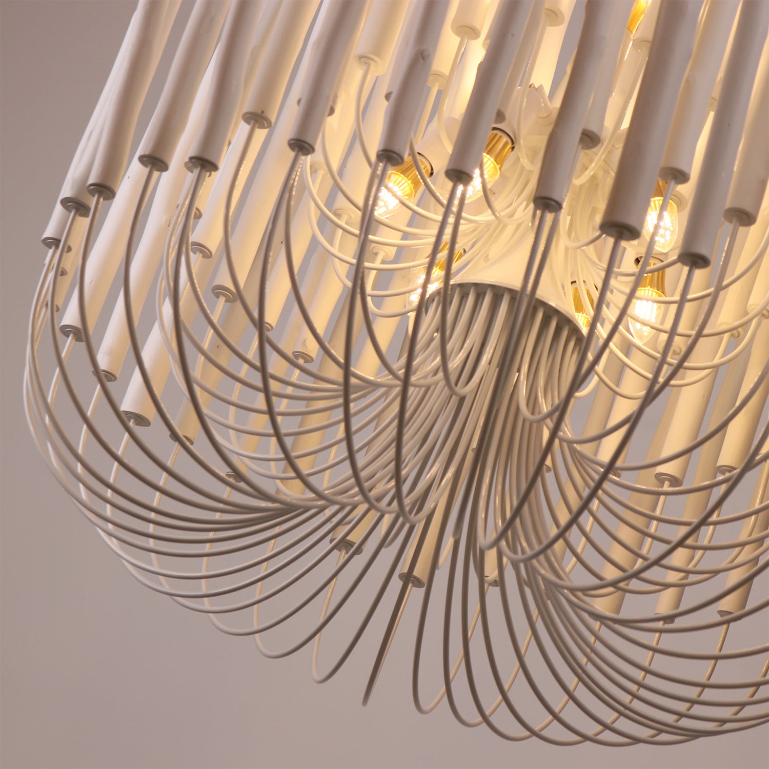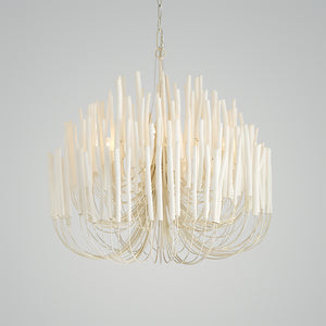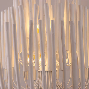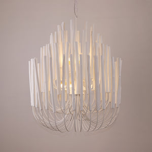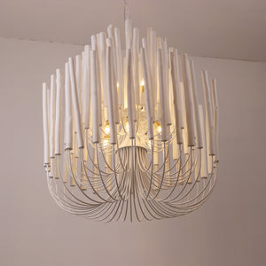 The chandelier features a white design with a stunning appearance, resembling an ornament, and shares a similar aesthetic with high-end recycled furniture. The five-layer white wooden "candle holder" exudes a relaxed elegance, suspended from a U-shaped white iron arm, creating a colorless centerpiece that produces a dramatic effect in brightly colored rooms.
