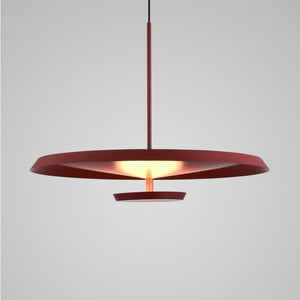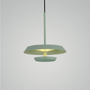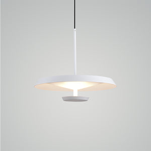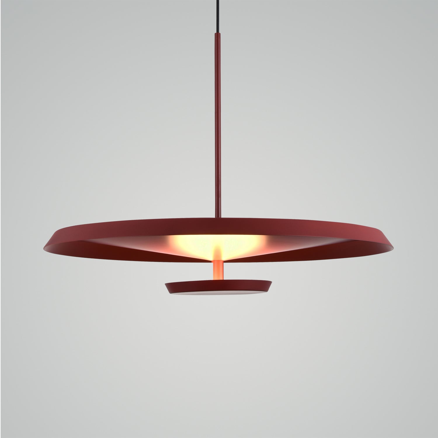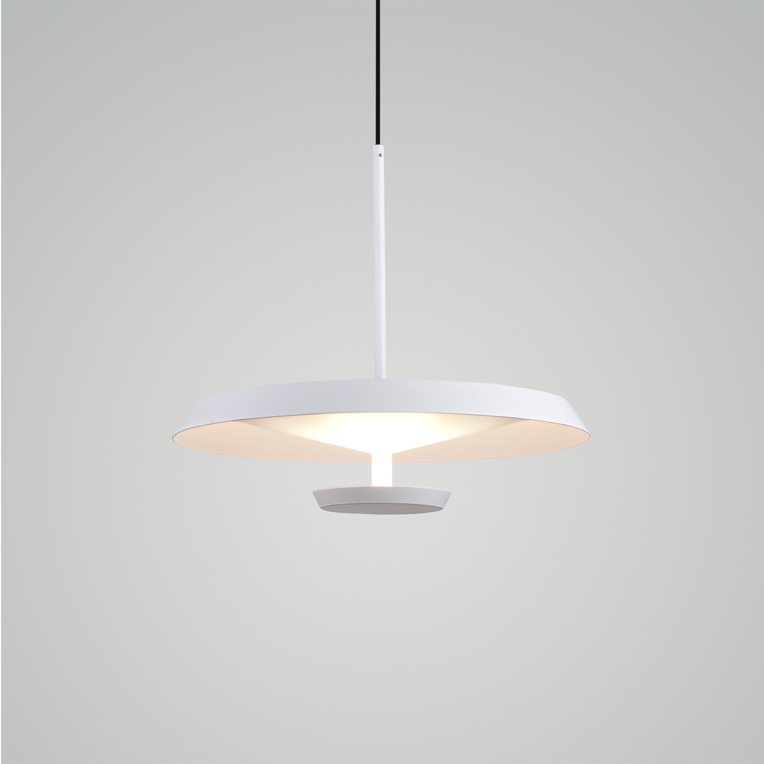 The pendant light is a modern reinterpretation of the classic ceiling rose. It features a pair of simple circles and serves as a focal point with its LED light source. This design produces a uniform halo effect, offering even indirect lighting and creating a calming illumination.