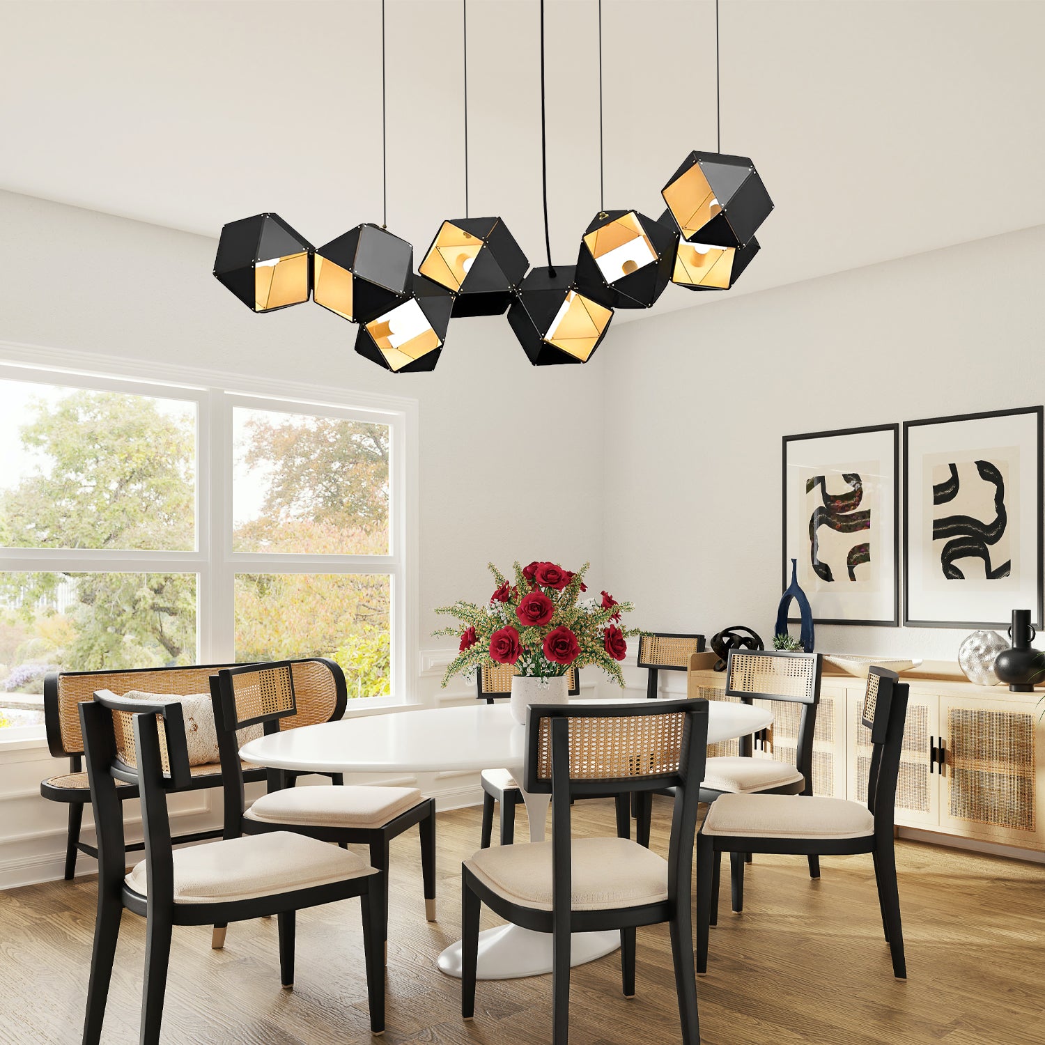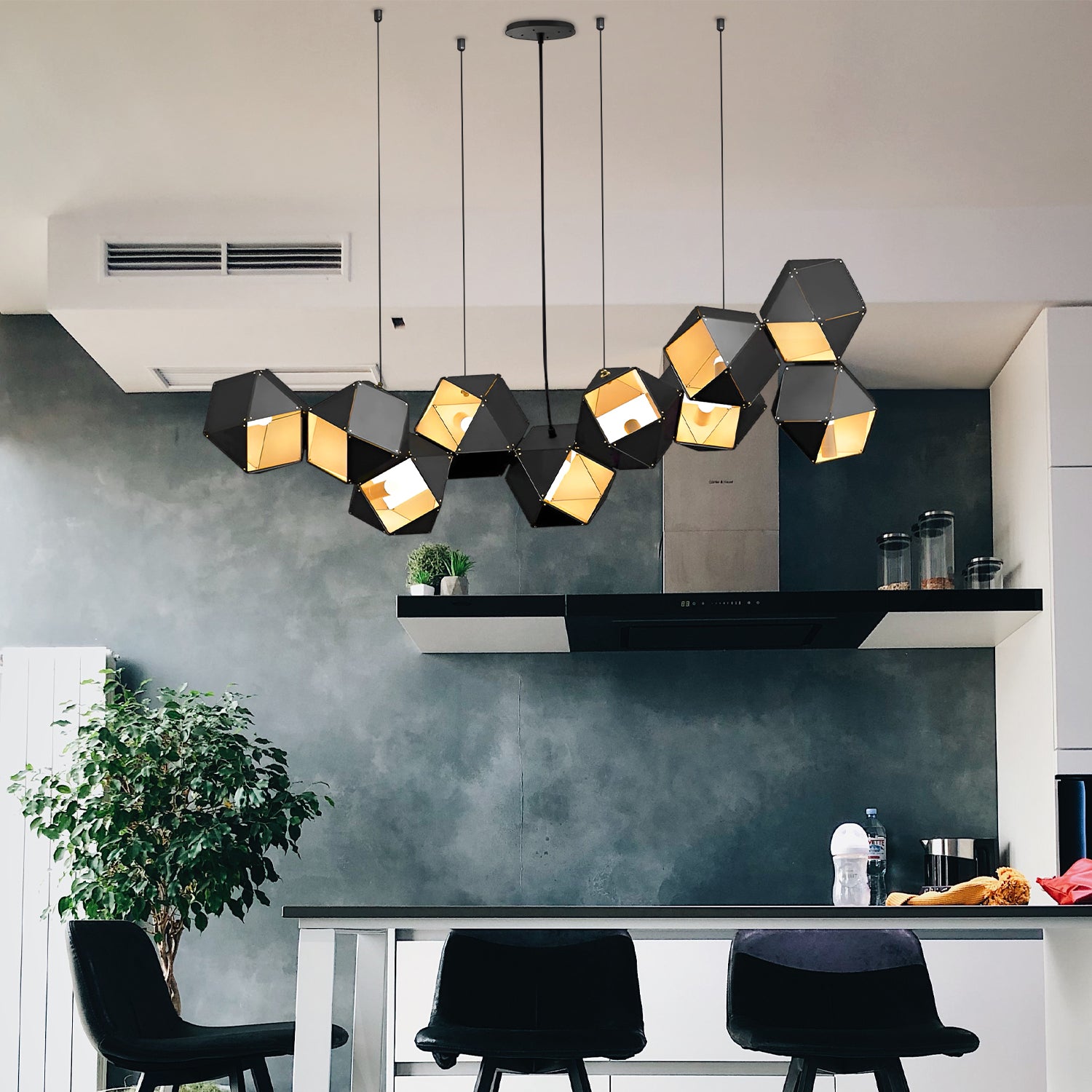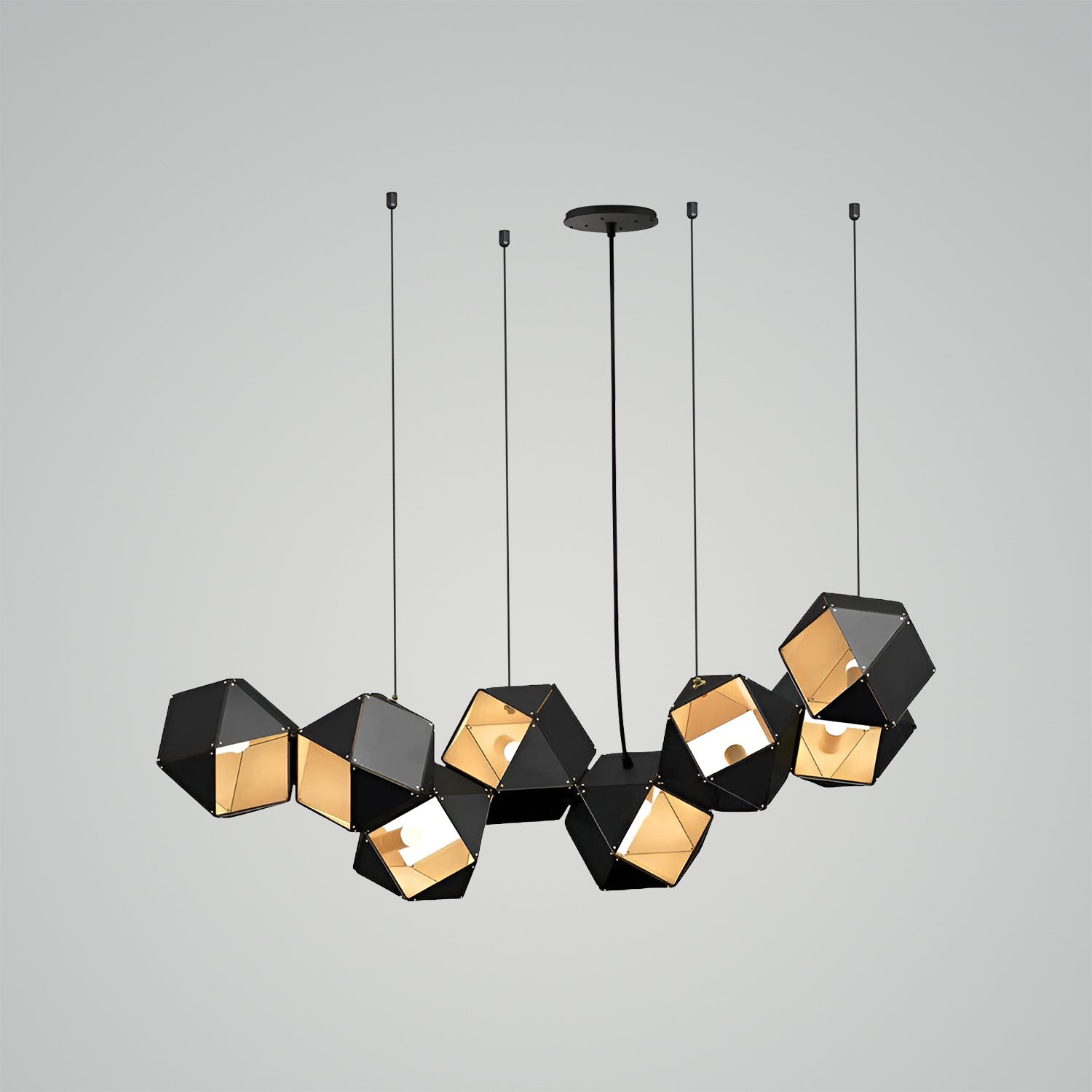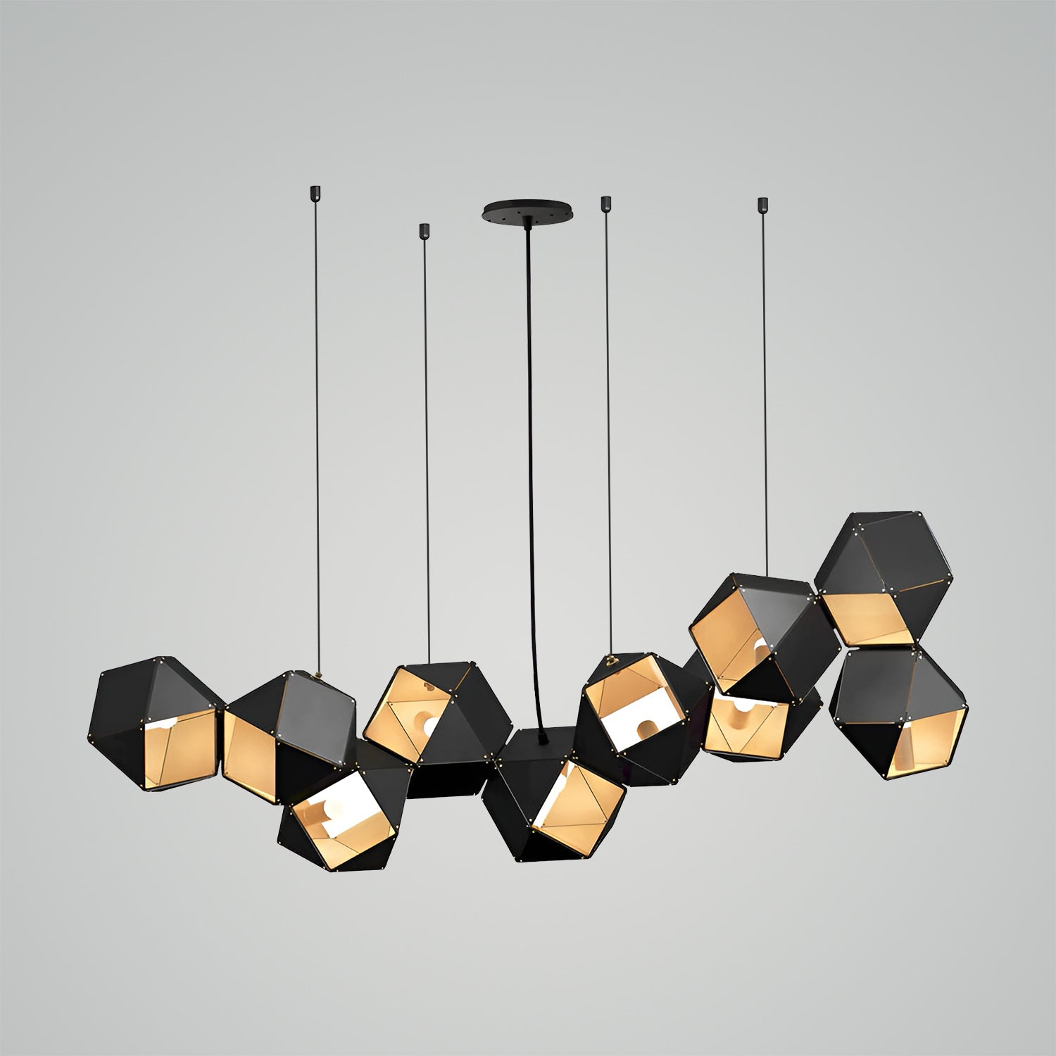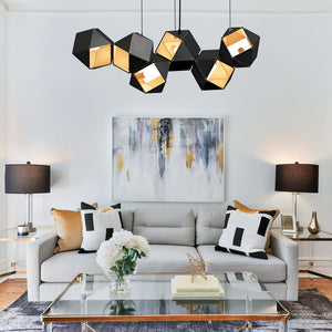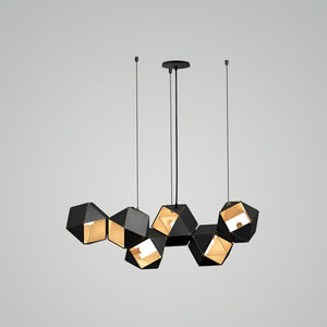 Introducing the "Welles Chandeliers" - a marvel of modern lighting design that embodies sophistication and innovation. Inspired by the natural symmetry of honeycombs, this pendant features a series of interconnected geometric shapes, each housing a soft glow that casts a warm and inviting light. The sleek black finish adds a touch of contemporary elegance, making it a versatile addition to any décor. Whether suspended above a dining table or gracing a corporate lobby, the "Honeycomb Lumina Pendant" is sure to be a conversation starter, blending impeccable design with the functionality of ambient lighting. Illuminate your space with this stunning piece and bask in the ambiance it creates.