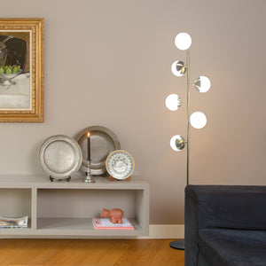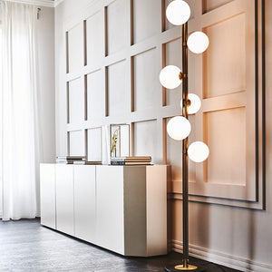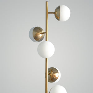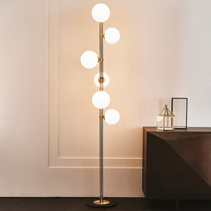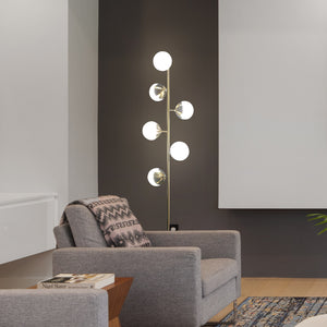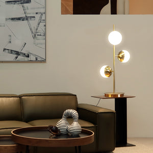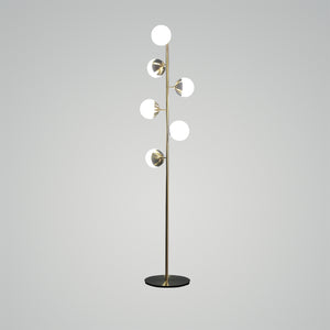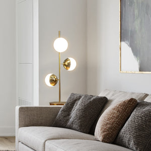 Introducing the "Doppler LED Tree Lamp," a harmonious blend of form and function that captures the imagination. Designed with sleek lines and a radiant brass finish, this lamp features a trio of frosted globes that seem to float in balance with their metallic counterparts. The unique design allows each sphere to rotate, casting light in all directions and creating dynamic shadows that dance across the room. This elegant piece is not just a lighting fixture but a modern sculpture that adds an instant touch of sophistication to your living space. Perfect for reading corners or ambient lighting, the "Orbit Spheres Floor Lamp" brings a celestial elegance to your home.