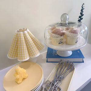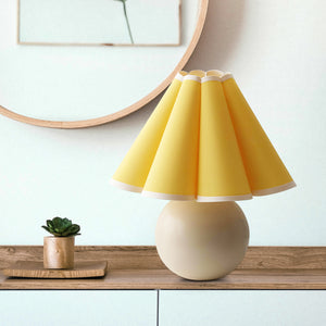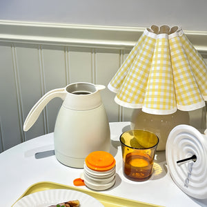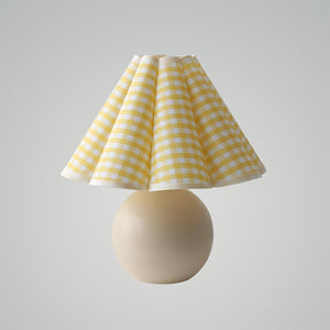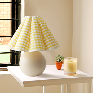 Infuse your living space with a ray of sunshine with our "Kicsi Knife Pleat Table Lamp." The classic yellow and white gingham pattern on the shade exudes a timeless charm, reminiscent of lazy Sunday mornings and warm, carefree days. The spherical, creamy white base complements the vivid lampshade, bringing a balance of color and joy to any room. Ideal for creating a cozy ambiance in a reading corner or as a charming accent in a farmhouse-style kitchen, this lamp will cast a soft, welcoming light wherever it's placed. The "Sunbeam Checkered Table Lamp" marries rustic appeal with contemporary shapes, perfect for those looking to brighten their home with a splash of country chic.
