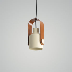 This pendant light features a modern design with a cylindrical cream-colored shade, showcasing a sleek and contemporary look. The shade is suspended by a wide, curved leather or leather-like strap in a warm brown tone, adding a stylish and unique element to the overall design. The strap is secured to the shade with large round fasteners that match the cream color of the shade, creating a cohesive and polished appearance. The black cord provides a subtle contrast, making this pendant light a perfect blend of modern minimalism with a hint of rustic charm. It would be an excellent addition to spaces seeking a distinctive yet understated lighting solution.