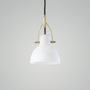This pendant light features a minimalist design with a smooth, matte white dome-shaped shade. The shade is accented with brass details, including two adjustable screws on either side and a sleek suspension arm, adding a touch of elegance and industrial flair. The black cord contrasts nicely with the white shade and brass elements, making it a versatile piece that fits well in both modern and classic interiors. The overall look is clean, functional, and stylish, perfect for adding a subtle yet sophisticated touch to any room.