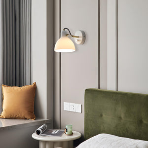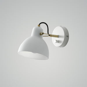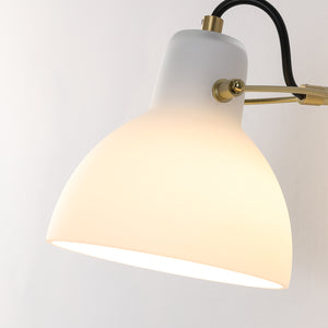 This wall lamp features a minimalist design with a smooth, matte white dome-shaped shade. Brass accents, including two adjustable screws on either side and a sleek suspension arm, add a touch of elegance and industrial flair. The black cord contrasts nicely with the white shade and brass elements, making this a versatile piece that can fit well in both modern and classic interiors. The overall look is clean, functional, and stylish, perfect for adding a subtle yet sophisticated touch to any room.