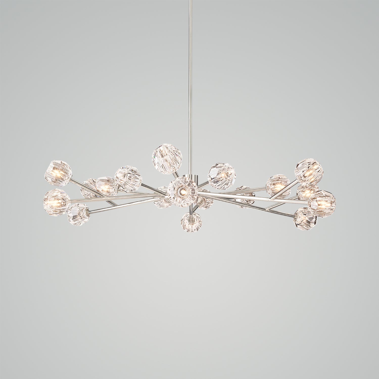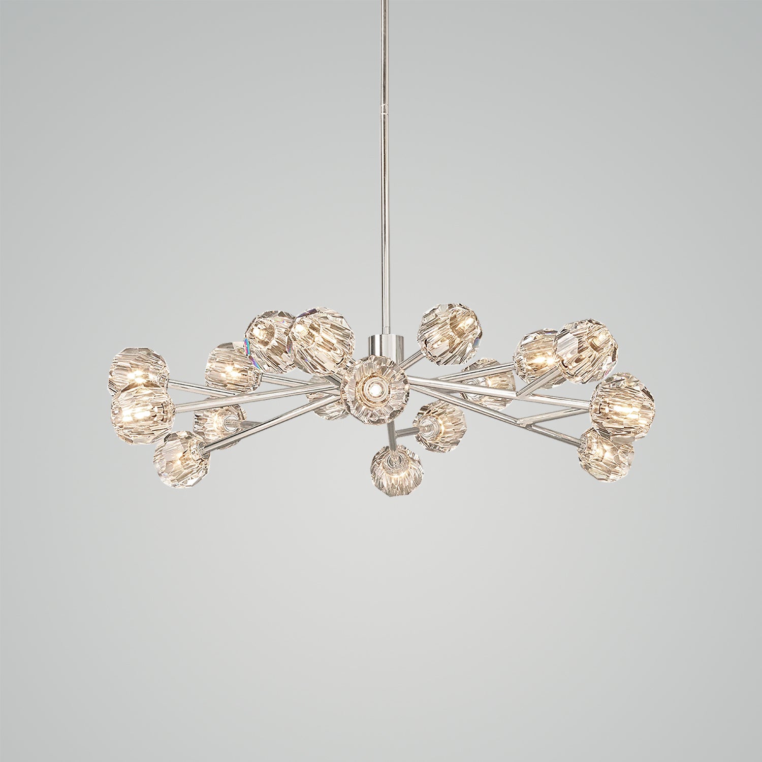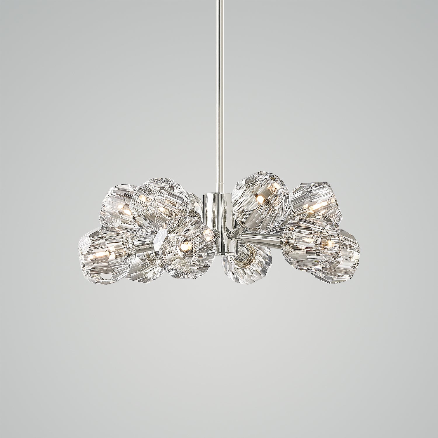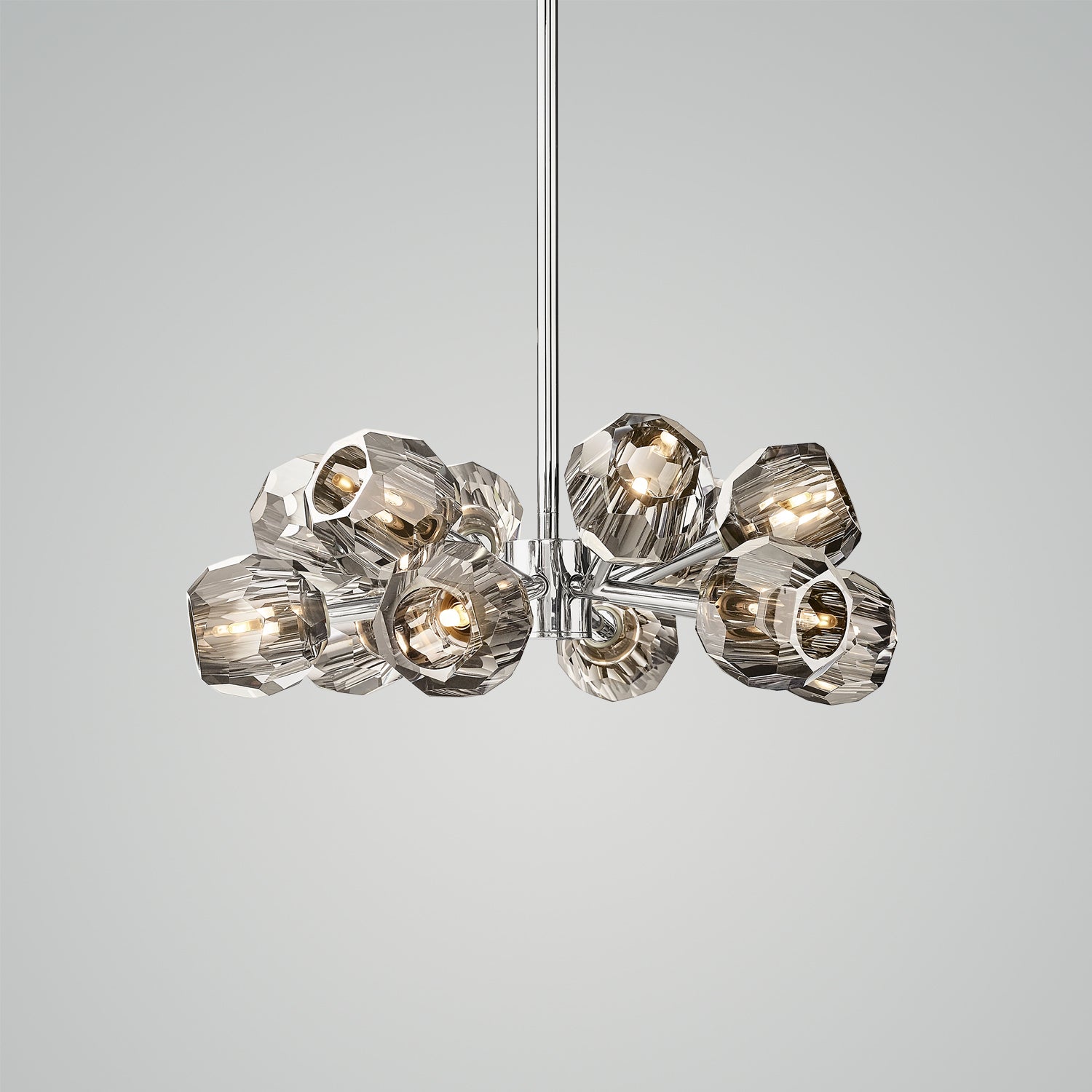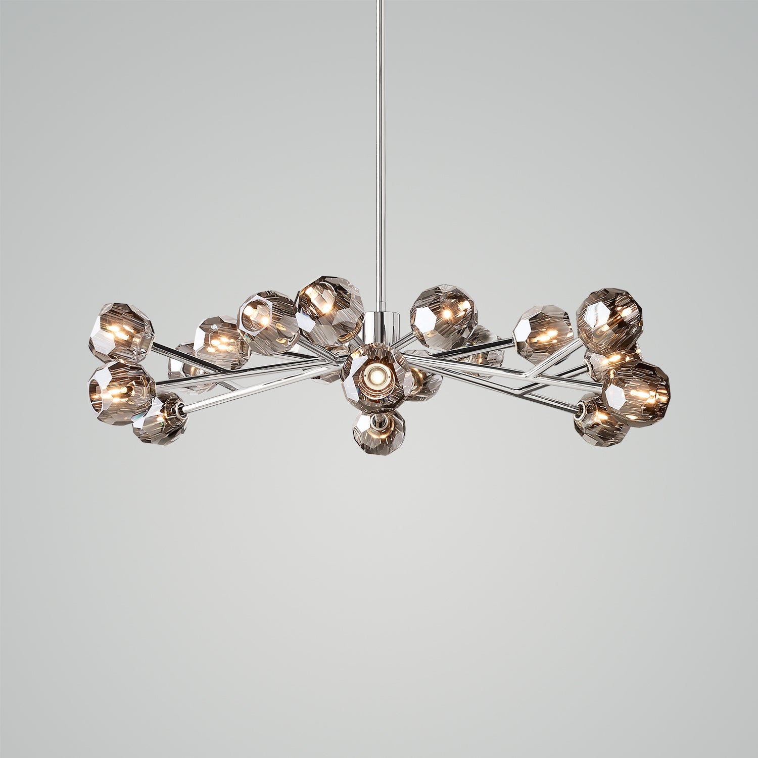 This sculptural fixture is crafted from solid brass and crystal glass, showcasing a passion for luxurious materials and superior craftsmanship. Each finely faceted sphere is hand-ground and polished to reflect and refract light, evoking the minimalist spirit of 1960s design.