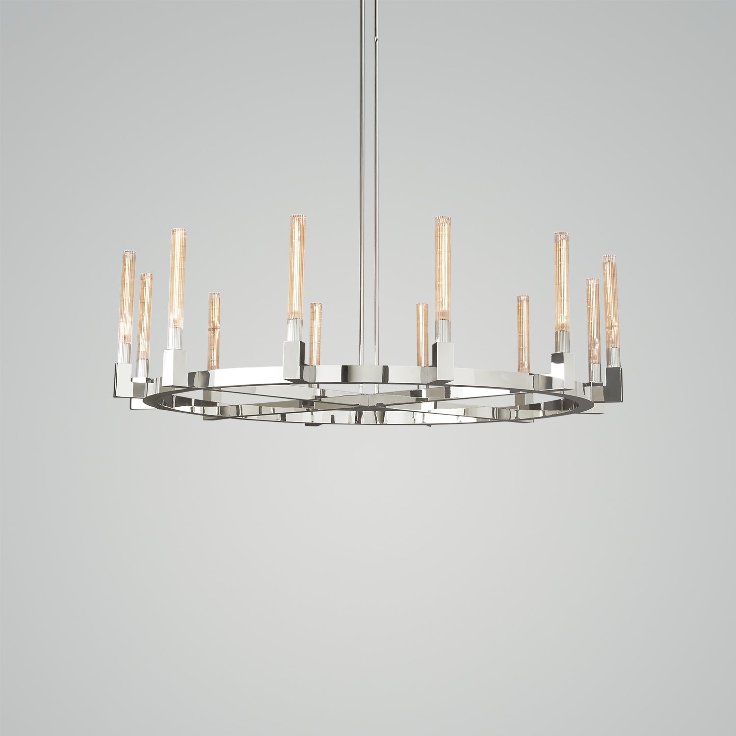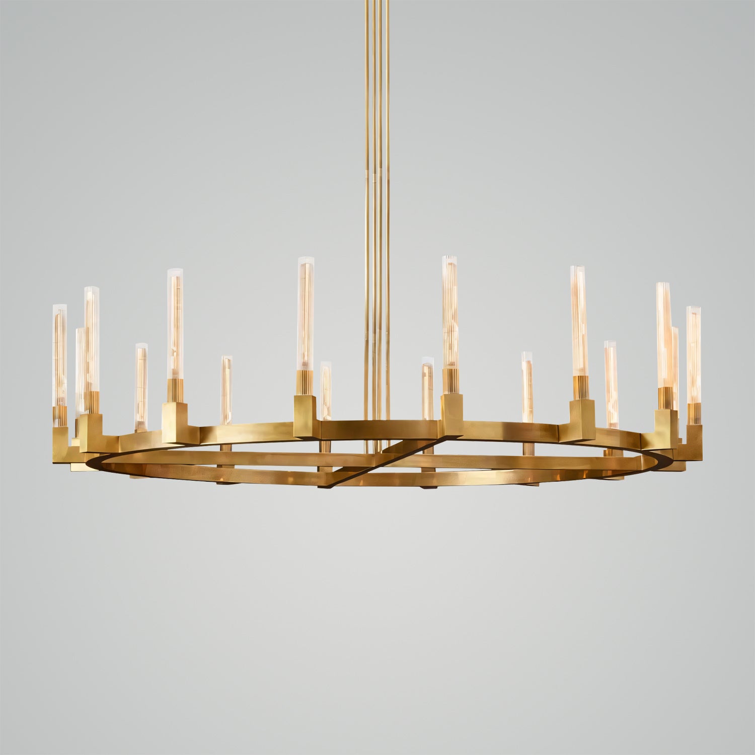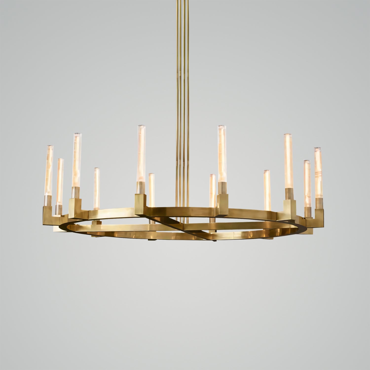 This Beaux Arts chandelier, reinterpreted by a renowned lighting designer, is crafted from solid brass. Defined by its clean lines and sharp angles, the elegant ribbed-glass shades showcase Edison filament bulbs, shimmering with a warm, candlelight-like glow.