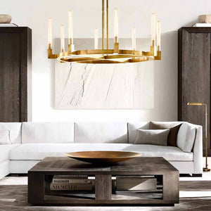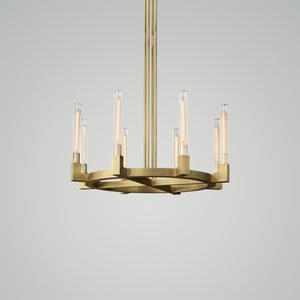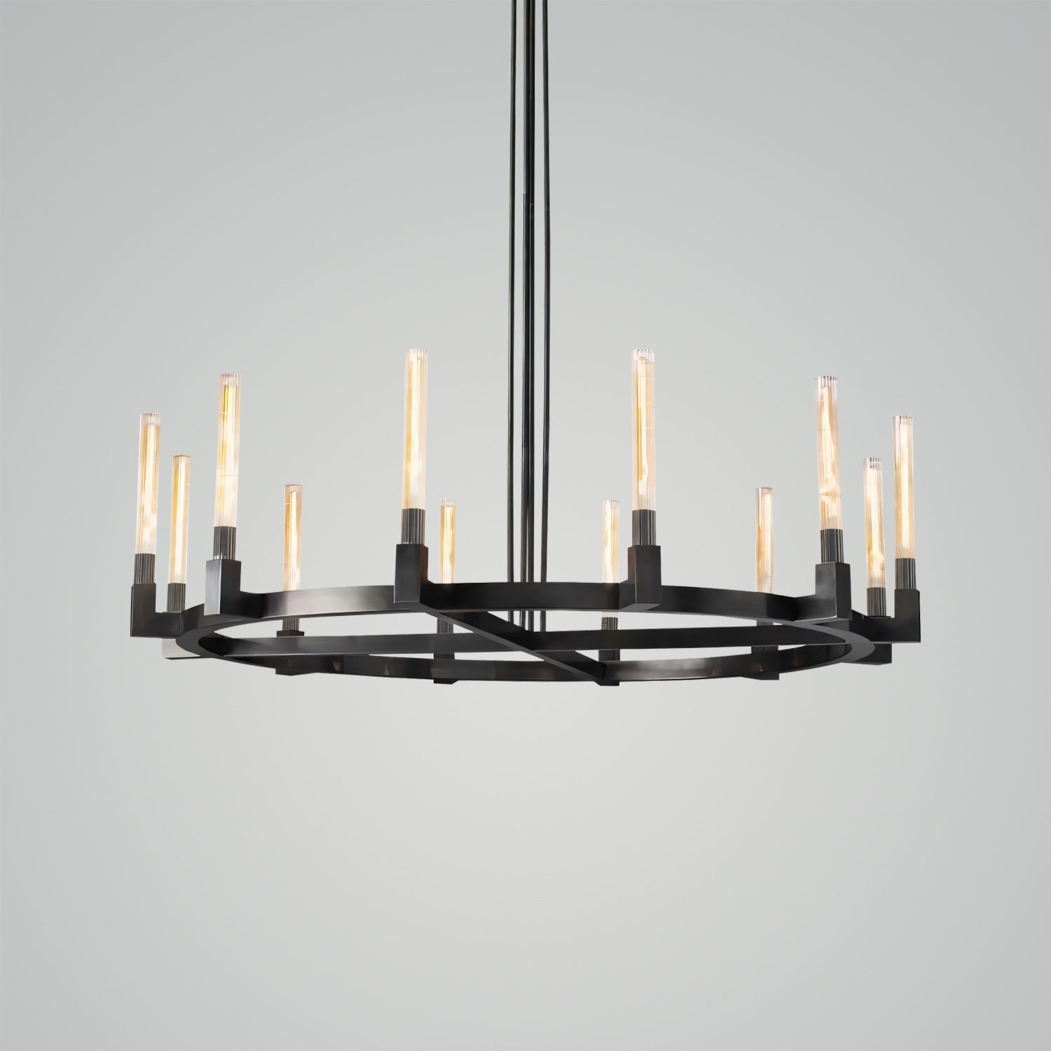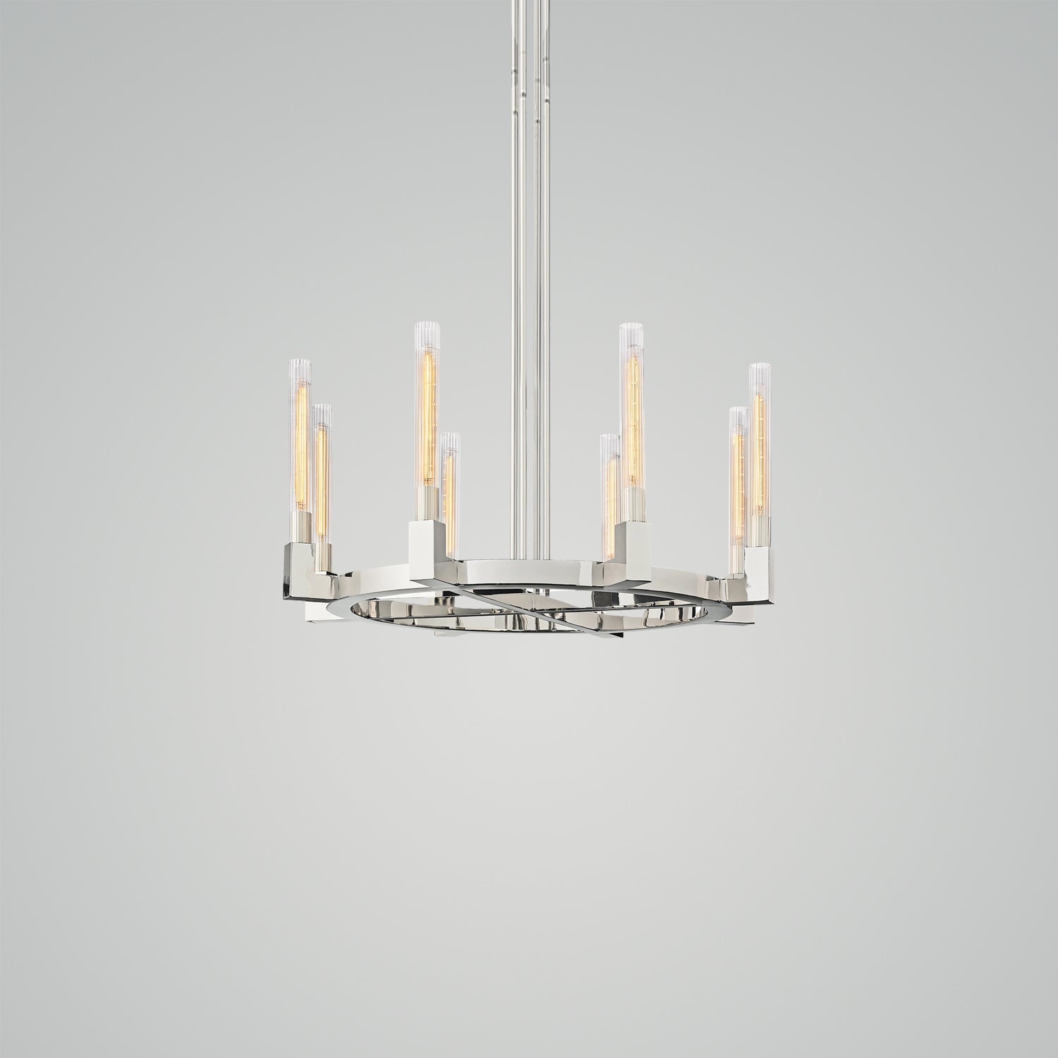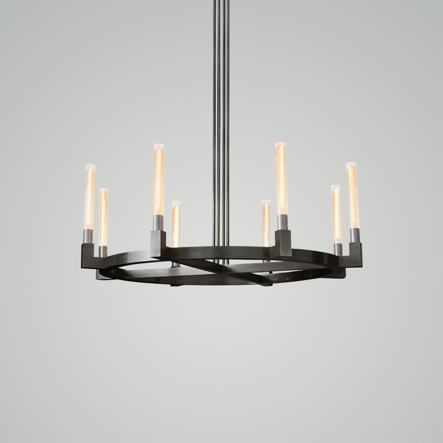 This Beaux Arts chandelier, reinterpreted by a renowned lighting designer, is crafted from solid brass. Defined by its clean lines and sharp angles, the elegant ribbed-glass shades showcase Edison filament bulbs, shimmering with a warm, candlelight-like glow.