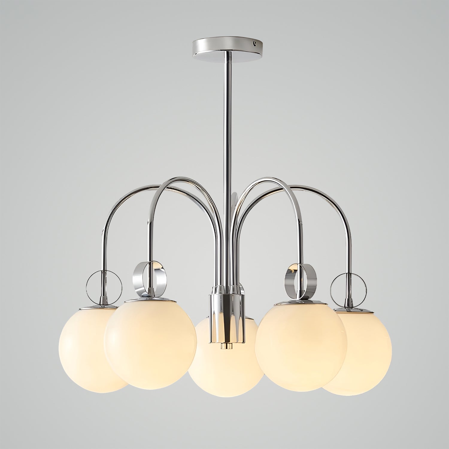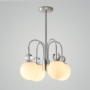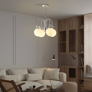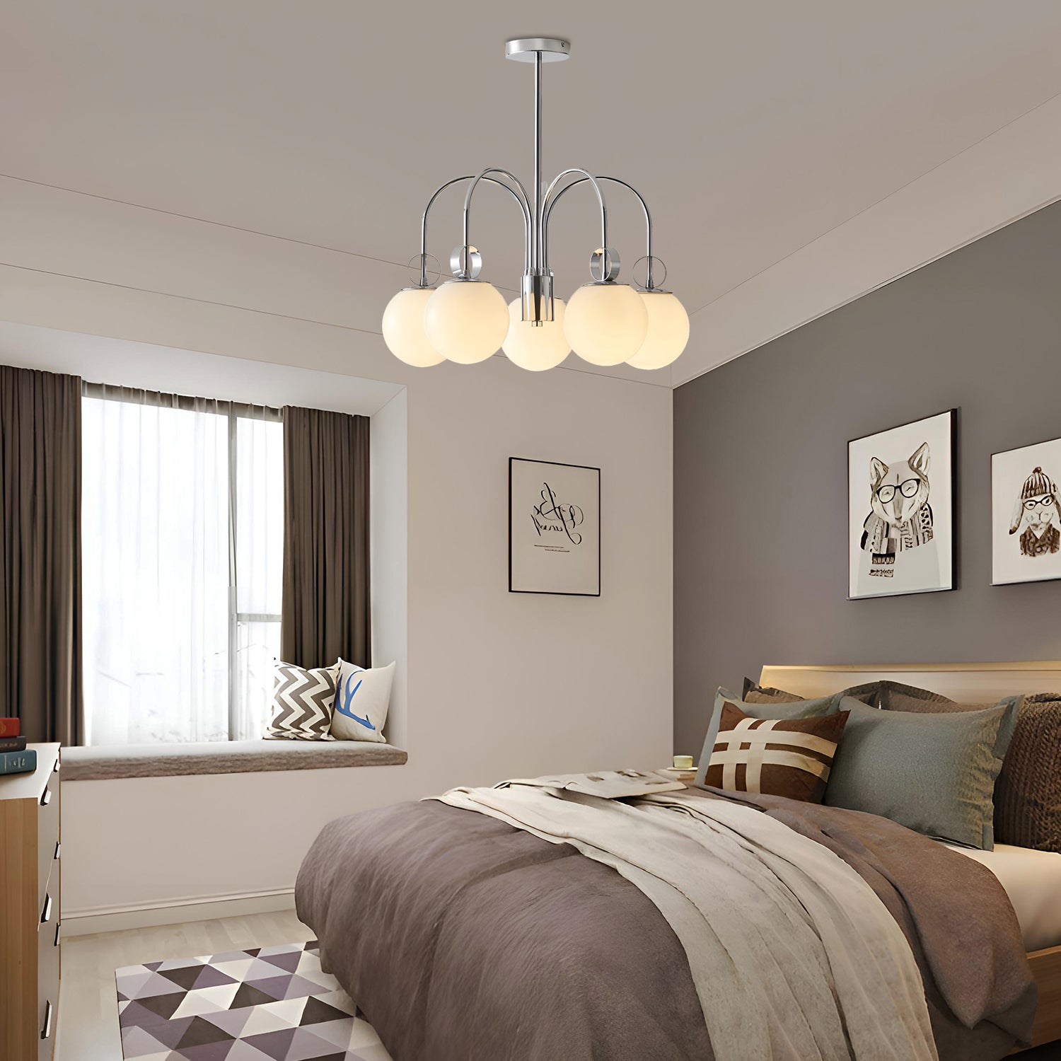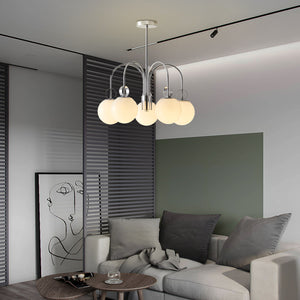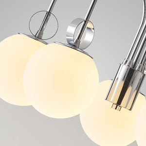 Introducing the "Carisa Collection Chandelier," a striking blend of modern design and soft illumination. This piece features a constellation of glowing orbs, each emitting a warm, milky light that creates an inviting atmosphere in any setting. Gracefully suspended from a sleek chrome canopy, the orbs are arranged in a harmonious cluster that mimics the serene composition of celestial bodies in the night sky. The Luminous Sphere Array Chandelier is the perfect statement piece for those who desire to infuse their living space with a touch of cosmic wonder, coupled with contemporary elegance. Transform your room into a haven of tranquil light with this exquisite fixture.