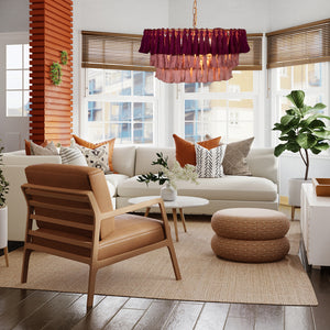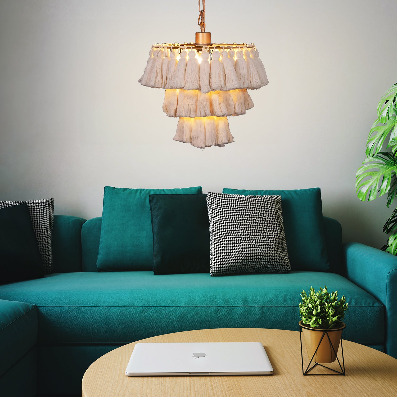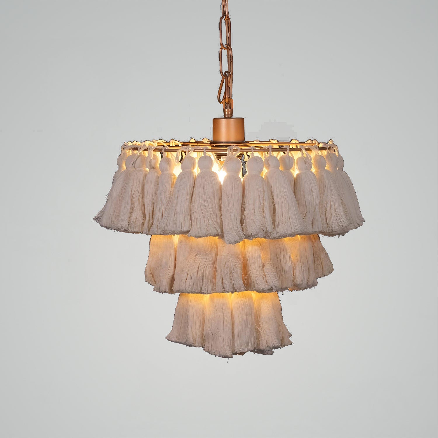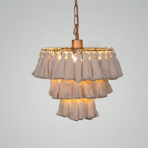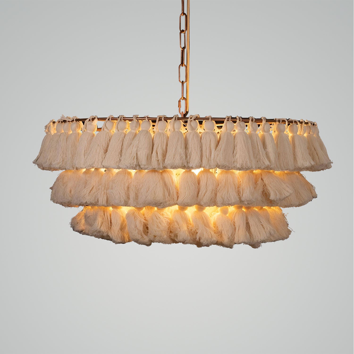Introducing the Fela Tassel Chandelier, a playful yet elegant fixture that brings a soft, textural touch to any space. Draped in layers of delicate blush tassels, this chandelier exudes a cozy, bohemian charm that's both warm and inviting. The cascading design adds a sense of movement and whimsy, while the golden hardware offers a hint of luxury. Perfect for adding a statement to your dining room, living area, or bedroom, the Blush Tassel Tiered Chandelier is sure to become the centerpiece of any room.