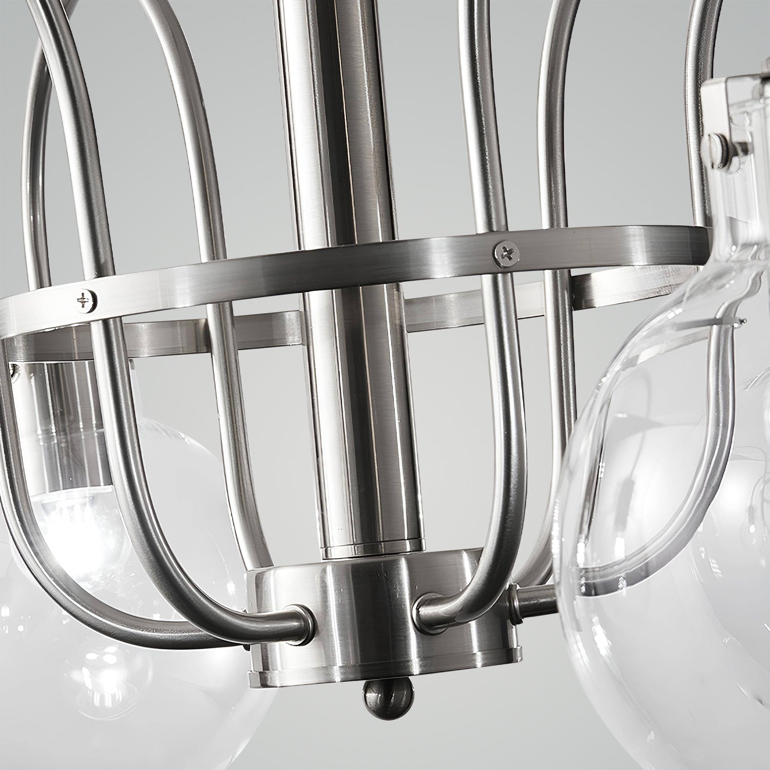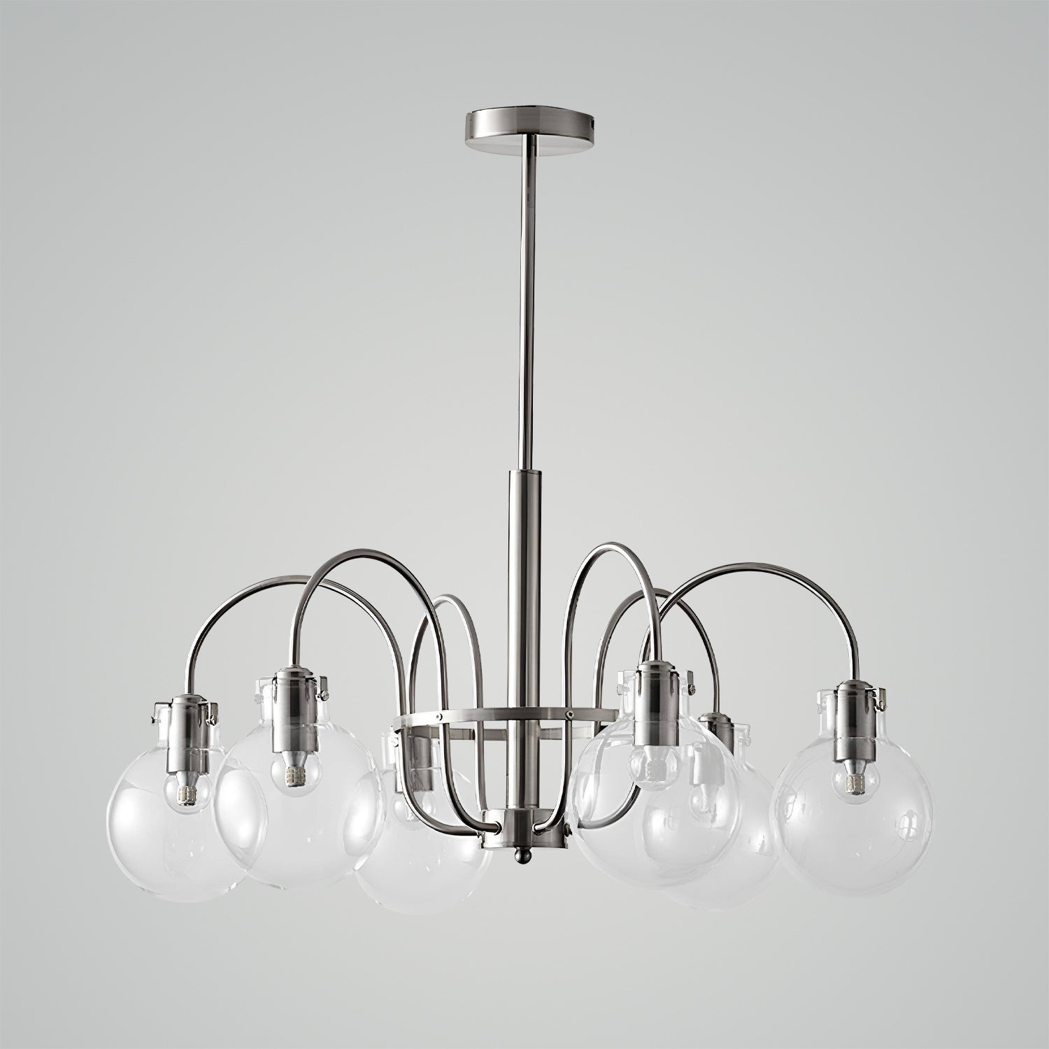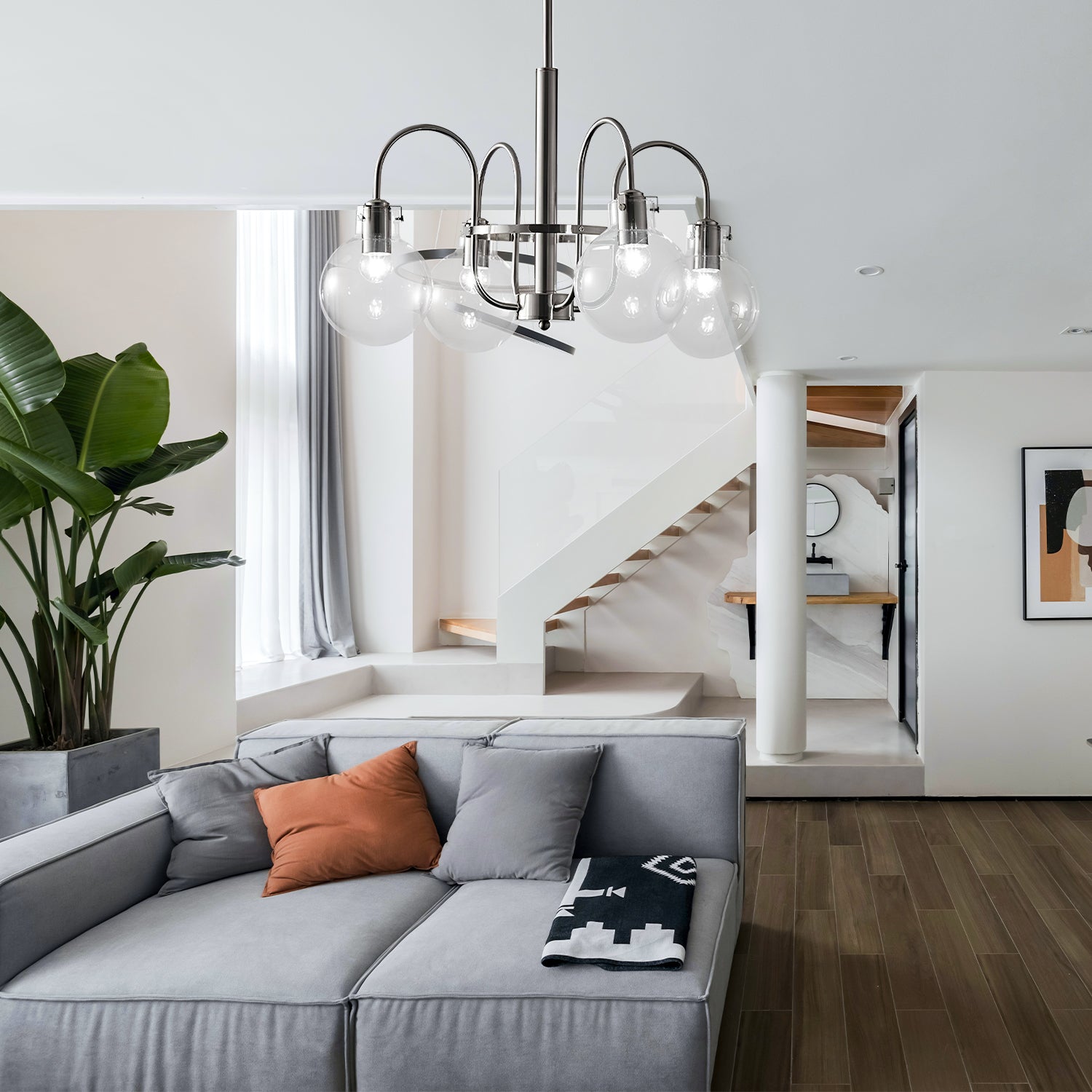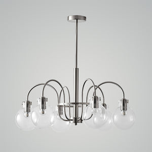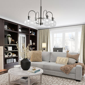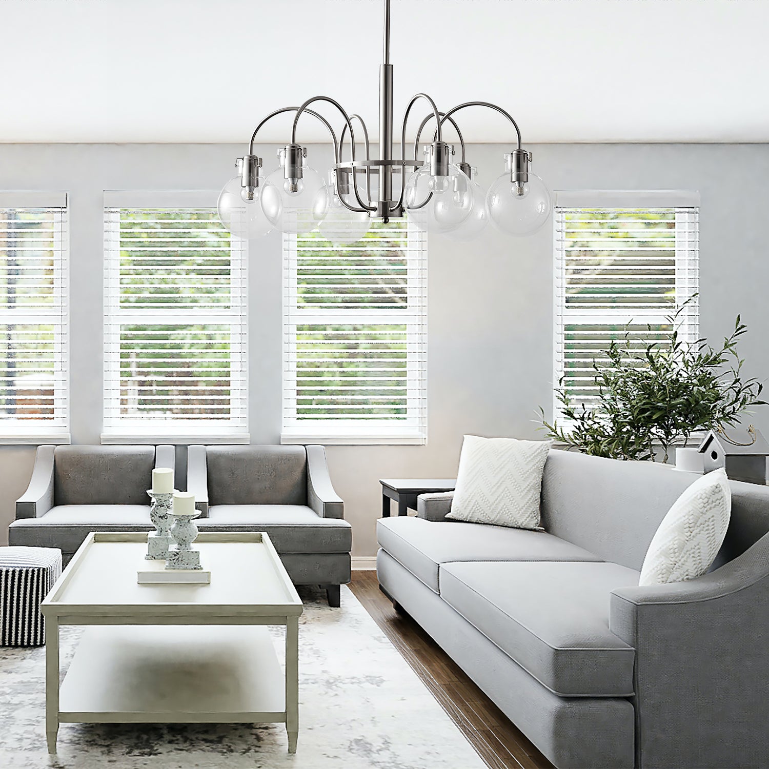Introducing the "Hansford Chandelier," a perfect blend of classic charm and modern elegance. This chandelier features a sleek metallic structure that gracefully holds clear glass bulbs, exuding a warm and inviting light. Its timeless design is reminiscent of the American country style, reimagined for contemporary sensibilities. Ideal for illuminating your dining room, living space, or entryway, the Vintage Radiance Chandelier adds a touch of sophistication and warmth to any setting. Its distinctive design makes it a focal point that will not only brighten your room but also enrich it with a cozy, yet stylish, ambiance. Bring a piece of classic Americana into your home with this beautiful and versatile lighting fixture.