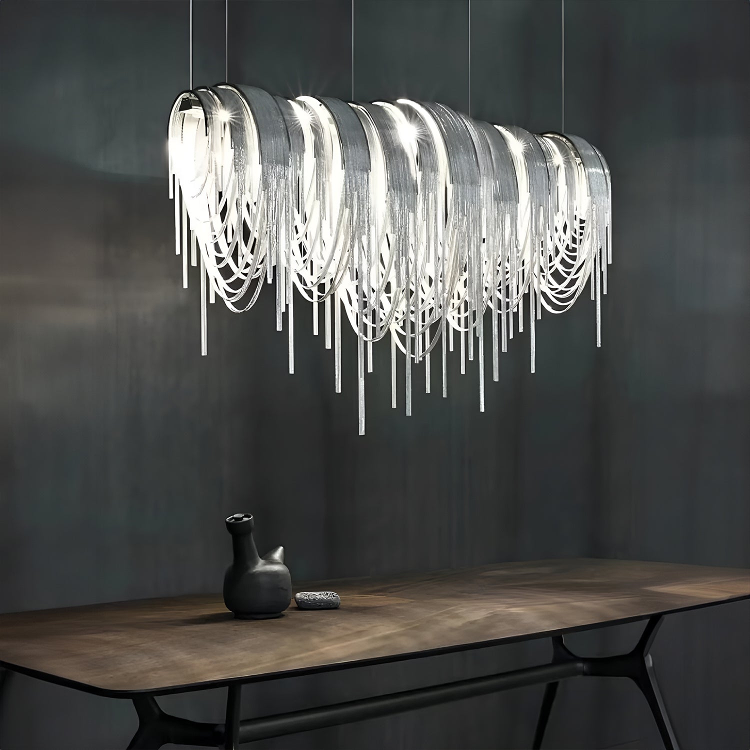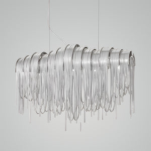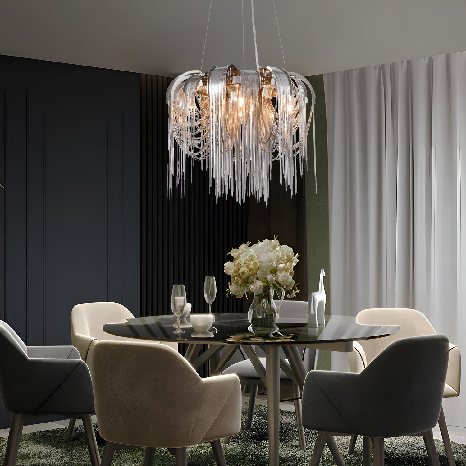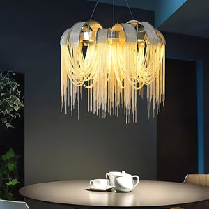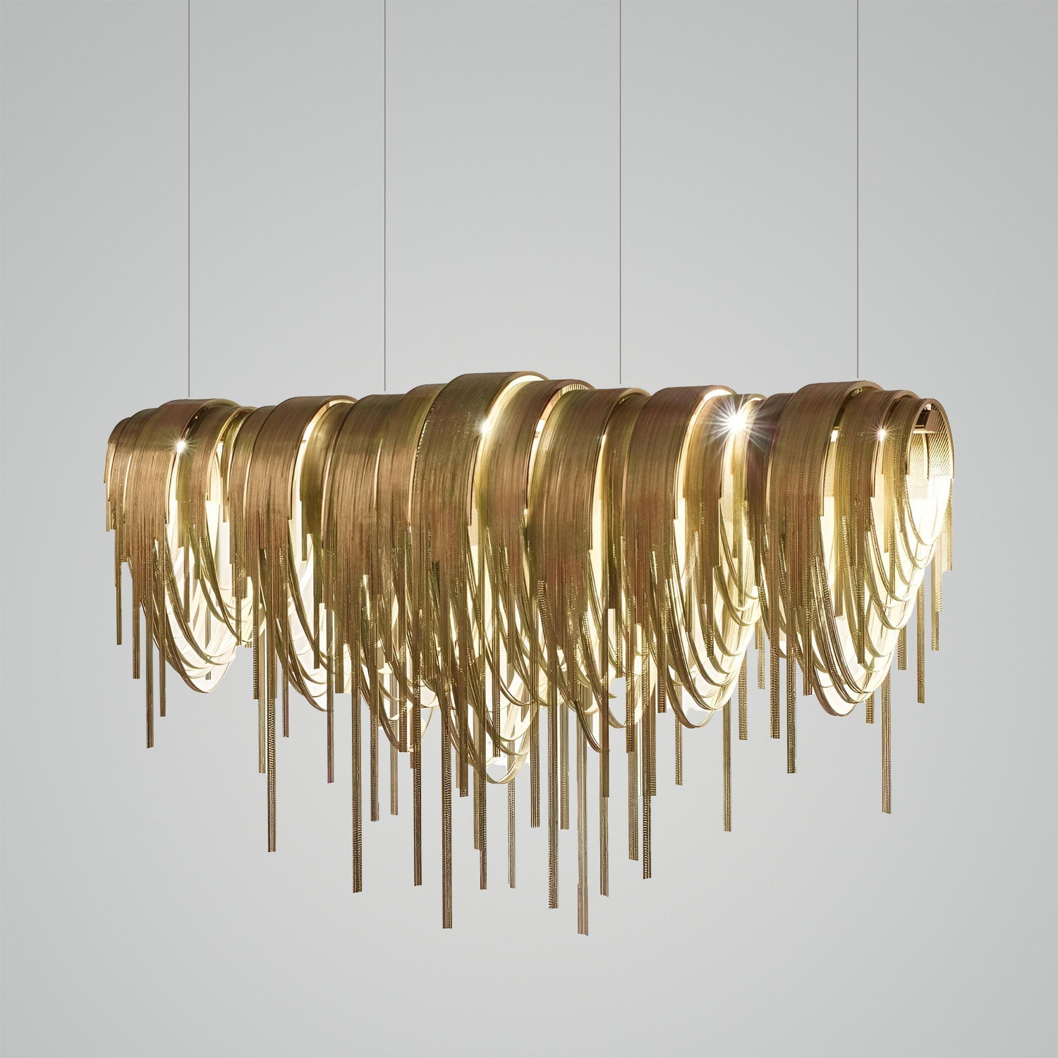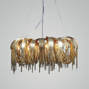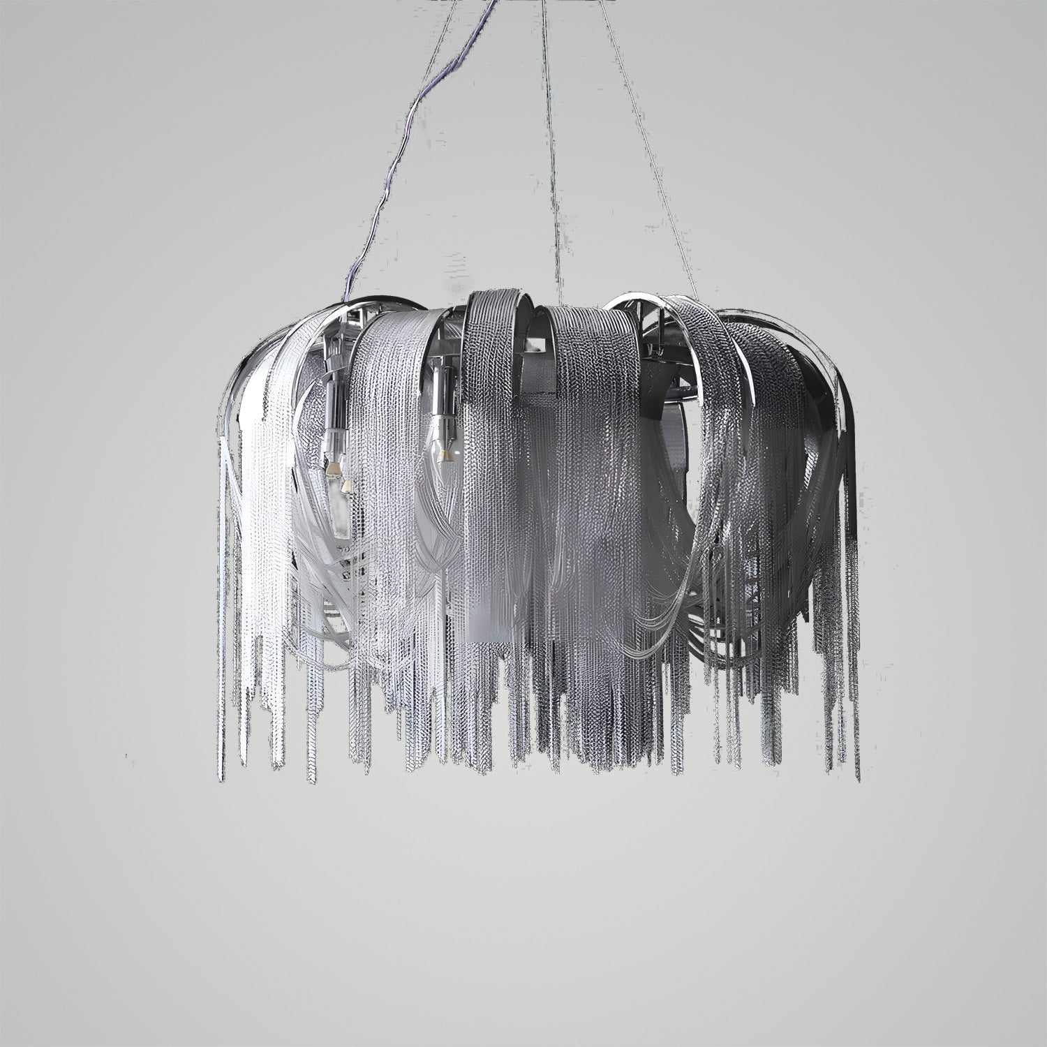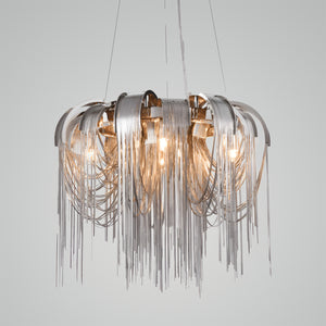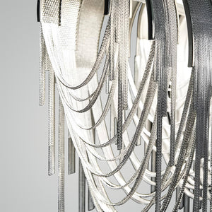 Presenting the 'Length Chains Chandelier', an embodiment of luxurious design and opulent lighting. Crafted with a series of polished metallic rings, this chandelier features a waterfall of shimmering chains that catch and reflect light, creating a spectacular display. Each ring is meticulously positioned to form a graceful cascade, making it a stunning centerpiece that adds a touch of glamour to any sophisticated setting. Perfect for high-end dining rooms or grand entryways, this chandelier promises to bathe your space in a soft, enchanting glow.