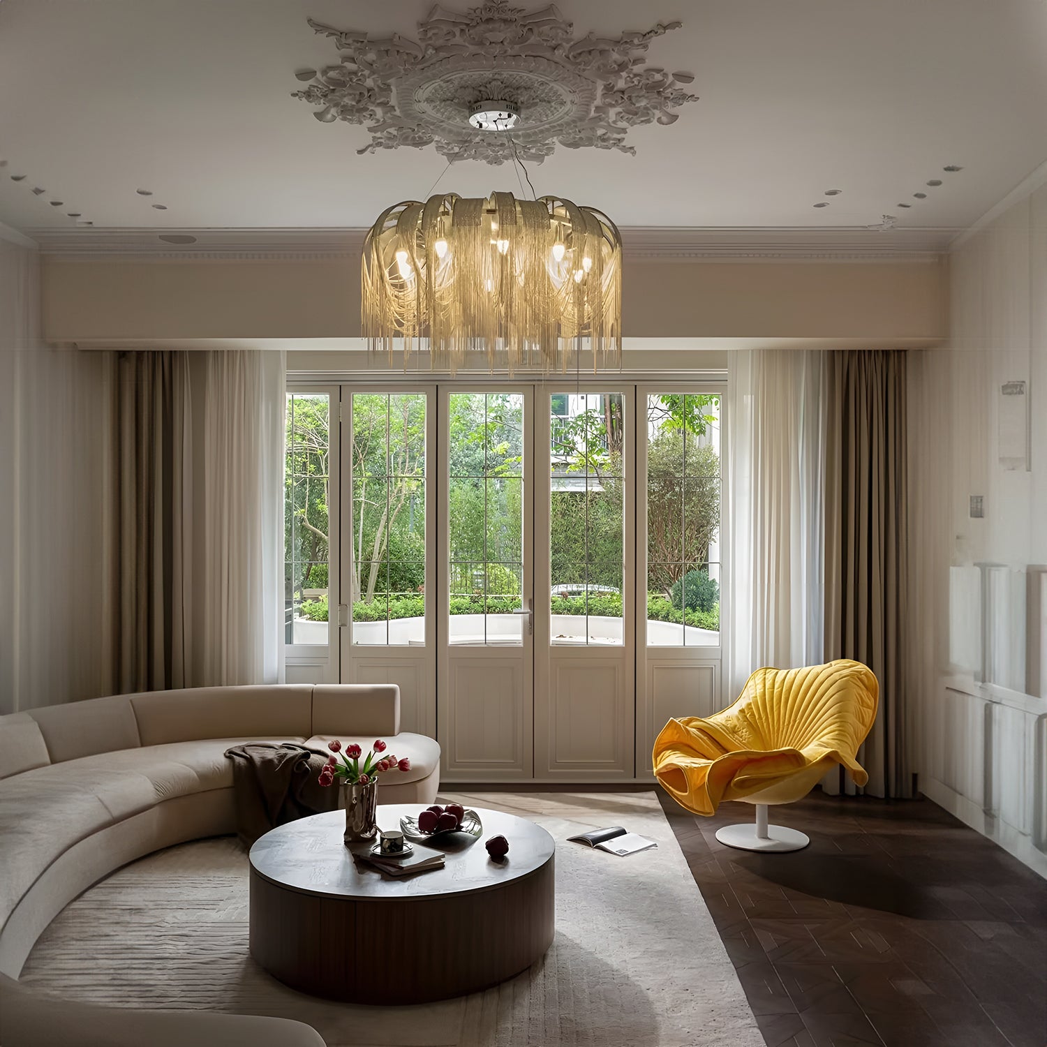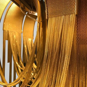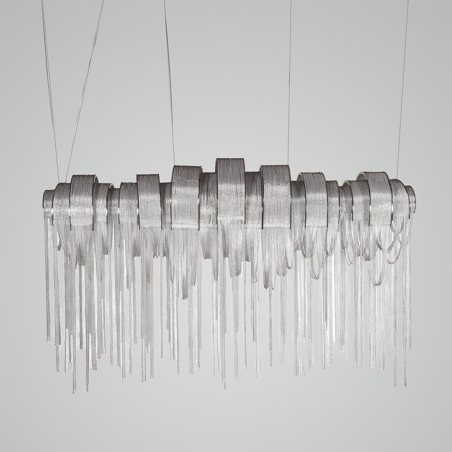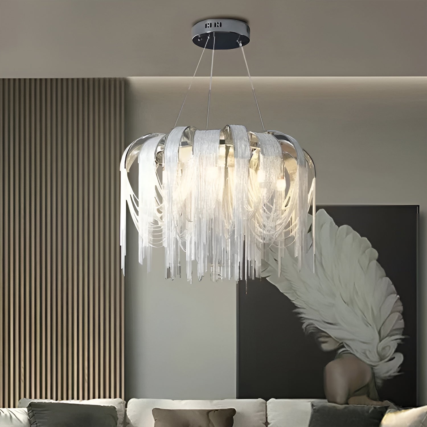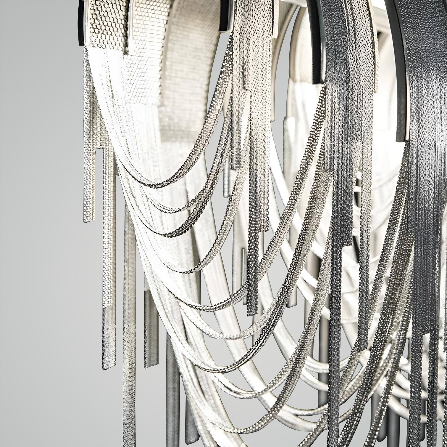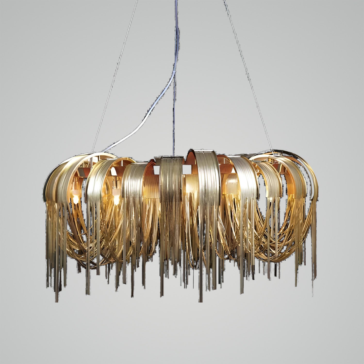Presenting the 'Length Chains Chandelier', an embodiment of luxurious design and opulent lighting. Crafted with a series of polished metallic rings, this chandelier features a waterfall of shimmering chains that catch and reflect light, creating a spectacular display. Each ring is meticulously positioned to form a graceful cascade, making it a stunning centerpiece that adds a touch of glamour to any sophisticated setting. Perfect for high-end dining rooms or grand entryways, this chandelier promises to bathe your space in a soft, enchanting glow.