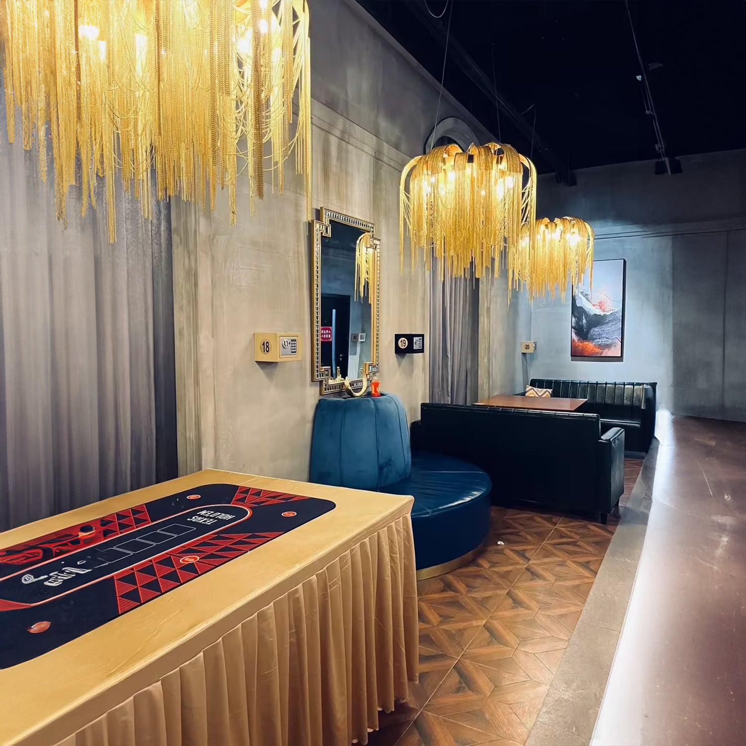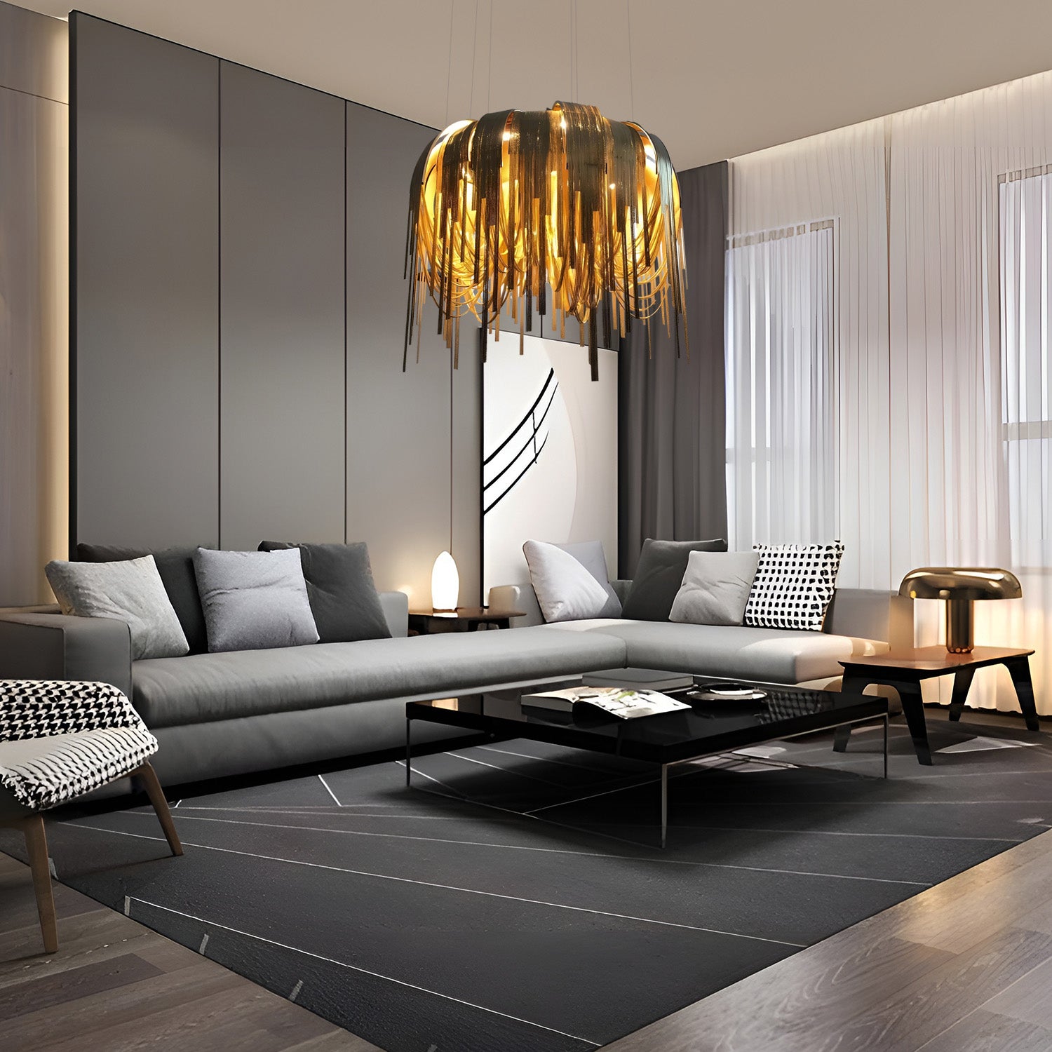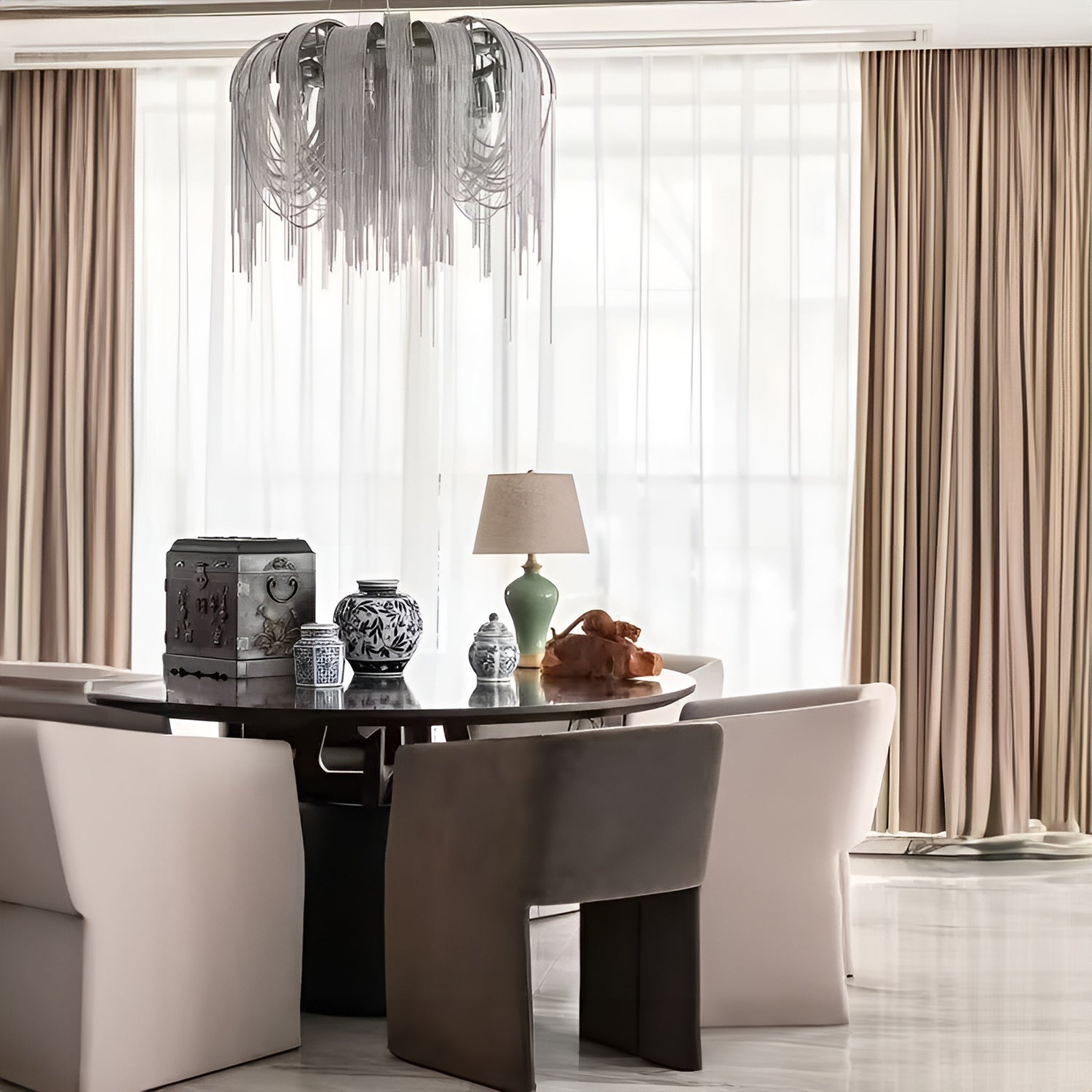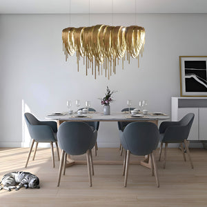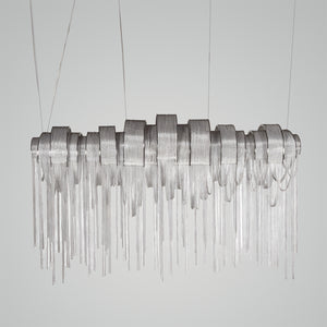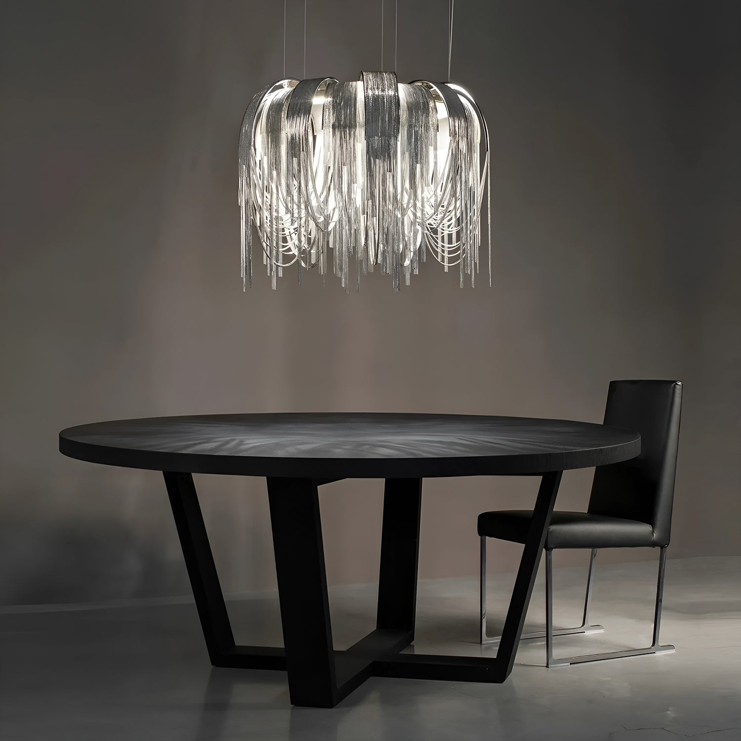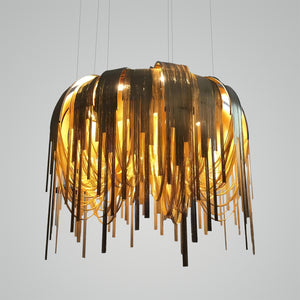Presenting the 'Length Chains Chandelier', an embodiment of luxurious design and opulent lighting. Crafted with a series of polished metallic rings, this chandelier features a waterfall of shimmering chains that catch and reflect light, creating a spectacular display. Each ring is meticulously positioned to form a graceful cascade, making it a stunning centerpiece that adds a touch of glamour to any sophisticated setting. Perfect for high-end dining rooms or grand entryways, this chandelier promises to bathe your space in a soft, enchanting glow.