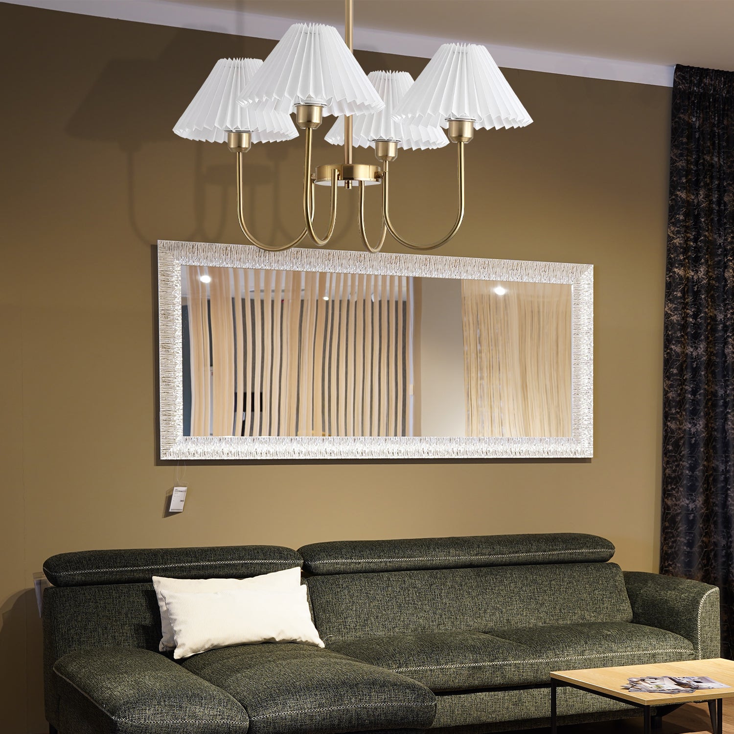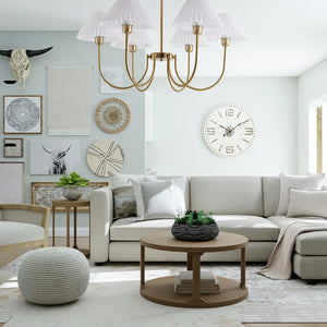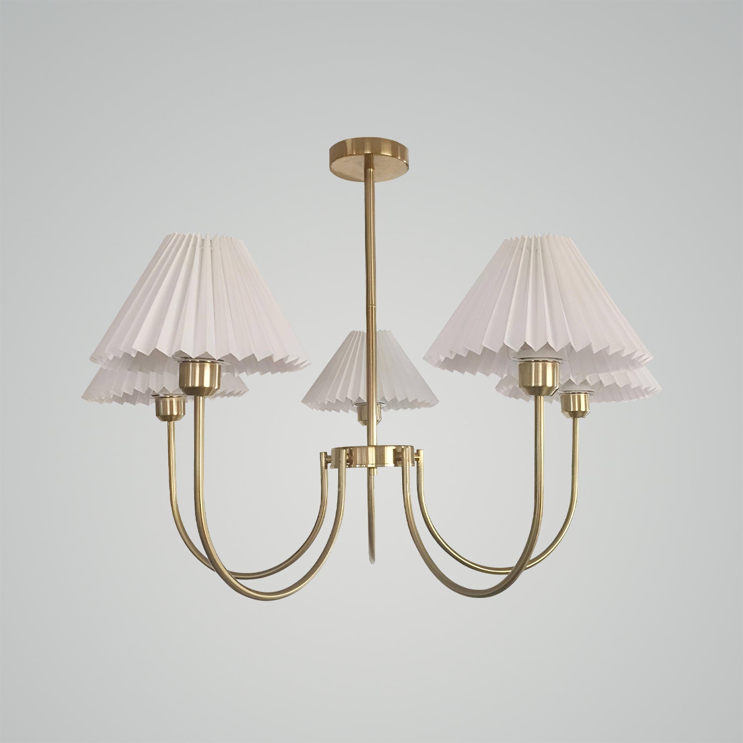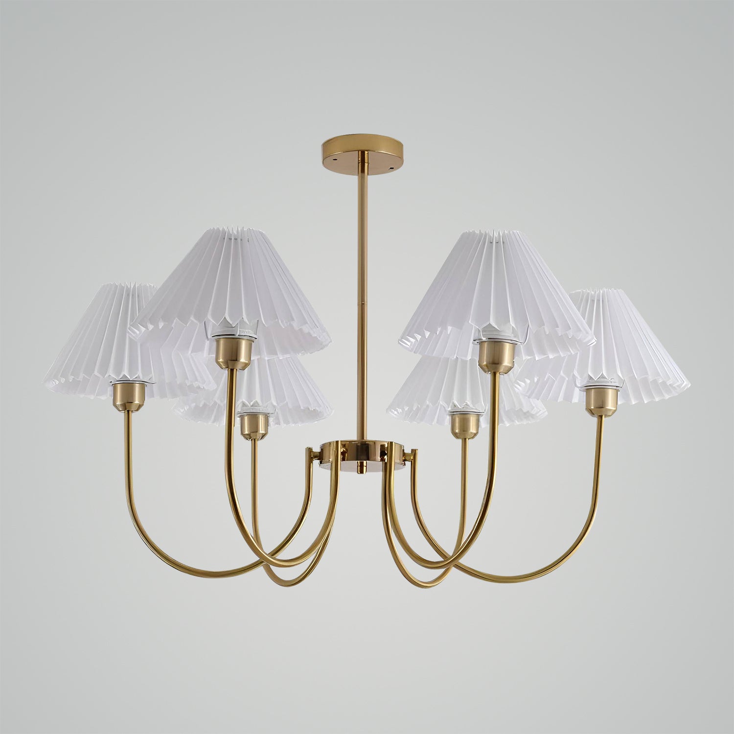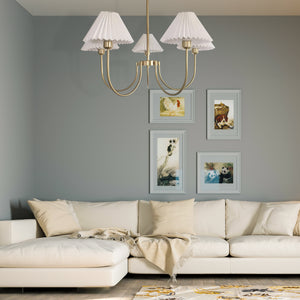 Unveiling the "Lenore Pleated Chandelier," a harmonious blend of traditional American country style with a touch of contemporary finesse. The chandelier features a series of white pleated shades, gracefully arranged to diffuse light softly and evenly throughout the room. Each shade is supported by a sleek, golden arm that culminates in a central hub, exuding sophistication and a warm, welcoming ambiance. This chandelier is perfect for those who appreciate the charm of country living but want to maintain a modern edge in their home décor. Whether it's hung in your dining area, living room, or foyer, the Classic Elegance Pleated Chandelier is sure to become a centerpiece that complements your interior with its timeless design and chic allure.