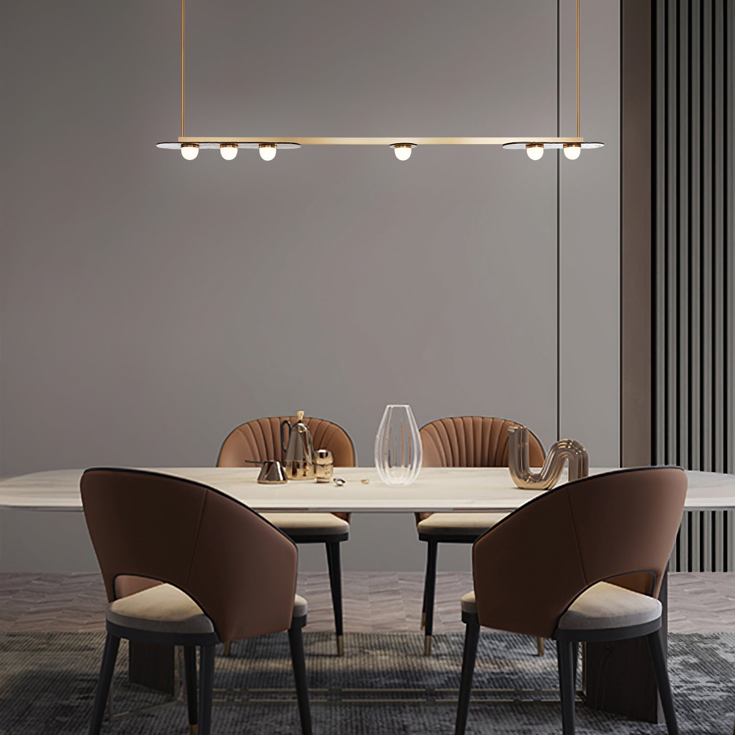 Introduce the epitome of modern elegance with the 'MODULO Chandelier - Aureate Horizon Linear Chandelier.' This sophisticated piece features a golden framework with horizontal lines that stretch gracefully over your dining table or kitchen island. Adorned with textured glass shades, it casts a soft, diffused light that brings a warm, inviting ambiance to any contemporary space. The sleek design and elongated form make it a perfect statement piece for those who appreciate minimalist luxury with a touch of grandeur. Elevate your interior with the radiant charm of the Aureate Horizon Linear Chandelier and bask in the glow of modern sophistication.