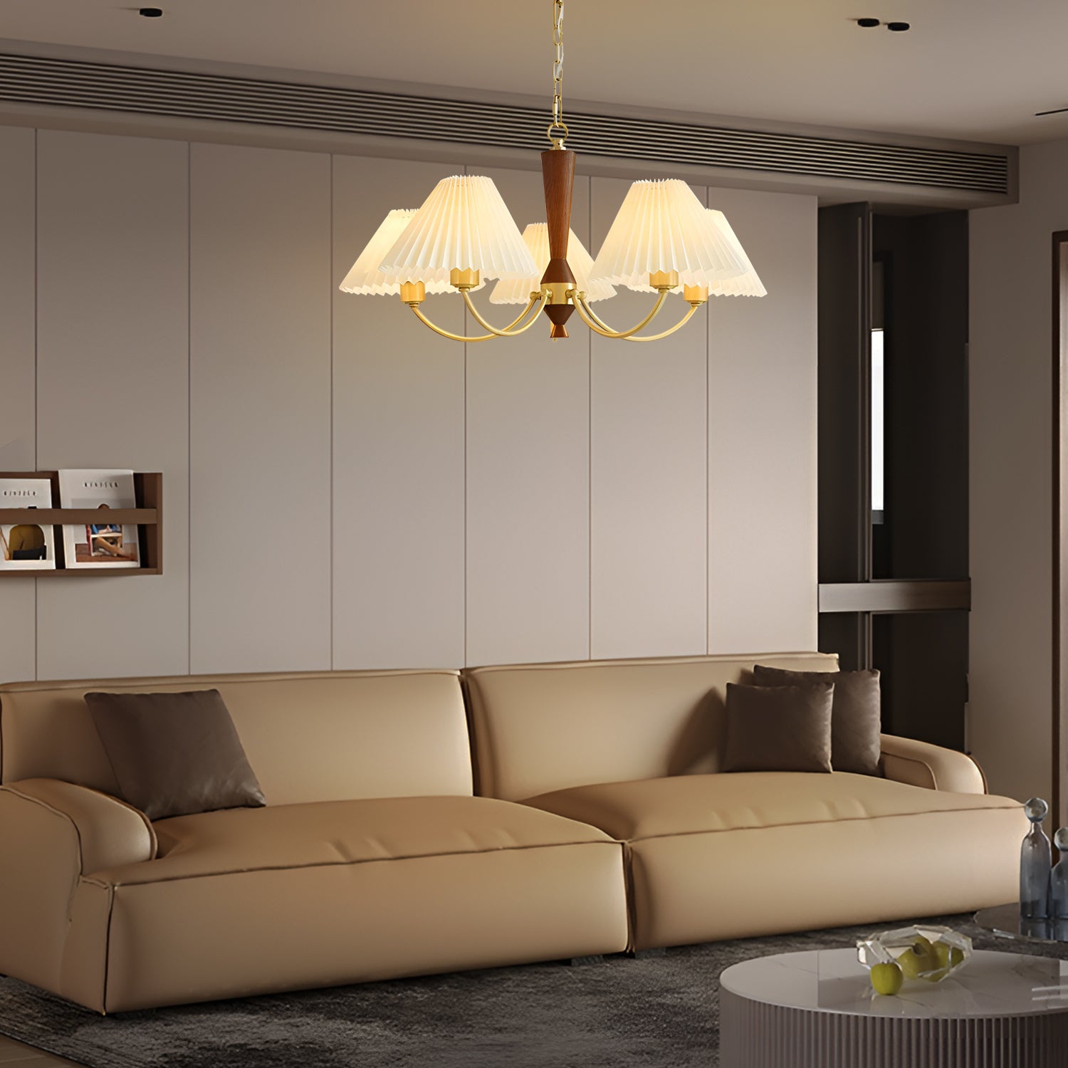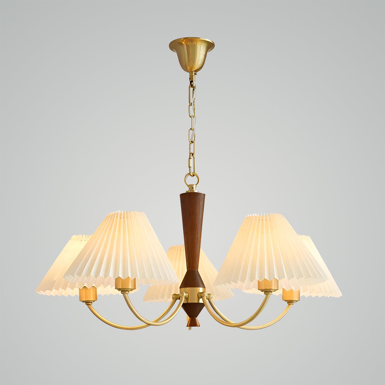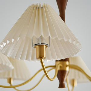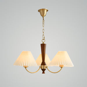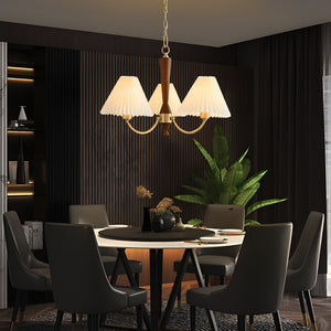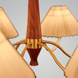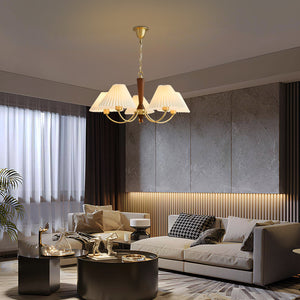 Introducing the "Polina Chandelier" – a timeless centerpiece that brings a touch of elegance and warmth to any room. With its exquisite wood grain finish and softly pleated fabric shades, this chandelier exudes a classic charm that complements both traditional and contemporary decor. The golden accents and graceful curves add a luxurious feel, while the soothing light filters through the pleated fabric to create a cozy, inviting atmosphere. Ideal for a grand dining room, a serene bedroom, or a welcoming foyer, the Classic Radiance Chandelier is sure to enhance your home with its enduring beauty and gentle illumination. Transform your space into a haven of style and comfort with this stunning lighting fixture.
