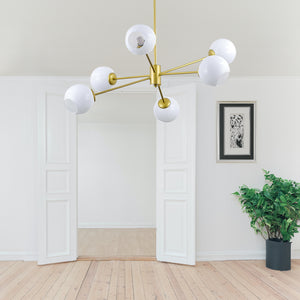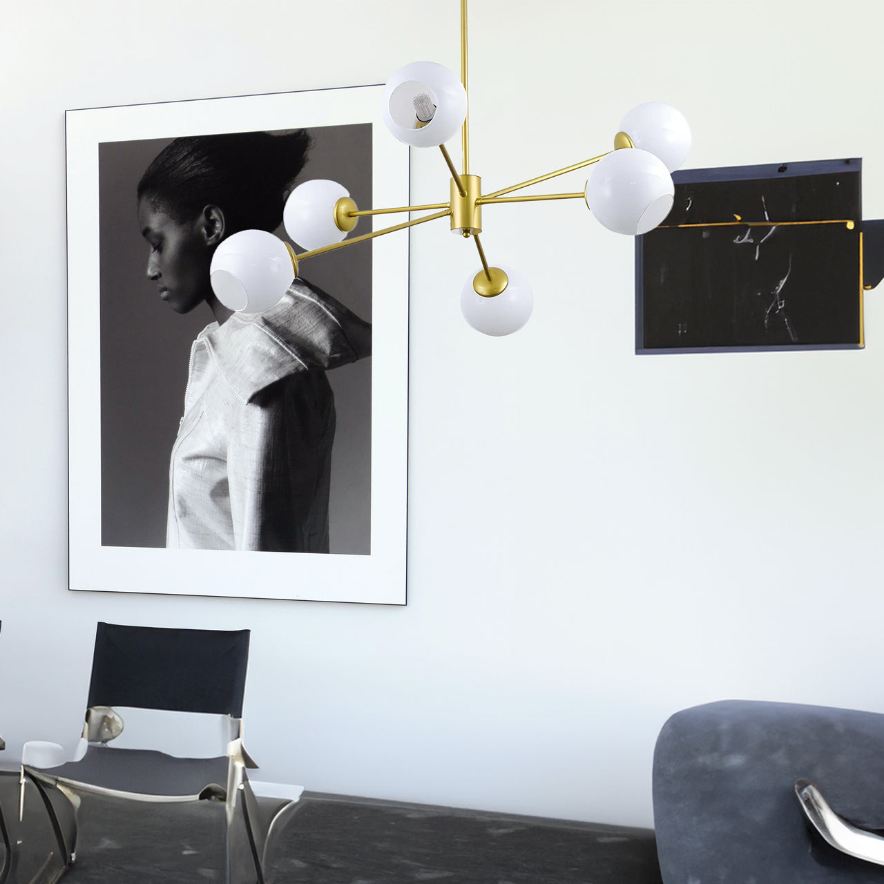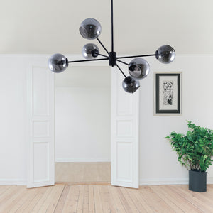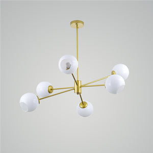Meet the "Staggered Glass 6-Light Chandelier" – a statement piece that artfully embodies the fusion of science and design. This sculptural light fixture draws inspiration from the intriguing shapes of molecular forms, finished in a sleek metallic sheen that brings a futuristic edge to any interior. Each orb reflects light in a unique pattern, creating a dynamic play of illumination and shadow. The Quantum Gleam is not just a light source; it's a conversation starter, designed to captivate and illuminate your space with its modern, reflective elegance. Perfect for those who appreciate the beauty in complexity and seek to bring a touch of avant-garde artistry to their home.