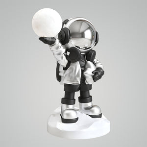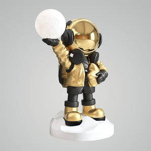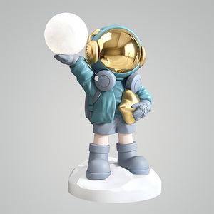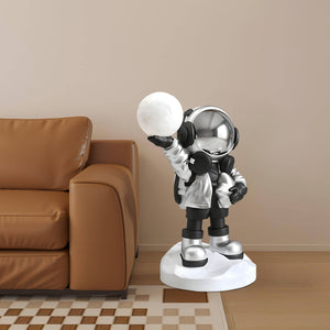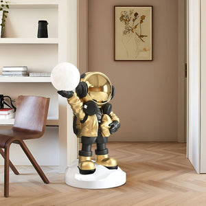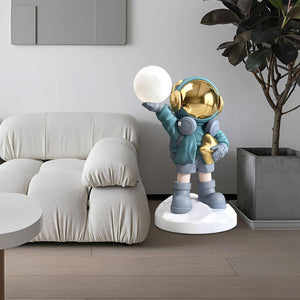 Embark on a journey to the stars with the Apollo Astronaut Floor Lamp, where playful design meets cosmic wonder. This whimsical lamp features a charming astronaut figure holding a luminous globe, evoking the boundless curiosity and adventure of space exploration. Clad in a pastel blue suit with golden accents, this astronaut adds a touch of interstellar magic to any room. The Cosmo Explorer Floor Lamp is a perfect addition for those who dream of galaxies far away or anyone looking to add a unique, imaginative touch to their living space. It's not only a source of light but a conversation starter that will delight and inspire star gazers and dreamers of all ages. Let the Cosmo Explorer illuminate your home and your imagination, creating a playful and well-lit nook in your own personal universe.