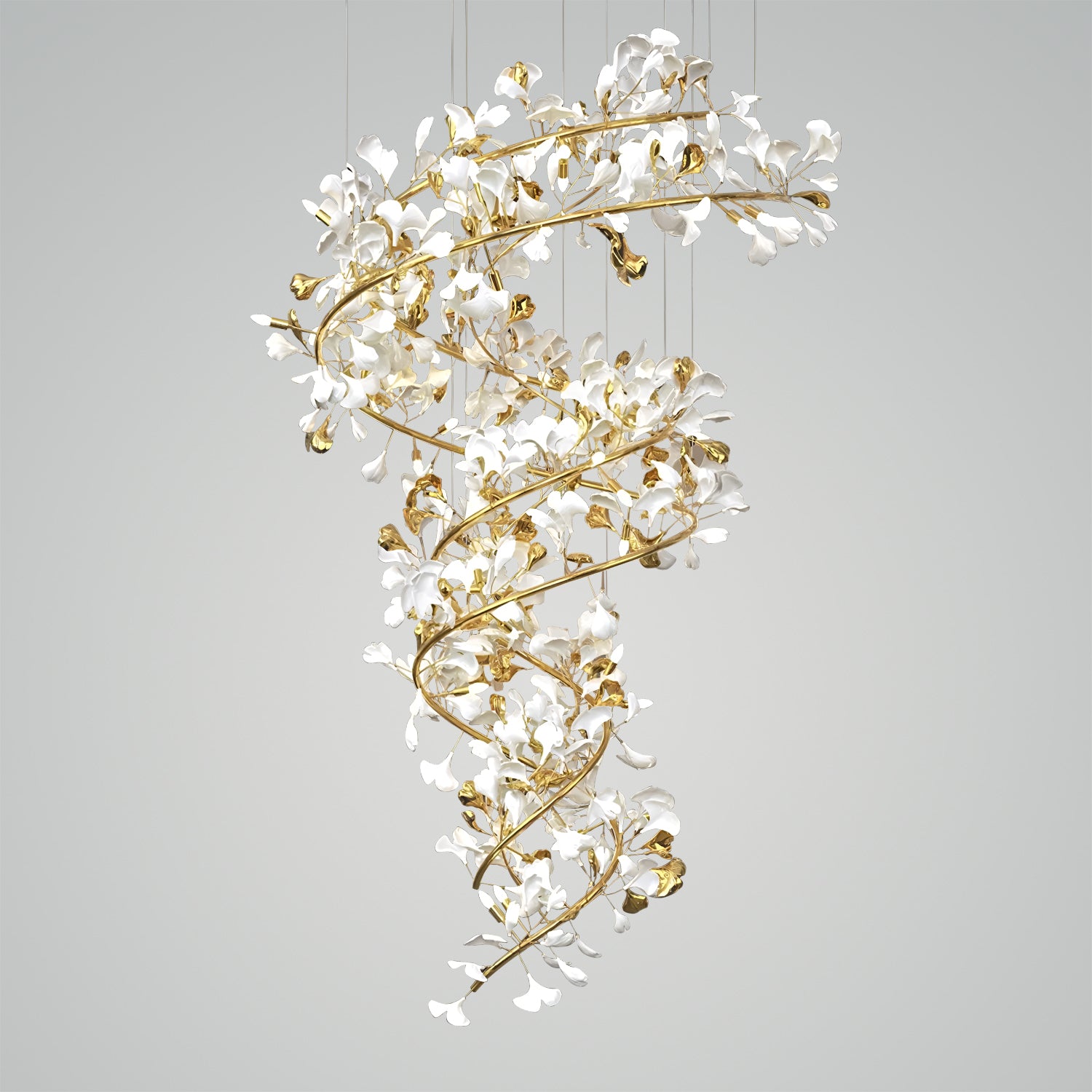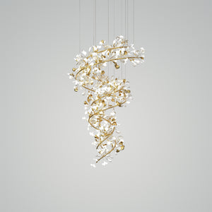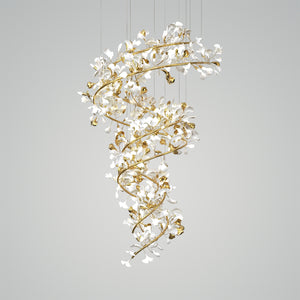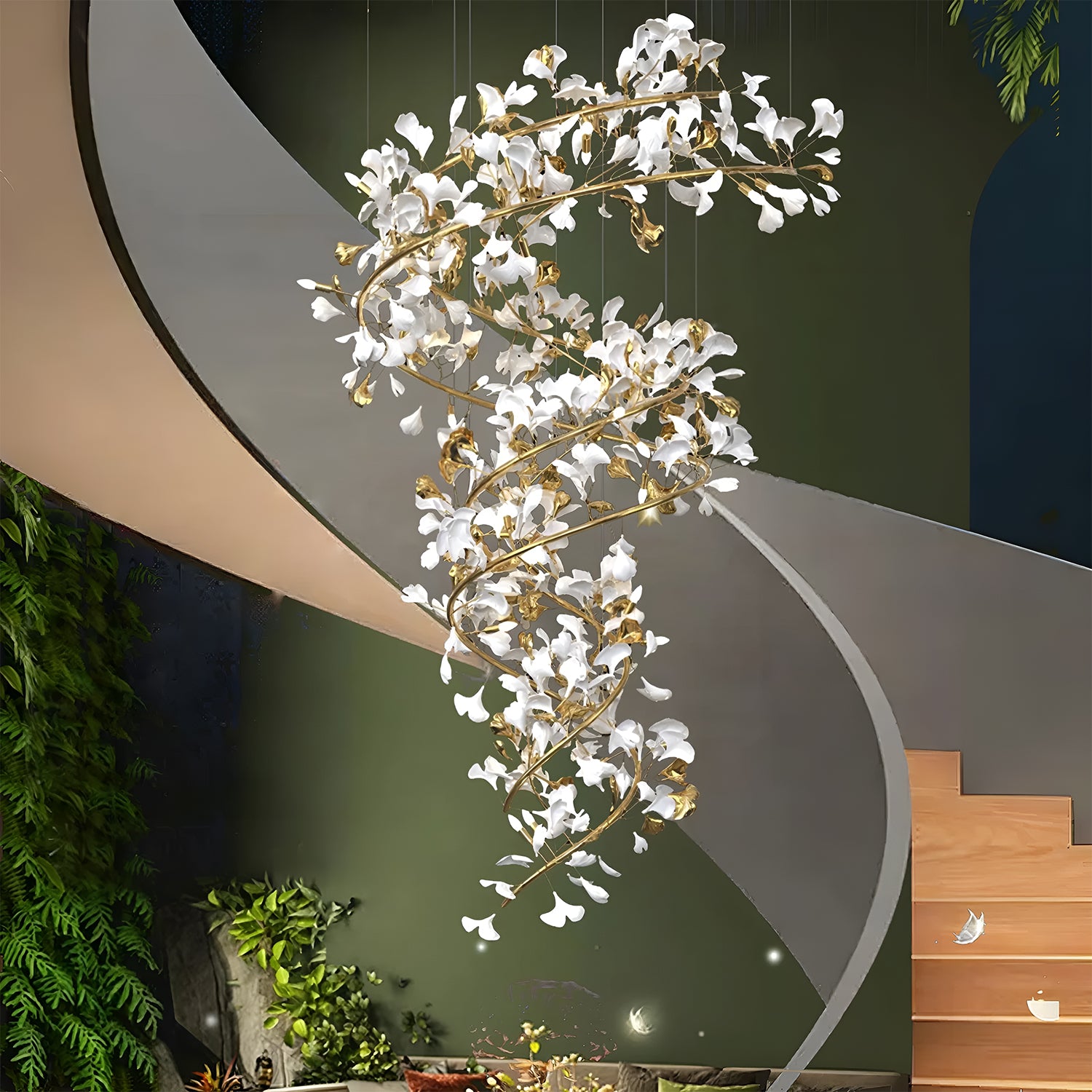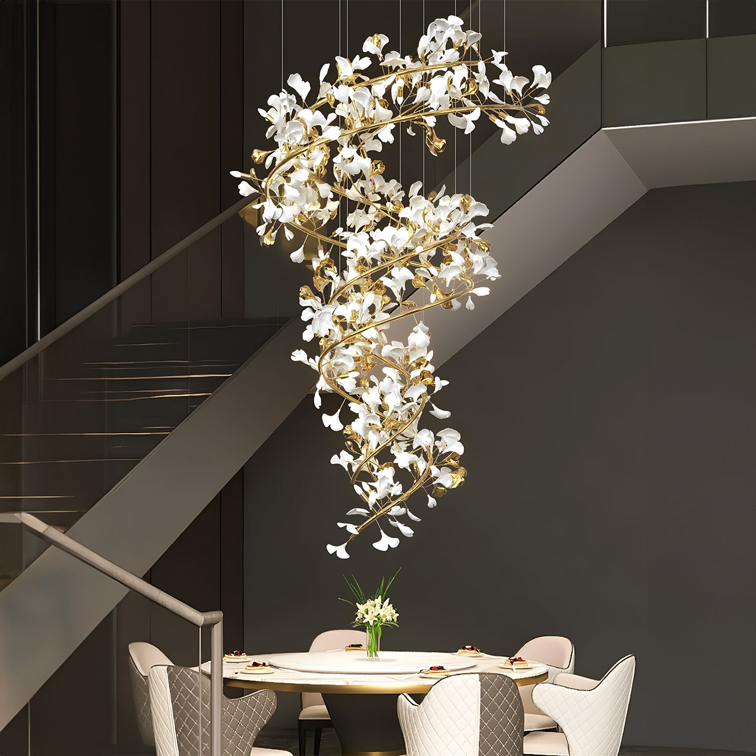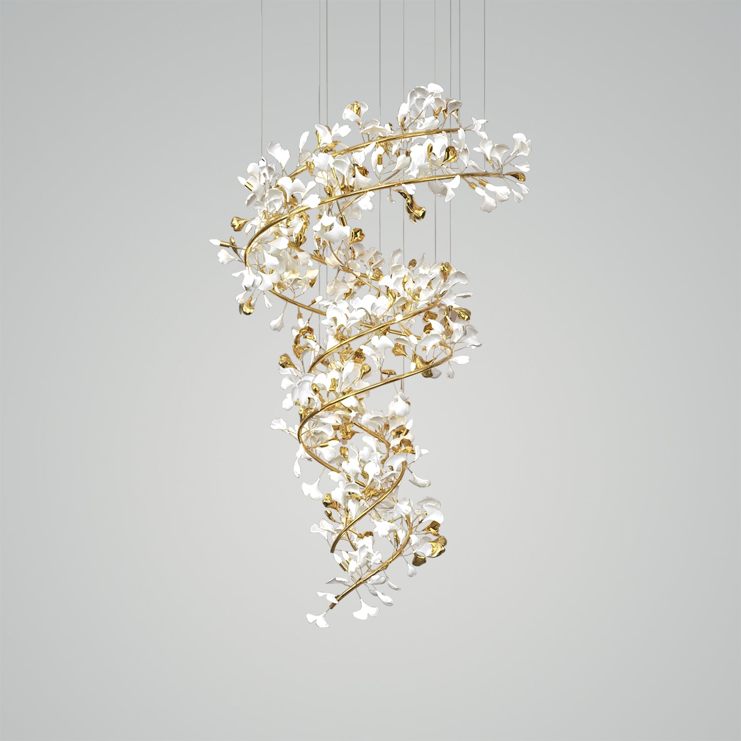 Elevate your space with the enchanting Golden Gingko Spiral Chandelier. Inspired by the delicate beauty of ginkgo leaves, this chandelier features a stunning spiral design that cascades gracefully, creating a captivating focal point in any room. The harmonious blend of white and gold elements adds a touch of elegance and sophistication, making it perfect for luxurious interiors. Illuminate your home with the warm, ambient glow of this exquisite piece and experience the perfect fusion of art and functionality. Ideal for grand foyers, living rooms, or dining areas, the Golden Gingko Spiral Chandelier is a statement of timeless beauty and refined taste.