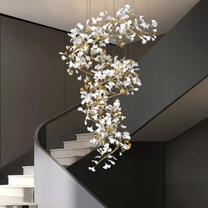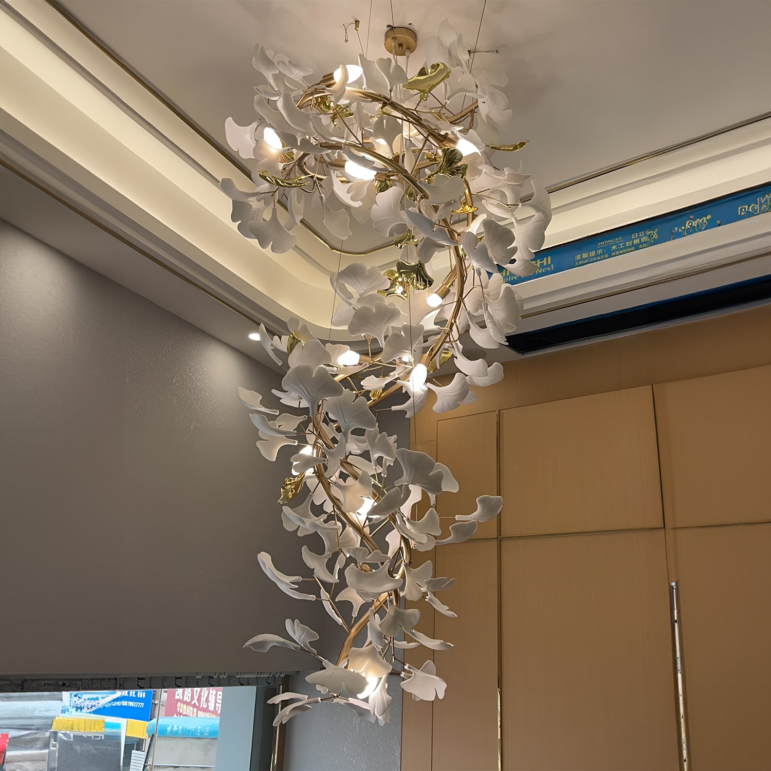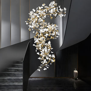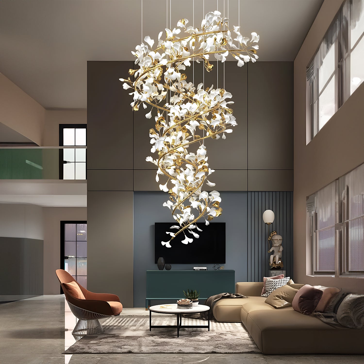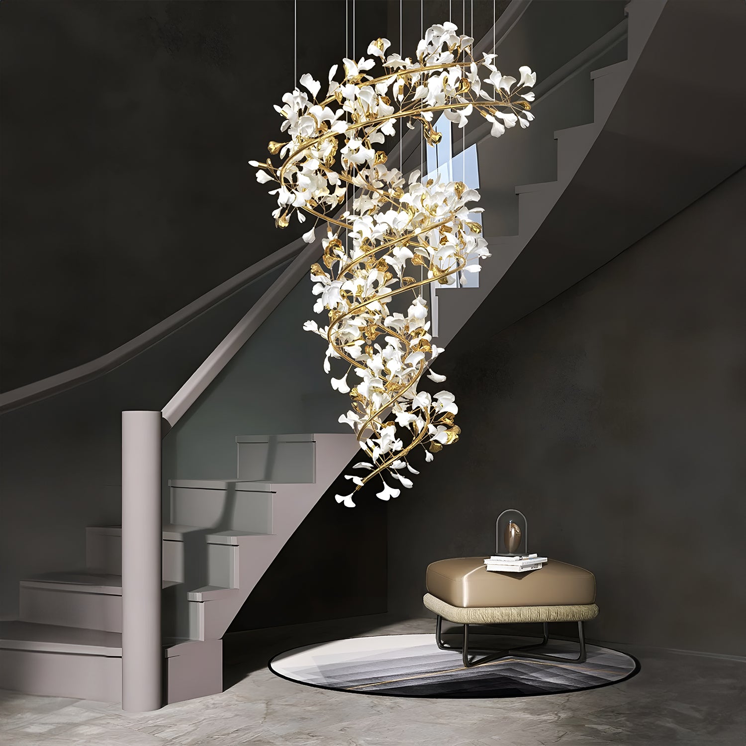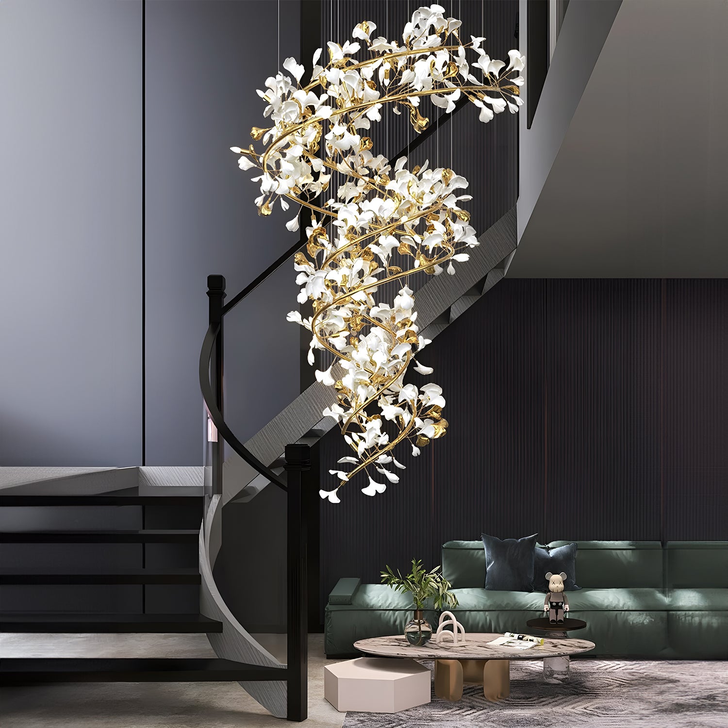 Elevate your space with the enchanting Golden Gingko Spiral Chandelier. Inspired by the delicate beauty of ginkgo leaves, this chandelier features a stunning spiral design that cascades gracefully, creating a captivating focal point in any room. The harmonious blend of white and gold elements adds a touch of elegance and sophistication, making it perfect for luxurious interiors. Illuminate your home with the warm, ambient glow of this exquisite piece and experience the perfect fusion of art and functionality. Ideal for grand foyers, living rooms, or dining areas, the Golden Gingko Spiral Chandelier is a statement of timeless beauty and refined taste.