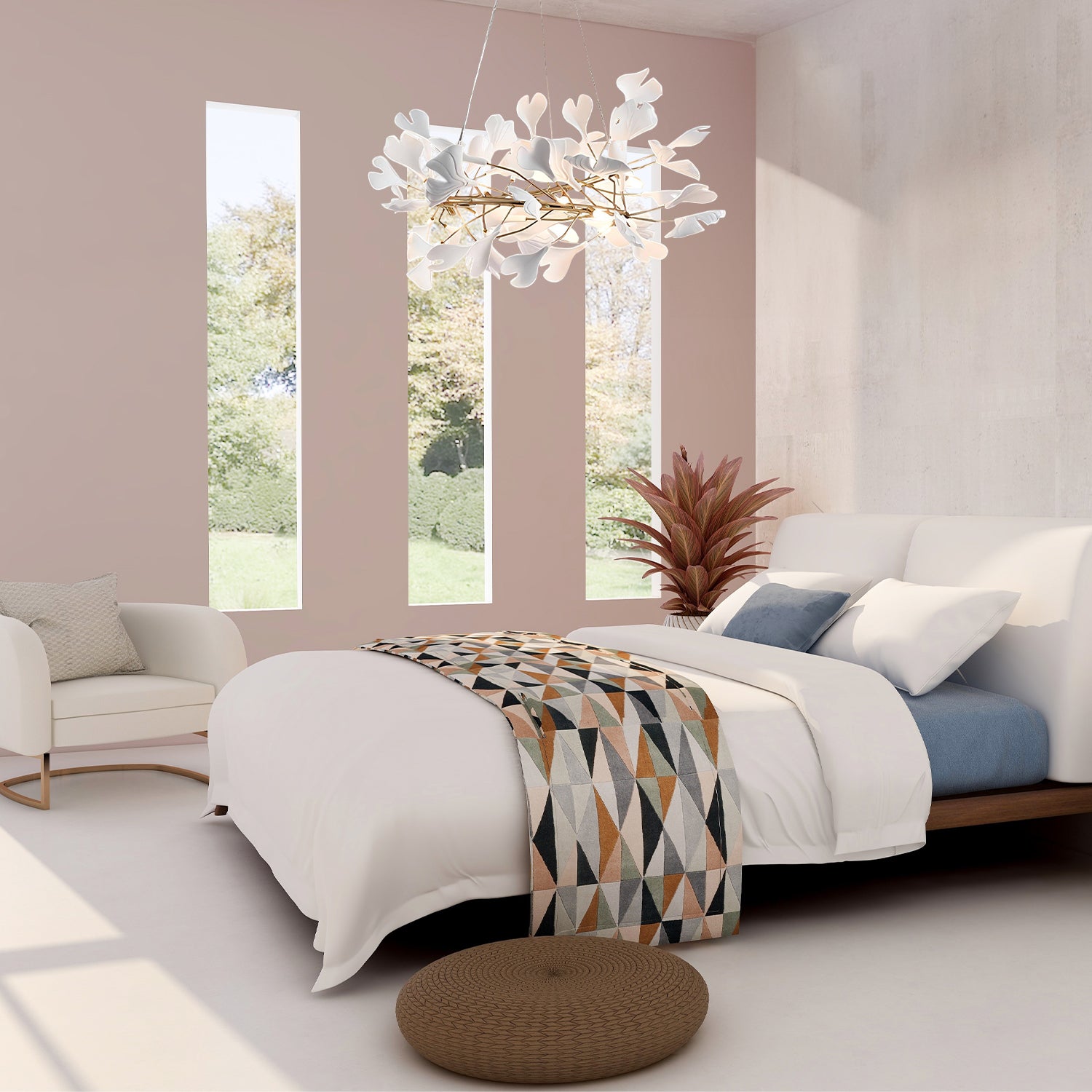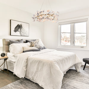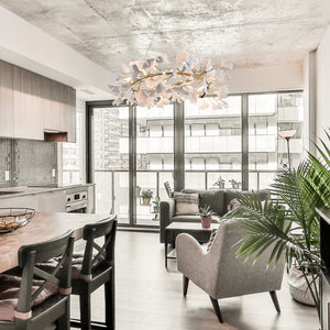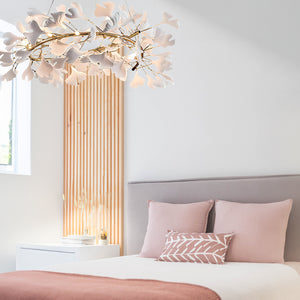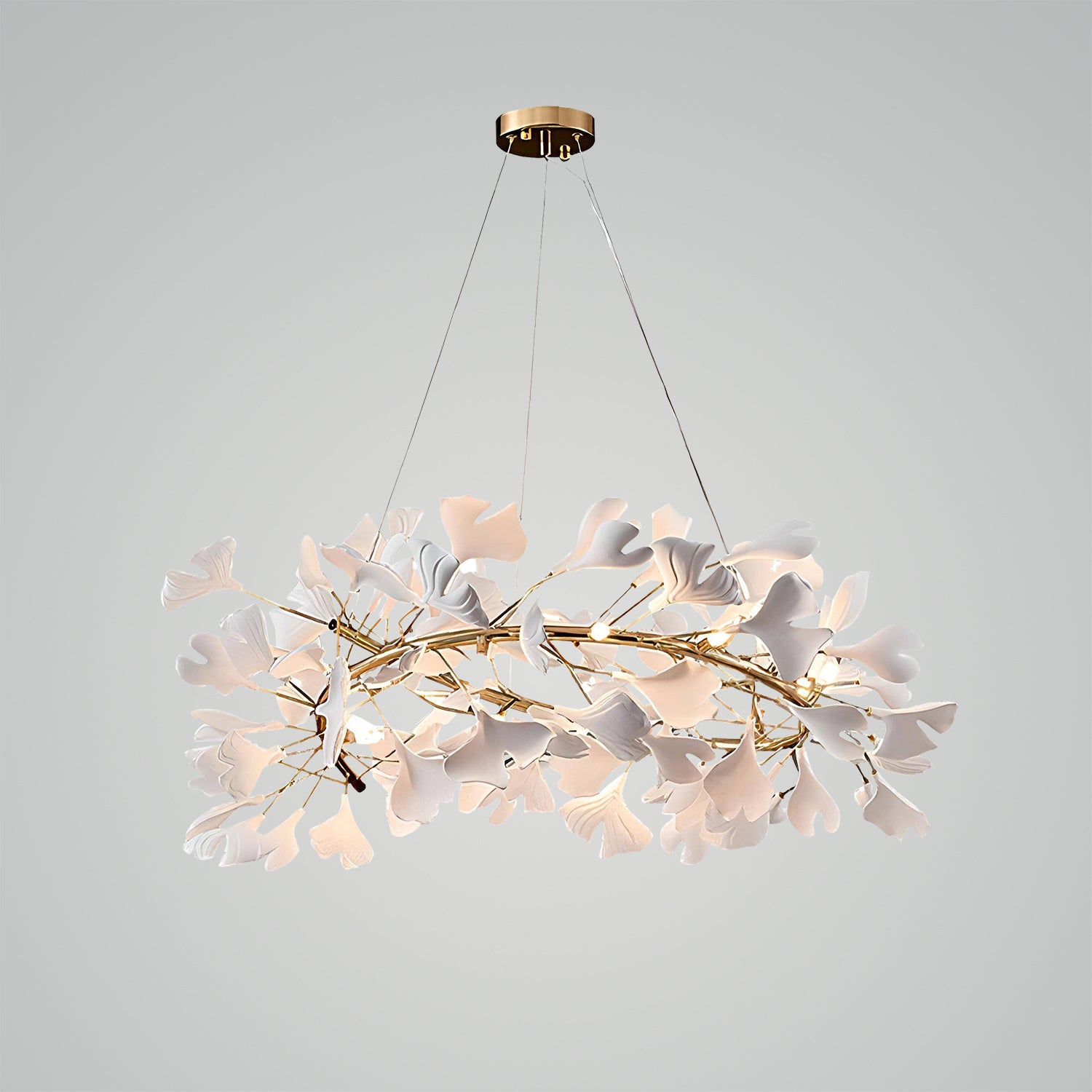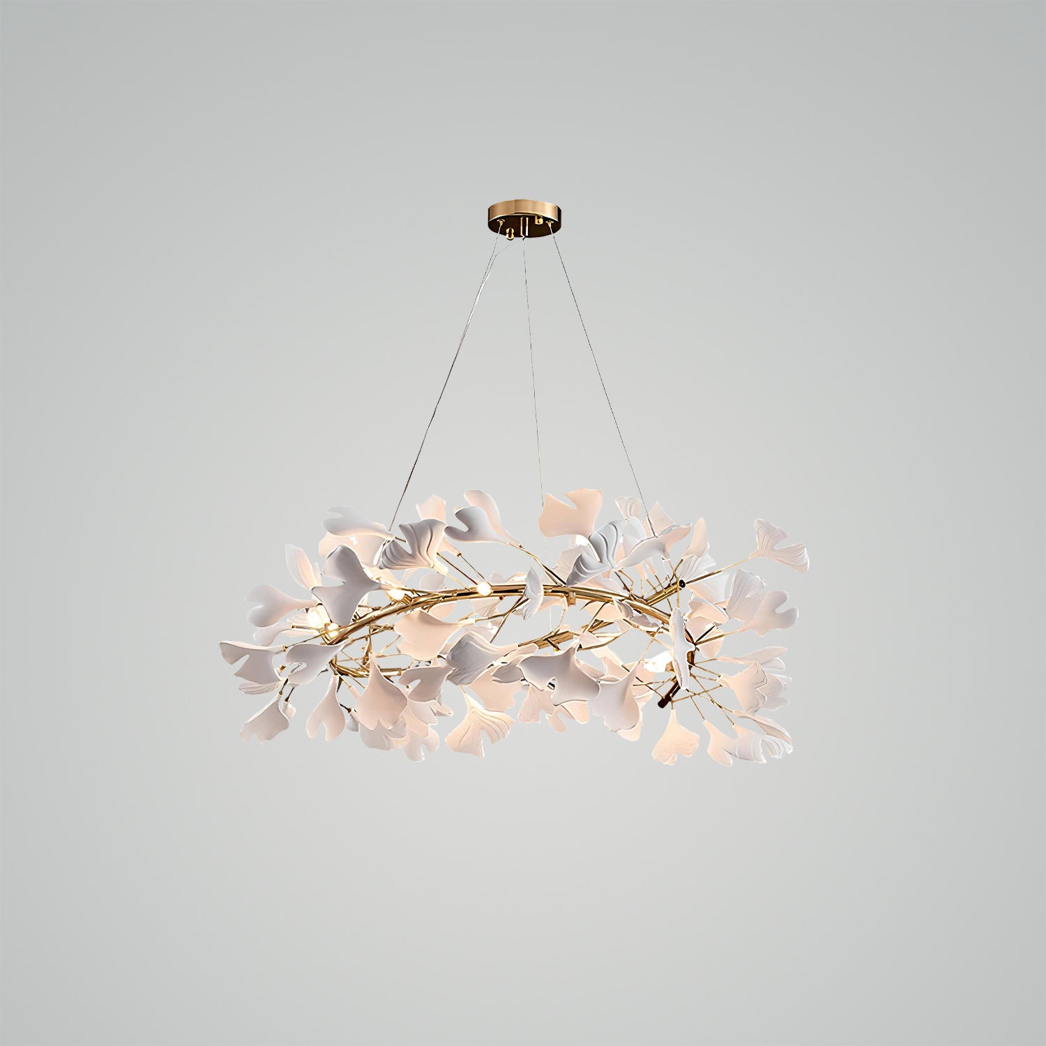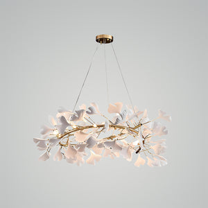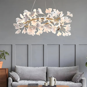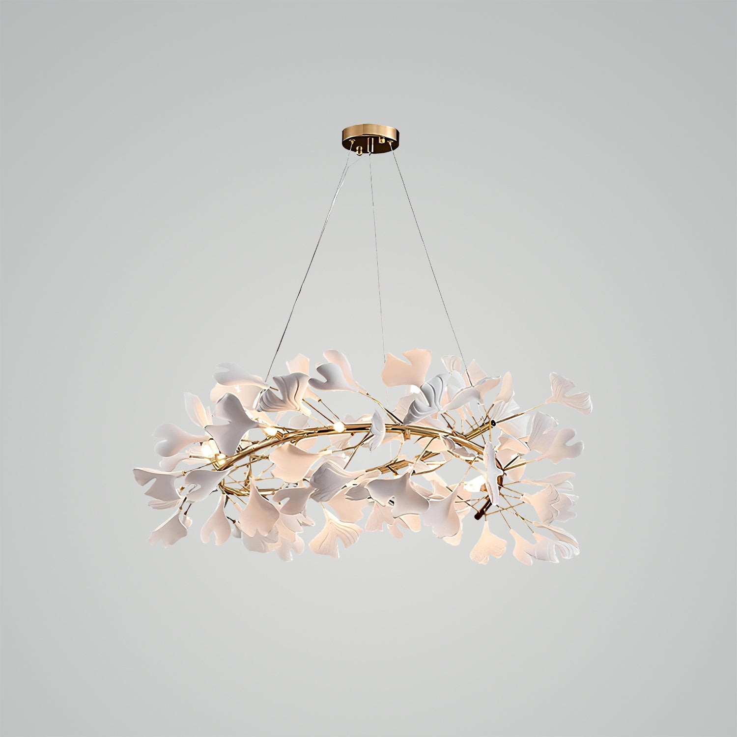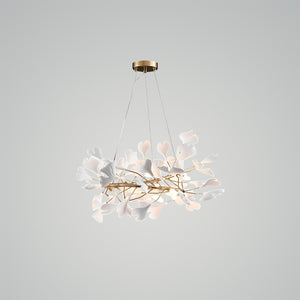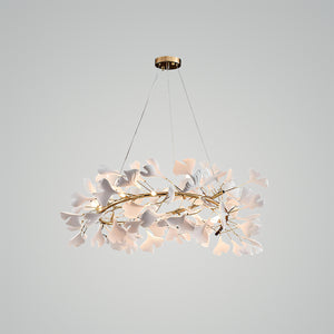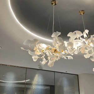 Transform your living space into a serene escape with the 'Gingko Chandelier U'. Designed to mimic the delicate flutter of ginkgo leaves in a gentle breeze, this chandelier is a cascade of creamy ceramic foliage, edged with subtle gold highlights. Each leaf is finely crafted to catch and reflect light, creating a soft, natural glow. This chandelier is a work of art that offers a tranquil, organic ambiance to any room, making it an ideal addition to spaces that crave a touch of nature's elegance.