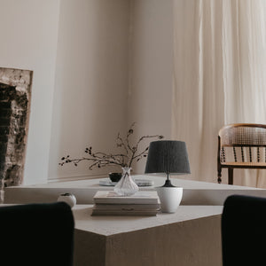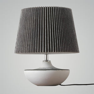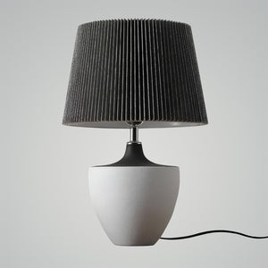 Introducing the 'Ghassan Table Lamp', where the essence of wabi-sabi meets contemporary chic. Crafted with a textured ceramic base that gently tapers into a sleek neck, this lamp is crowned with a richly pleated shade, creating a play of light and shadow that adds depth and warmth to any room. It’s more than a light source; it's a statement piece that celebrates the beauty of imperfection, making it a perfect addition to your home sanctuary.