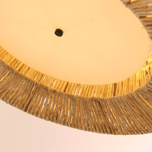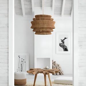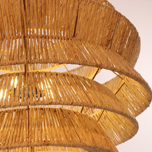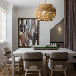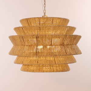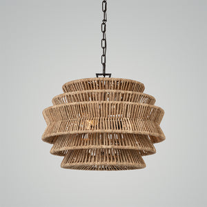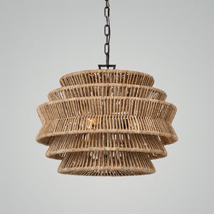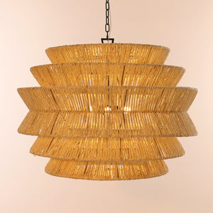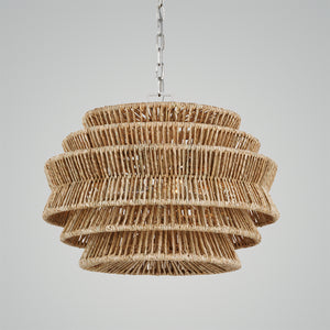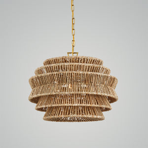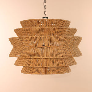 The Antigua Drum Chandelier showcases meticulous craftsmanship and a nature-inspired aesthetic. Its expansive drum-shaped shade features a tiered design and is handcrafted with natural abaca fibers. Multiple LEDs emit a soft glow through the angled frame, creating a light effect reminiscent of sunlight filtering through palm leaves.The organic texture and subtle variations of the abaca add a unique, natural charm to the fixture, making each piece a one-of-a-kind addition to any space. With its damp-rated design, it is resistant to mild moisture, making it an ideal choice for patios and verandas, as well as indoor spaces that call for a touch of natural elegance and sophistication.