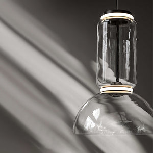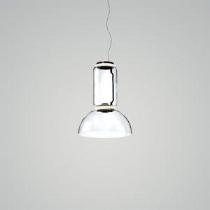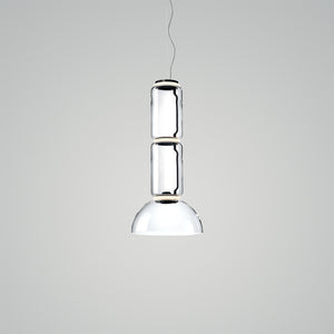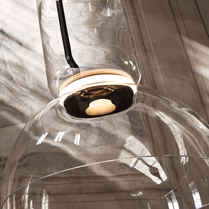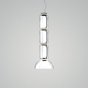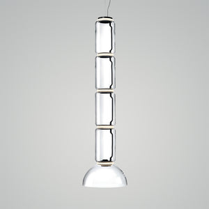 The chandelier is composed of interconnected glass modules, measuring up to 3.2 meters (126.77 inches) in length, with a suspension power cable of 4 meters (157.48 inches). It features cylindrical and hemispherical transparent blown-glass structures, suspended die-cast aluminum ring connectors, hydraulically formed steel internal side arms, and injection-molded opaline silicone outer ring diffusers.