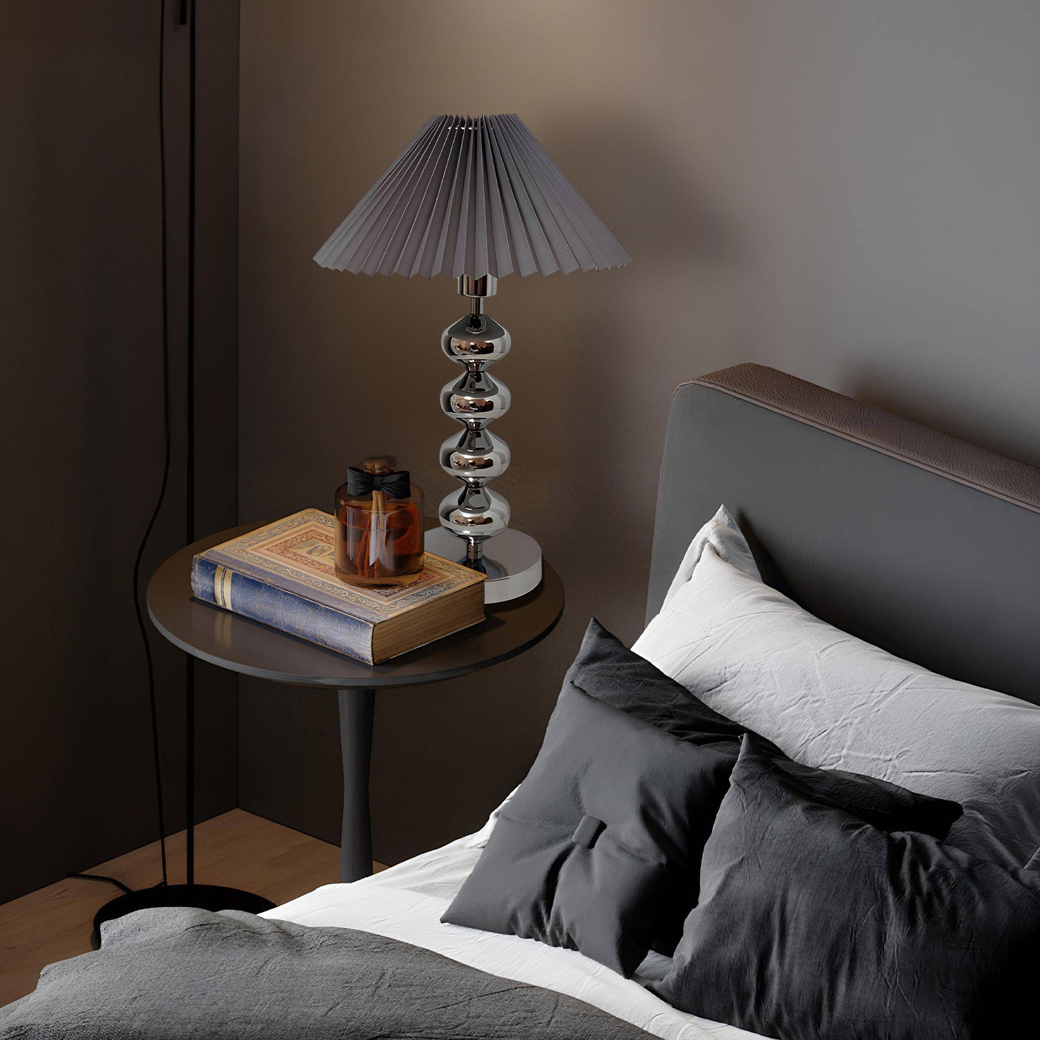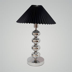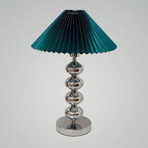 The Aleisha Pleated Table Lamp is a stunning fusion of classic charm and contemporary flair. Its polished chrome base reflects a cascade of light, while the rich emerald pleated shade casts a warm, inviting glow. This lamp is a true statement piece, perfect for adding a touch of sophistication to any room. Whether you're aiming to brighten up a study with a touch of color or add an elegant accessory to your living room, the Emerald Elegance Table Lamp is designed to impress with its stylish silhouette and exquisite craftsmanship.