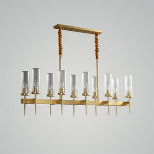The Alouette Chandelier is crafted from solid brass using meticulous hand machining techniques. Its shades feature reeded borosilicate glass, and all components undergo hand polishing and either patination or plating for a refined finish.