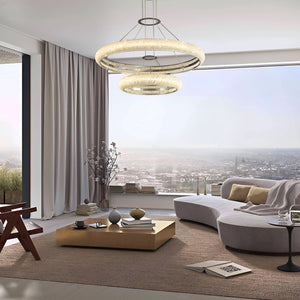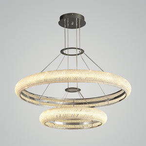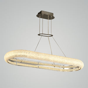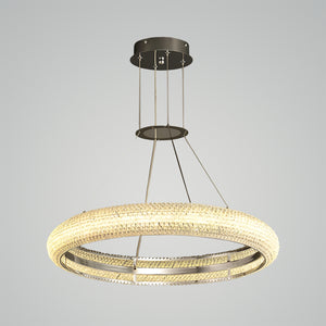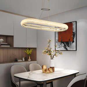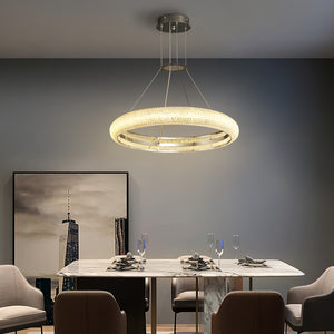 Introducing the "Asscher Ring Chandelier" – a statement of luxury and elegance for your living space. This chandelier features a sleek, circular design imbued with the radiance of pineapple bead crystals, arranged meticulously to capture and refract light in a dazzling display. The single ring of light is suspended in mid-air, supported by slender cables that give the illusion of floating, bringing a touch of gravity-defying magic to your decor. This fixture is designed to not only illuminate but to enhance the ambiance with a warm, sparkling glow that invites a sense of comfort and glamour. Perfect for contemporary homes, upscale lobbies, or high-end retail spaces, the Celestial Halo Crystal Pendant is a beacon of sophisticated lighting design.